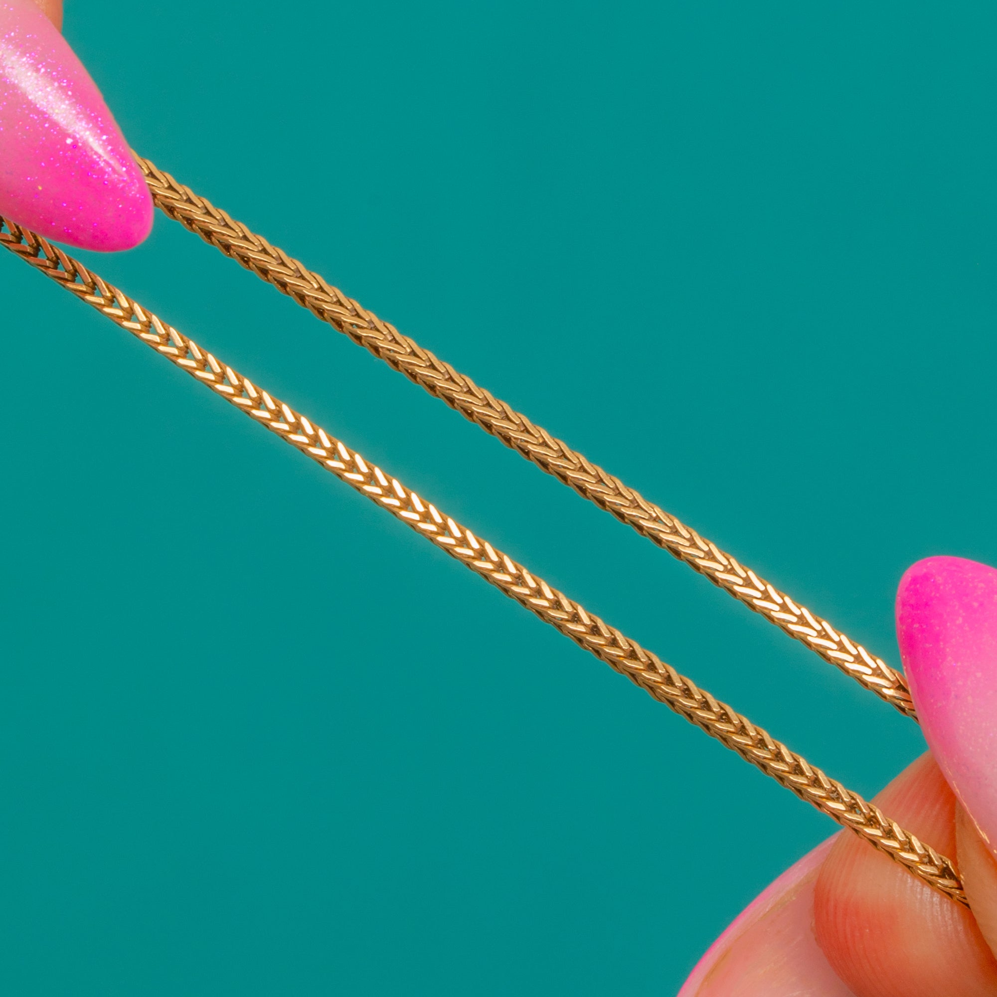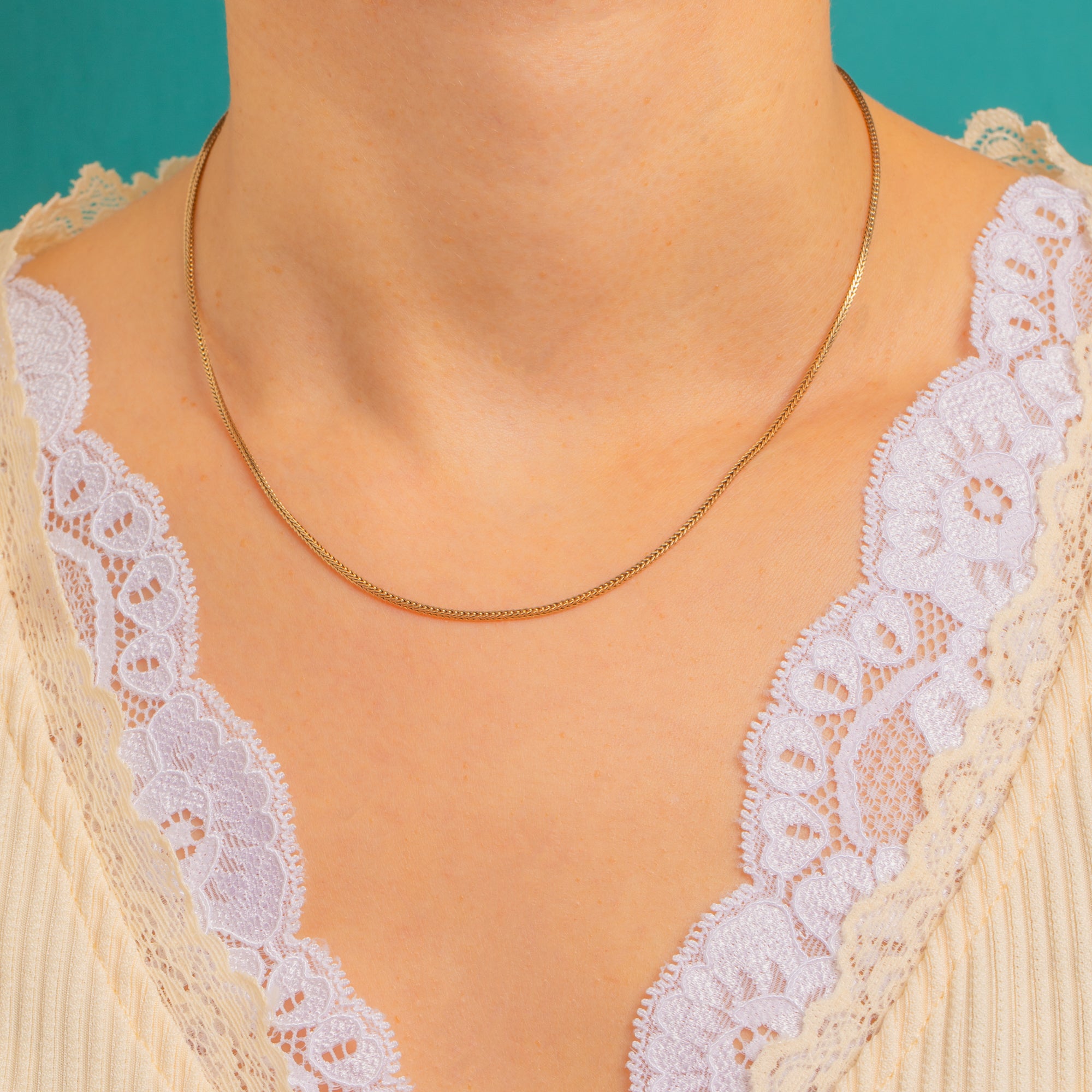 Delicate yet impeccably made, the tightly articulated links create a subtle chevron texture that catches the light with every movement. At a neat 15-inch length, it’s the perfect minimalist staple—wear it solo for a refined finish or layer it with your favourites.