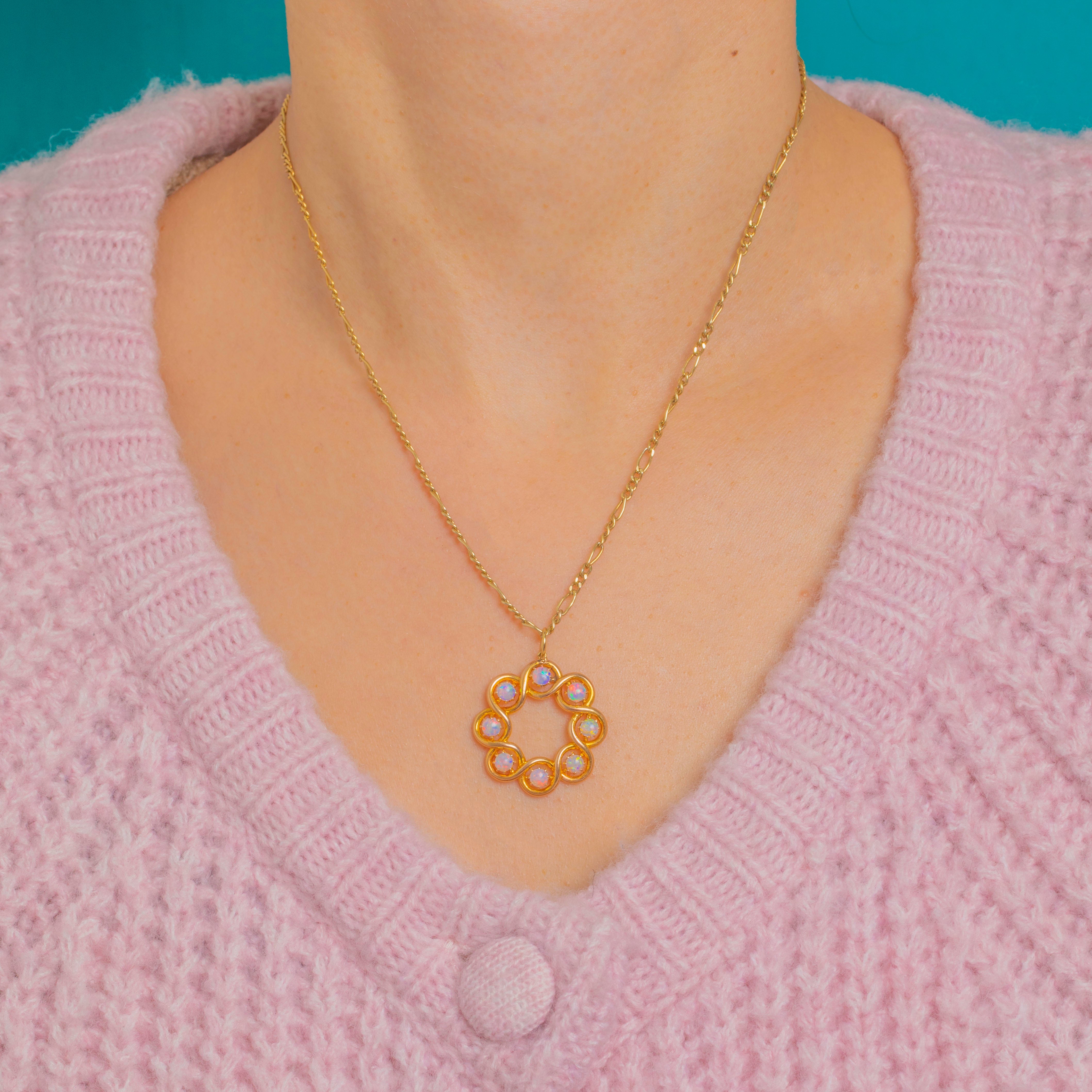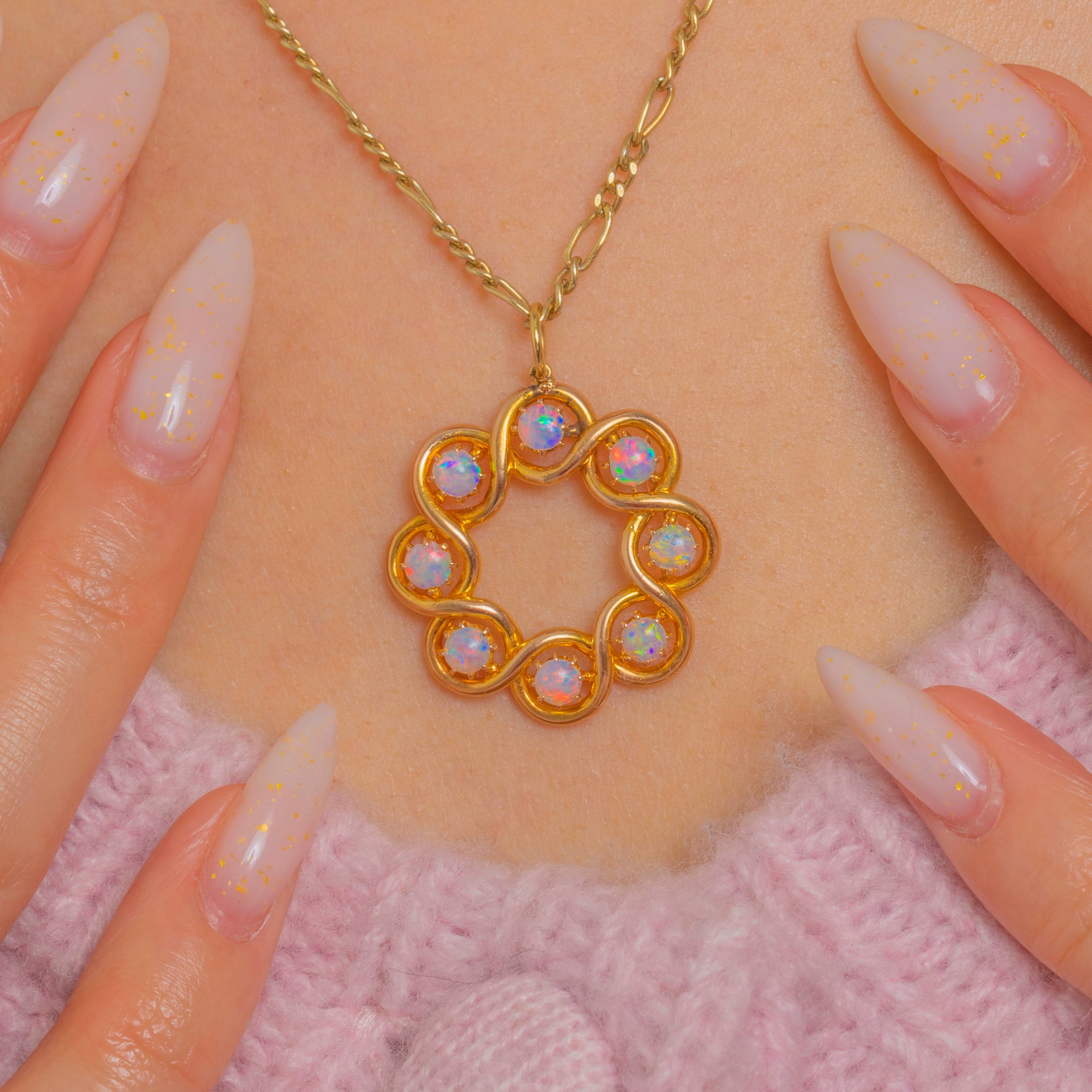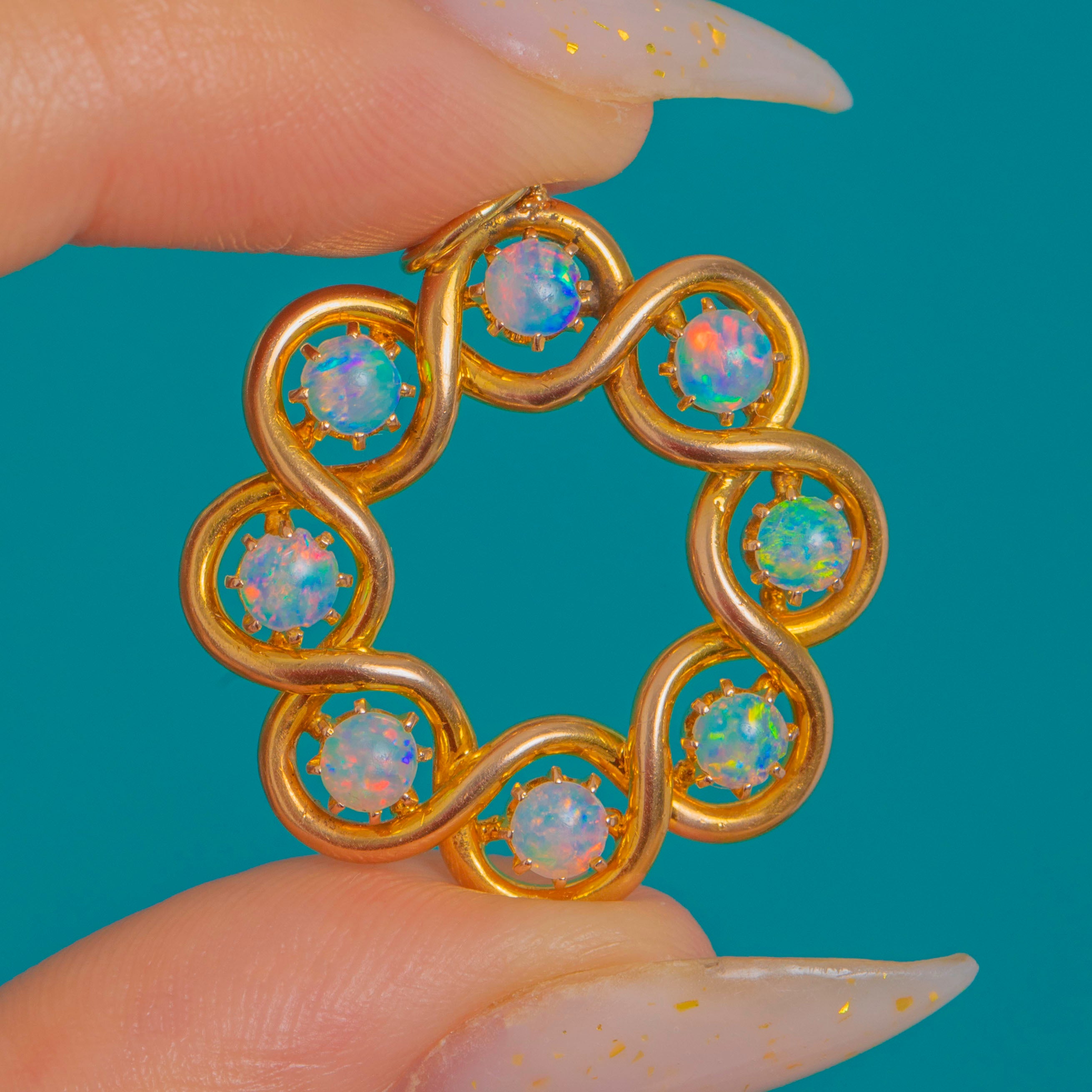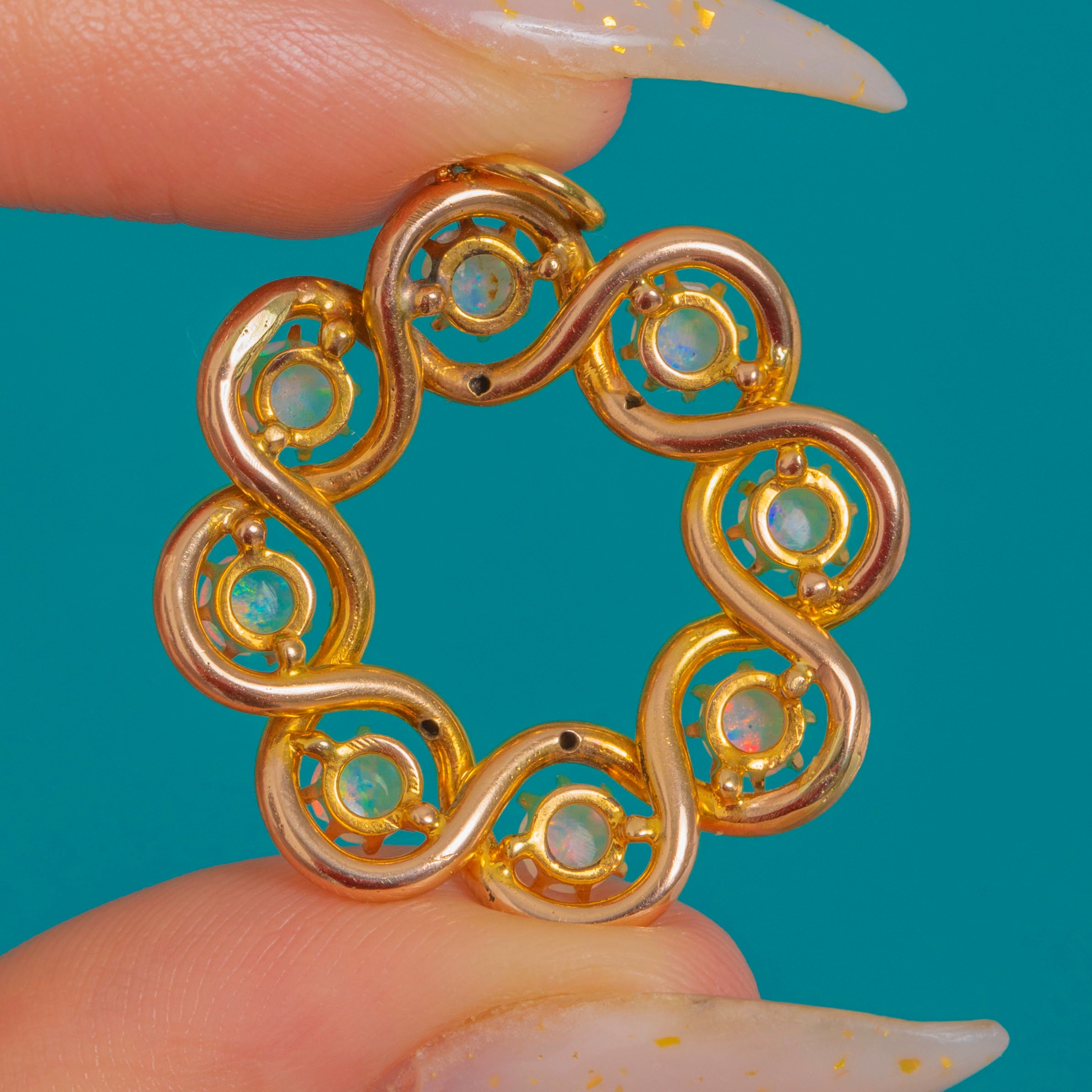 A delicate Victorian Opal roundel pendant crafted in glowing 15ct Gold. Formed as a graceful open wreath, a fluid Gold ribbon curves into eight perfectly spaced collets, each set with a round cabochon Opal that shimmers with blue, green and pink flashes.
