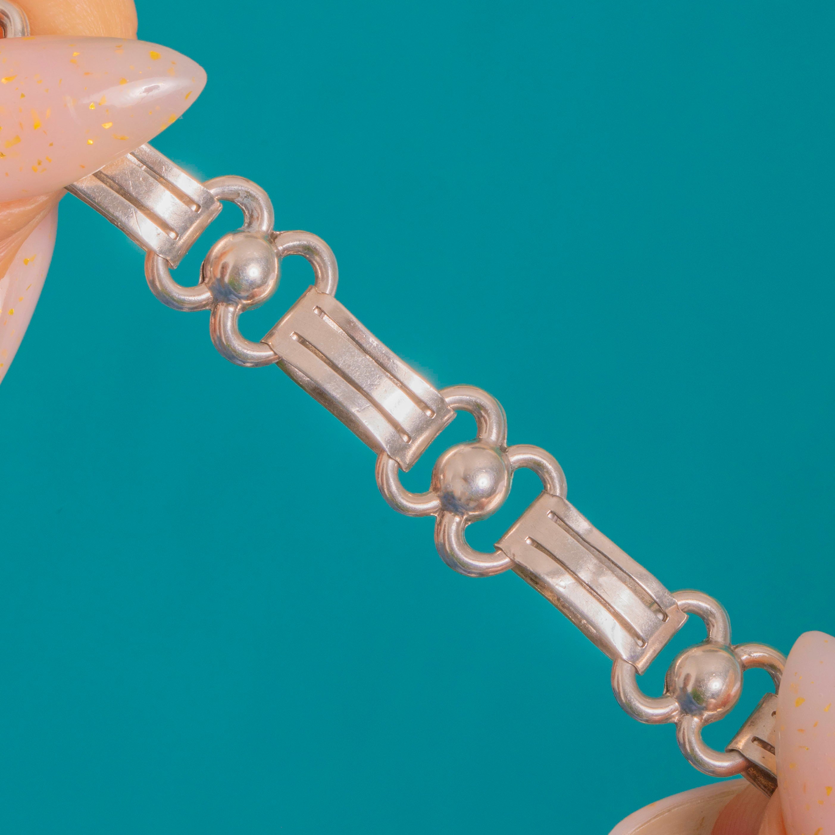 EXCELLENT: The Silver has a bright polish with only light surface wear and a pleasing, even patina in the recesses. The articulated links align and move smoothly, and the bolt ring clasp is secure and in good working order.