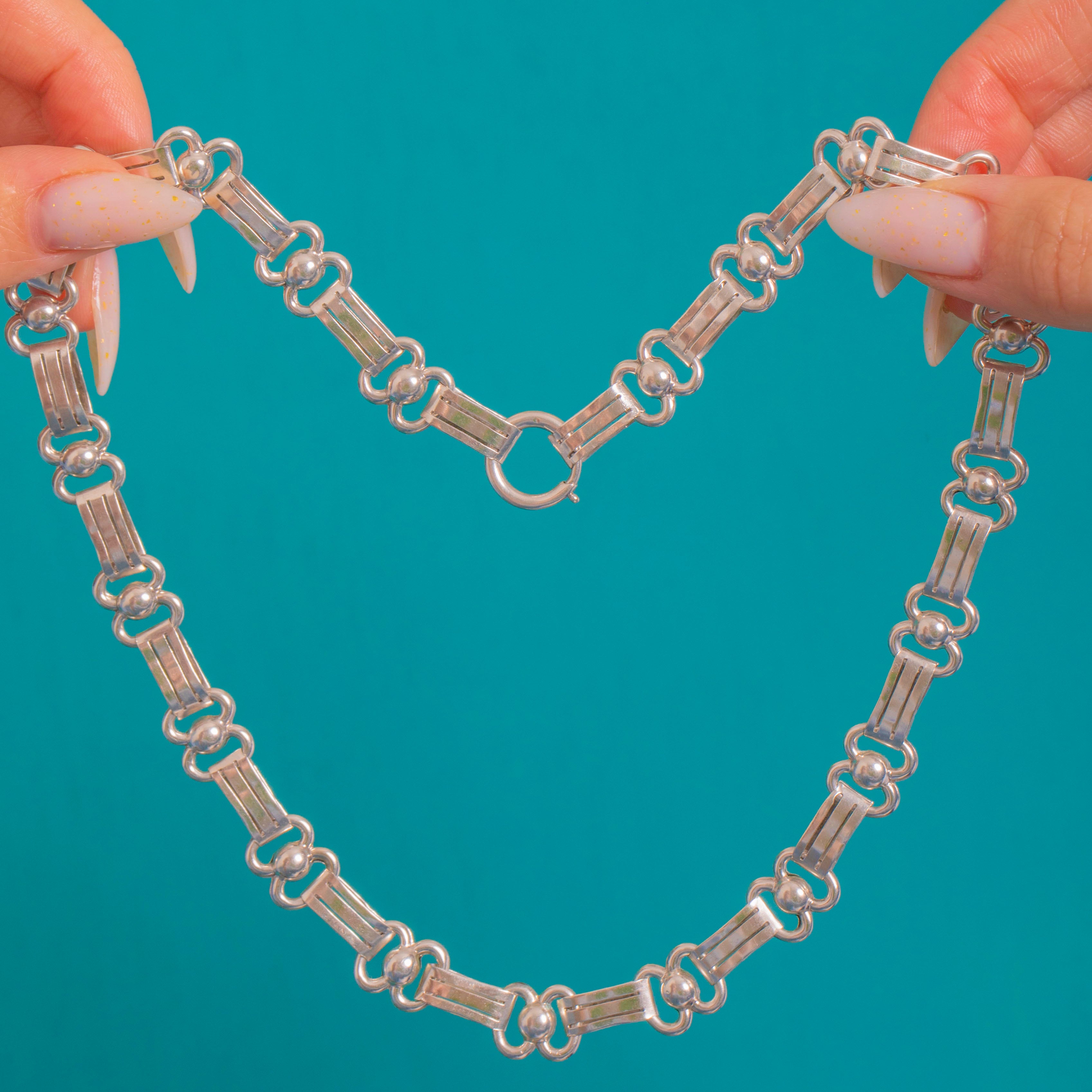 A classic Victorian Silver book chain with crisp rectangular bar panels alternating with softly rounded connectors, subtly punctuated by domed bead details. Fully articulated, it drapes beautifully around the neckline with that refined, architectural presence collectors adore.