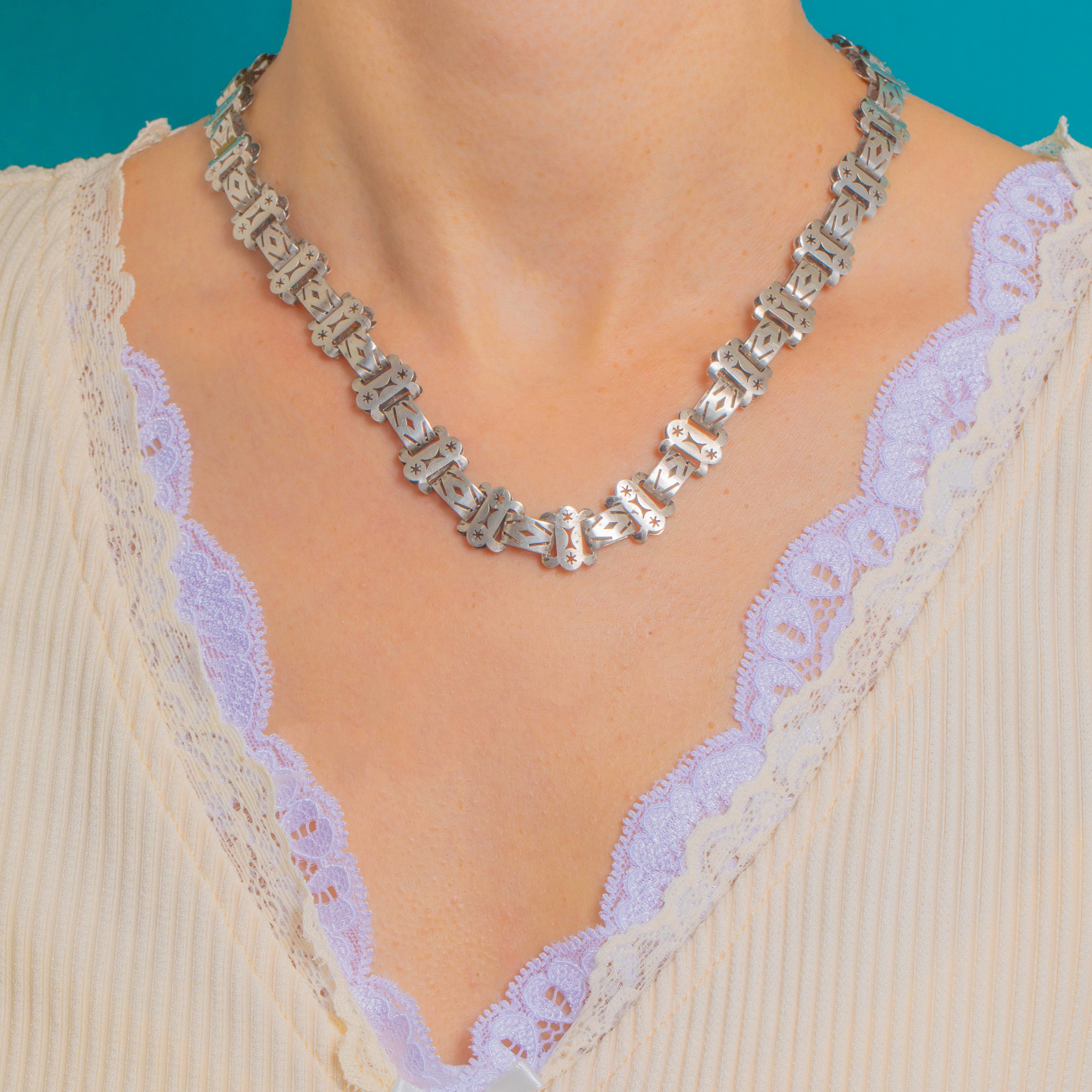 This Victorian book-chain collar is a striking study in geometry and craftsmanship. Formed from articulated links with scalloped ends, it’s intricately pierced with eight-point stars and detailed with crisp chevrons and lozenges, creating that bold, structured “book chain” look we adore.