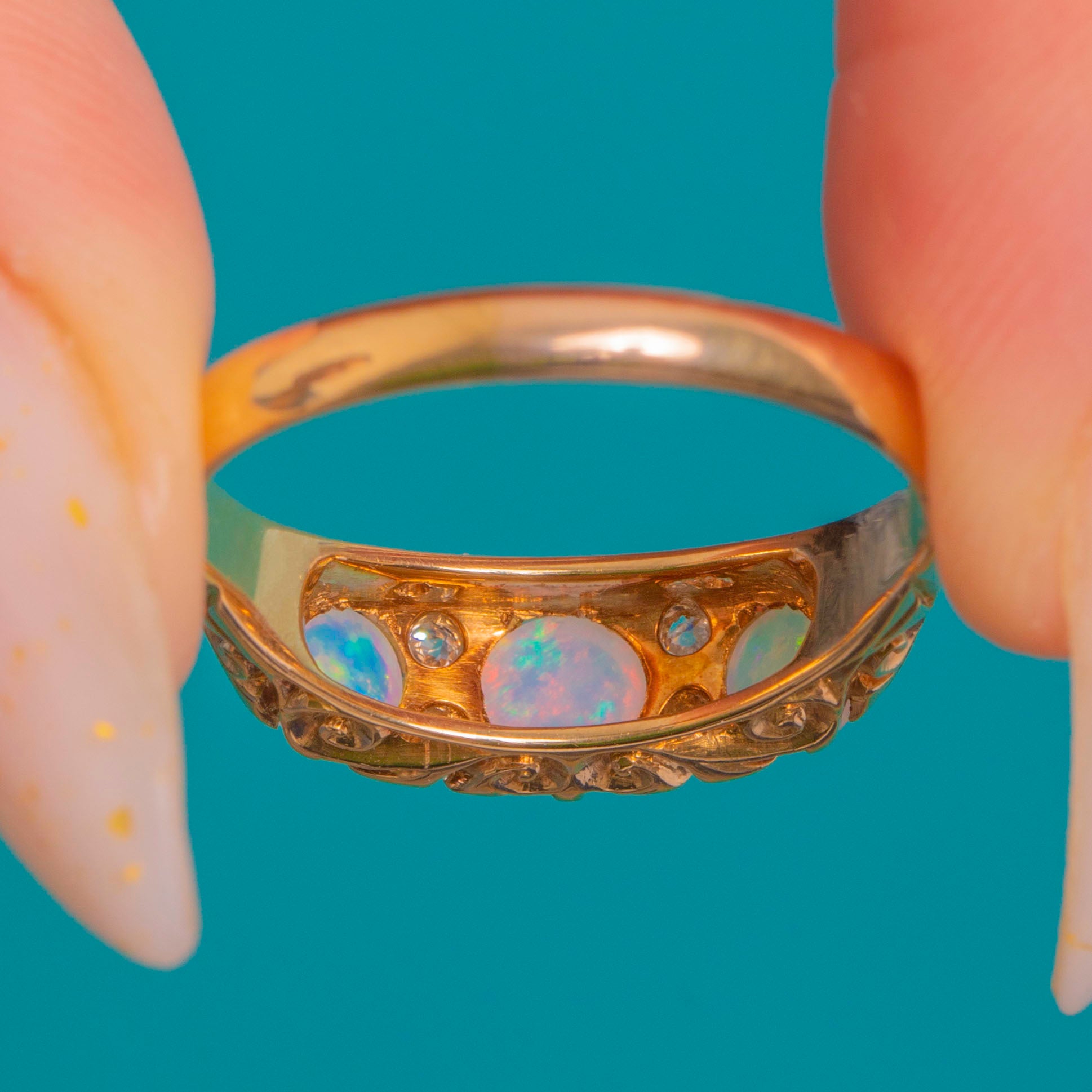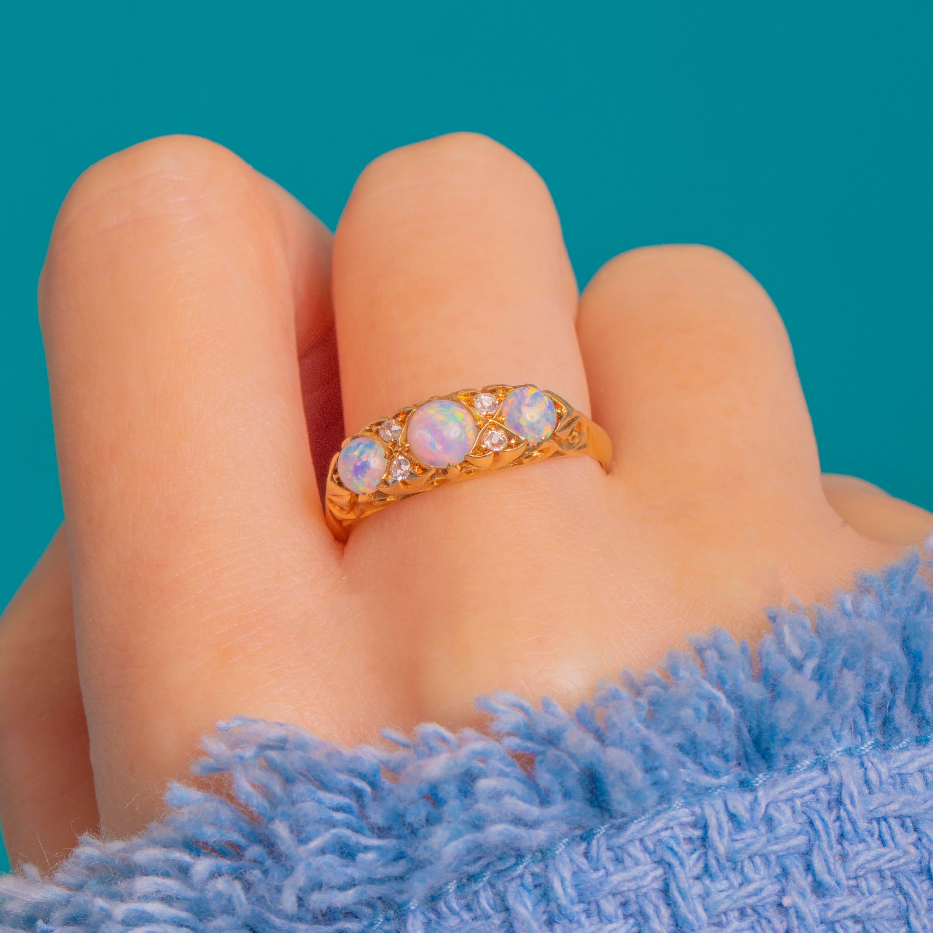 EXCELLENT: Opals are bright with lively play-of-colour and the Diamonds are crisp, with no obvious chips or abrasions. The carved settings and pierced gallery remain sharp and well defined. The shank shows only light surface wear and fine scratches consistent with age, with no visible resizing or repairs; settings are secure.