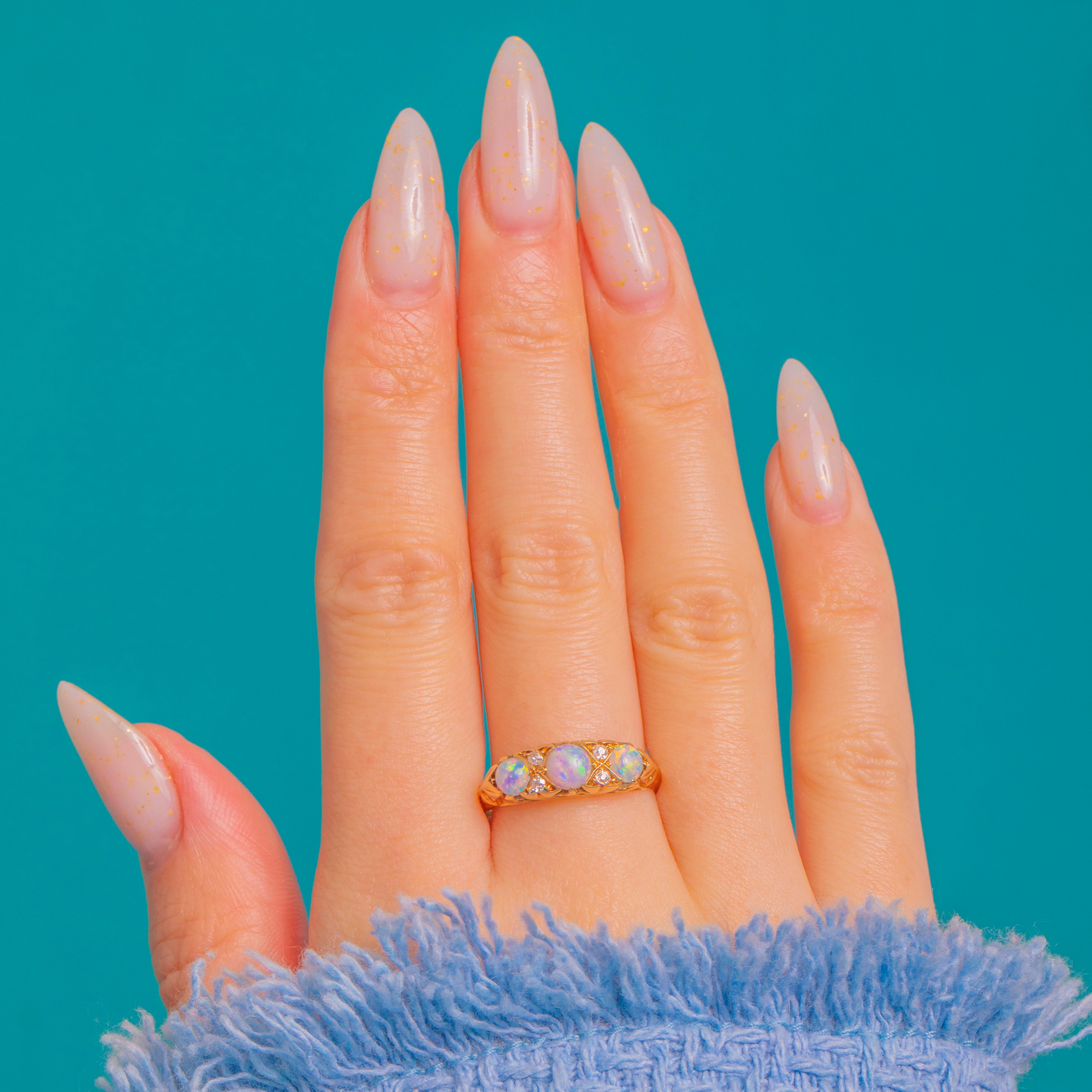 A deliciously pretty Victorian three-stone ring, crafted in rich 18ct Gold and set with three graduated Opal cabochons that glow with pink, green and blue play-of-colour. Delicate Diamond spacers punctuate each Opal, adding a bright sparkle that beautifully complements the Opals’ ethereal sheen.