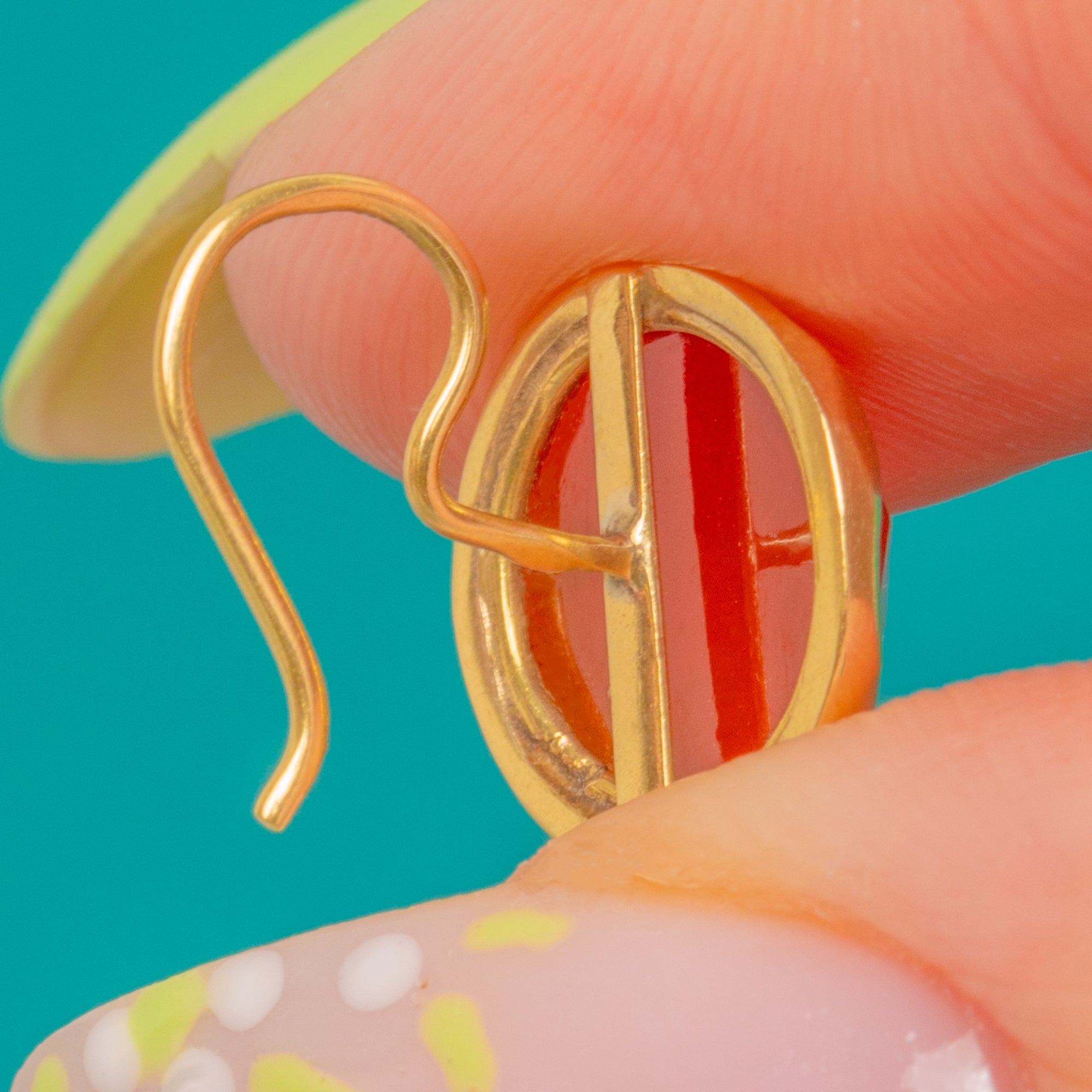 EXCELLENT: Carnelians are bright and lively with crisp facets and no eye-visible chips or abrasions. Gold settings and hooks are smooth and well-preserved with only light surface wear consistent with age. No signs of repair; stones are secure and ready to wear.