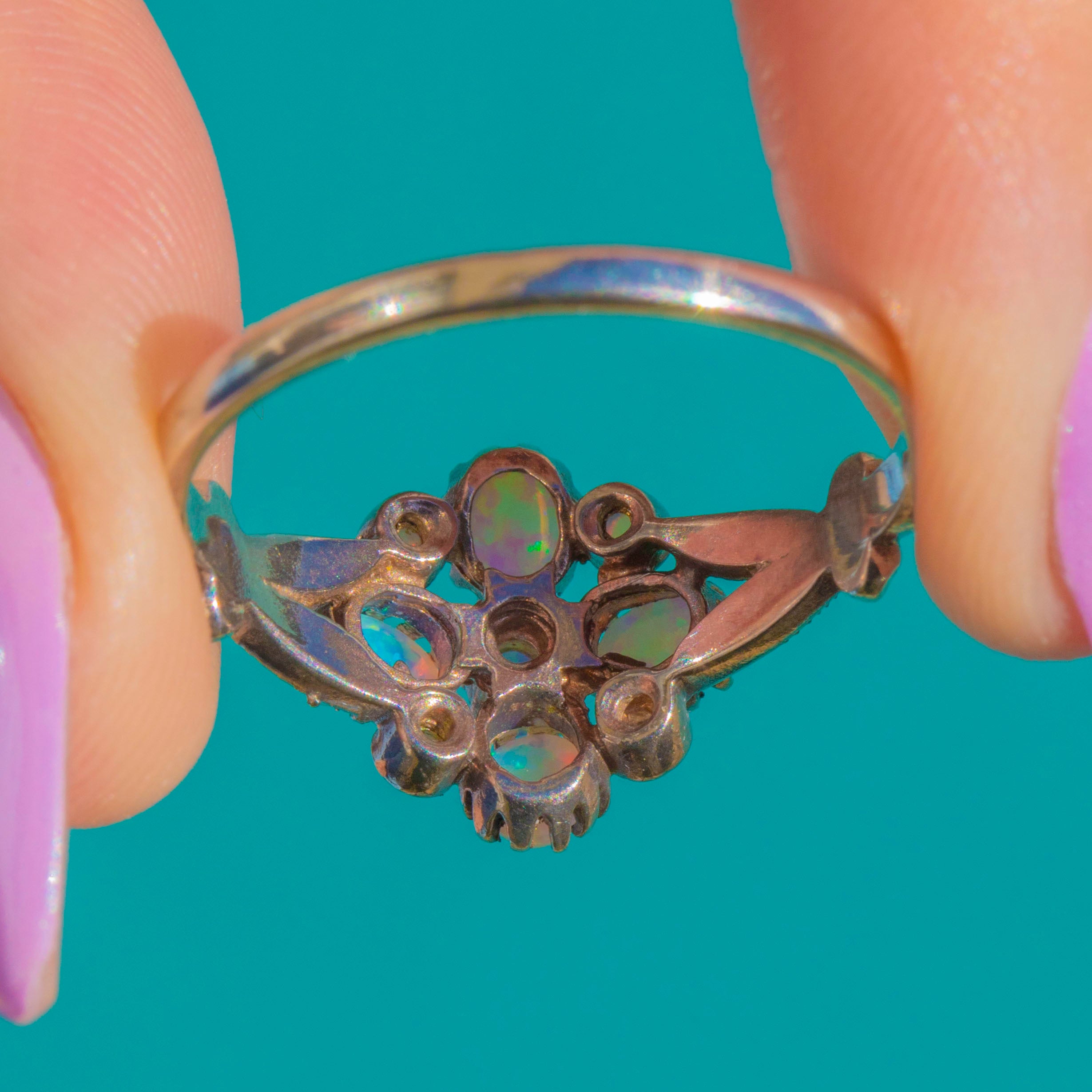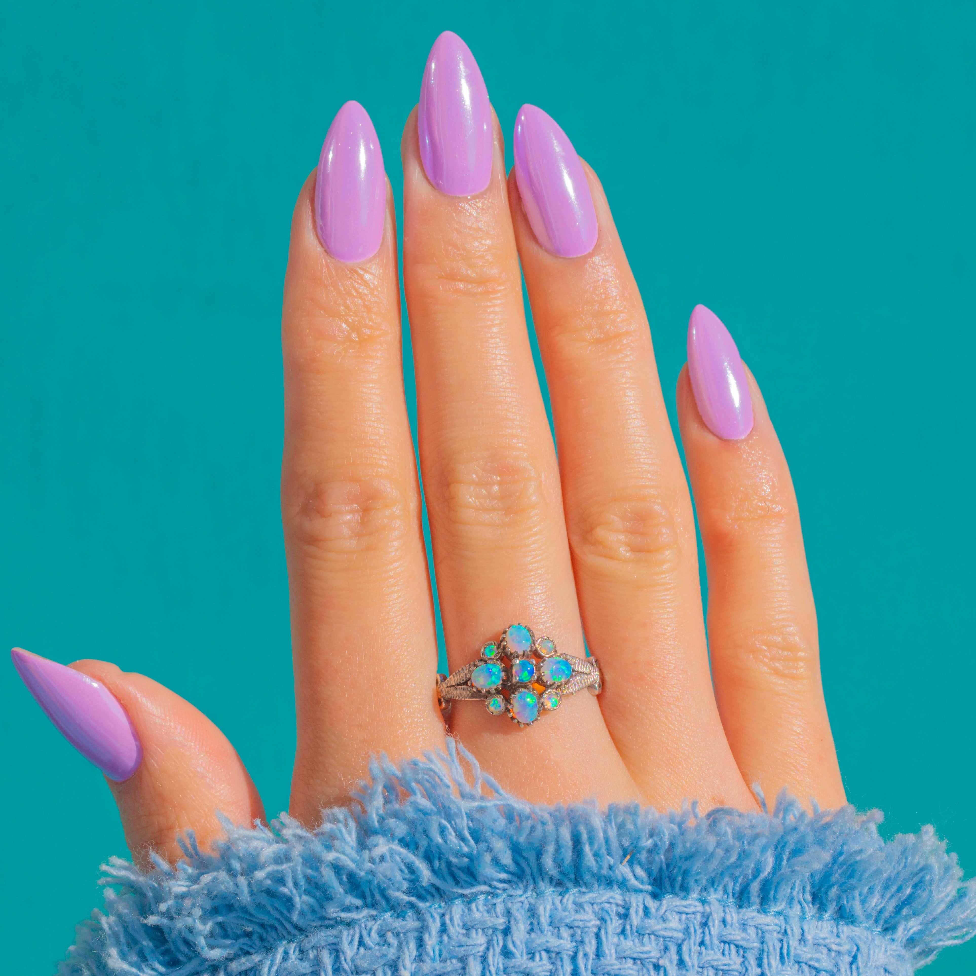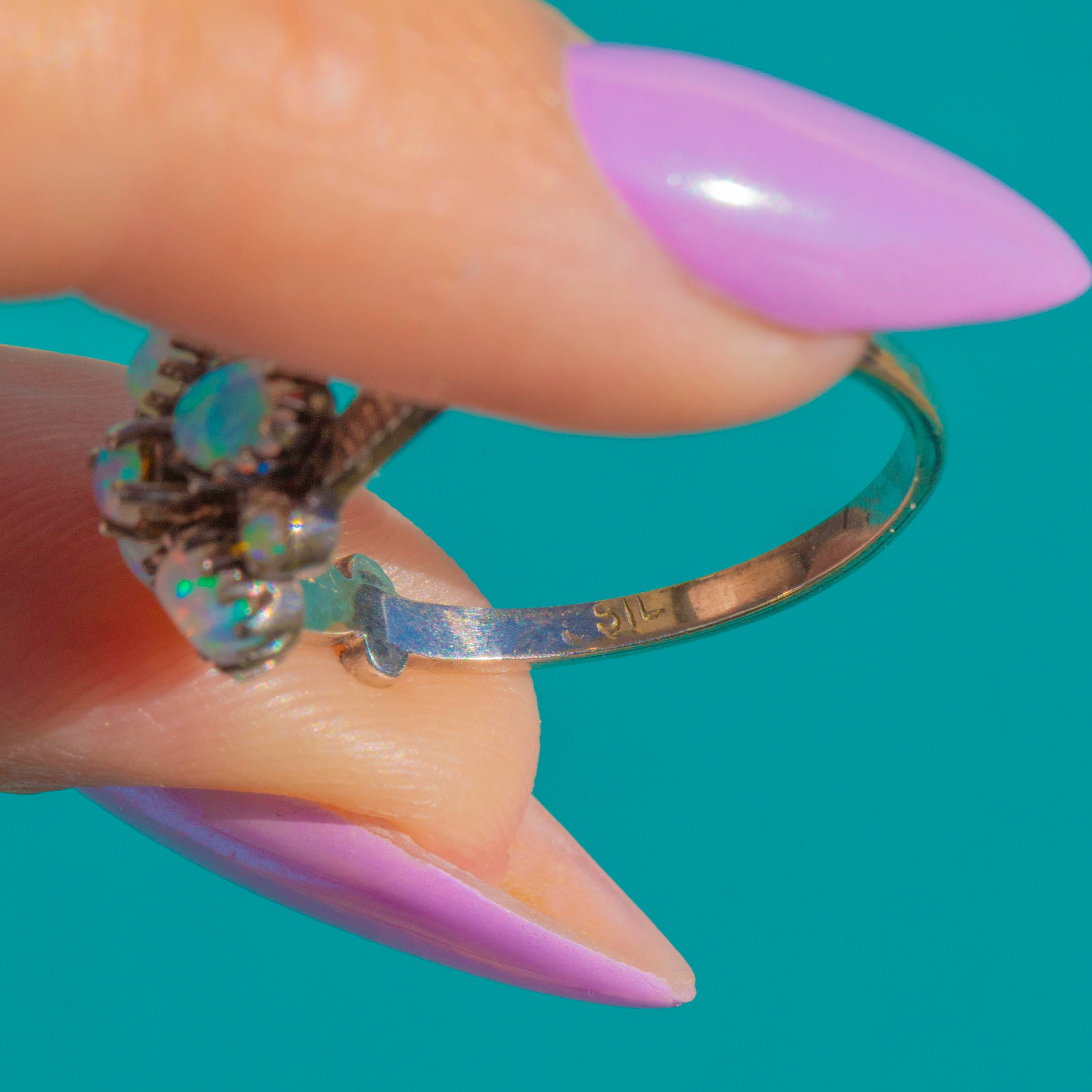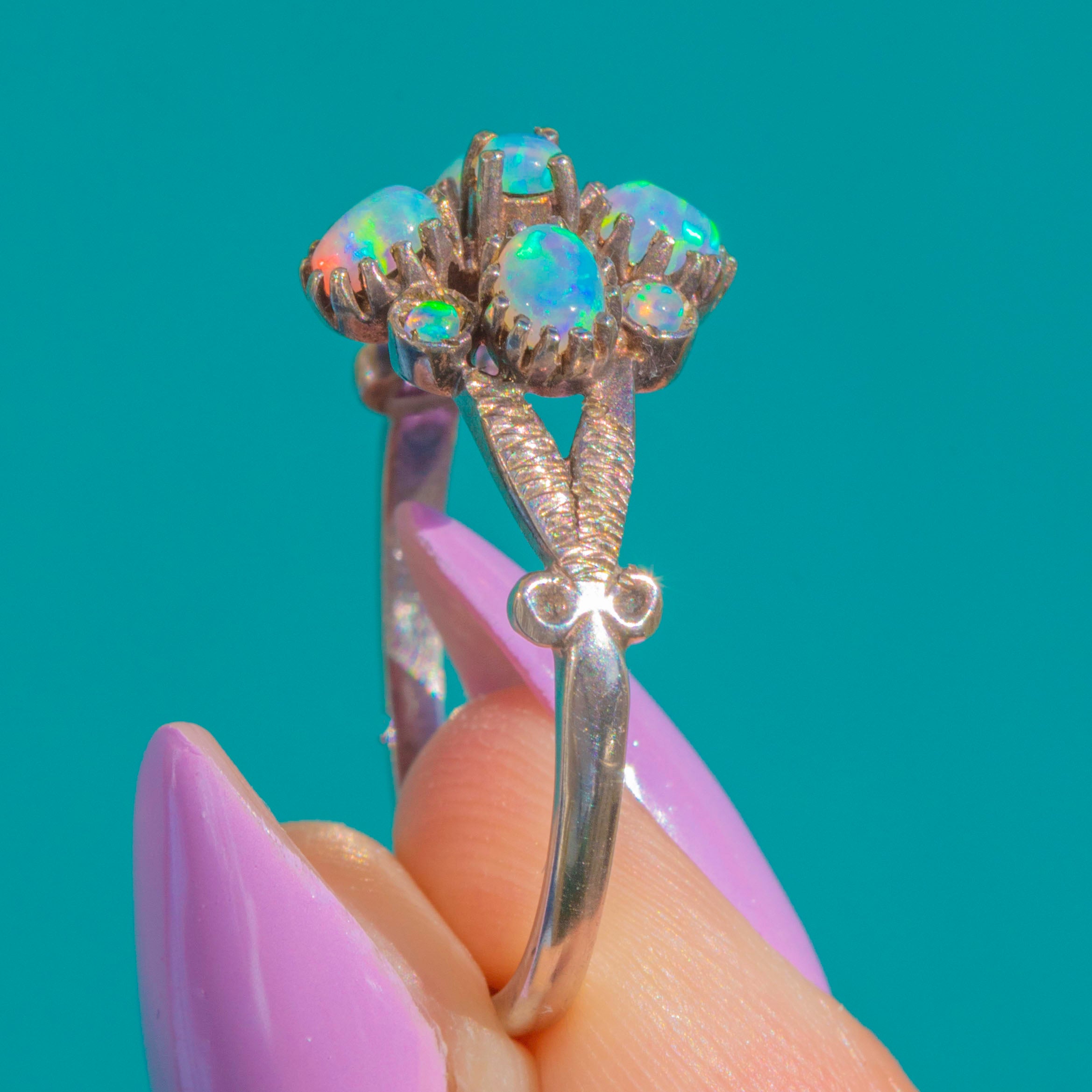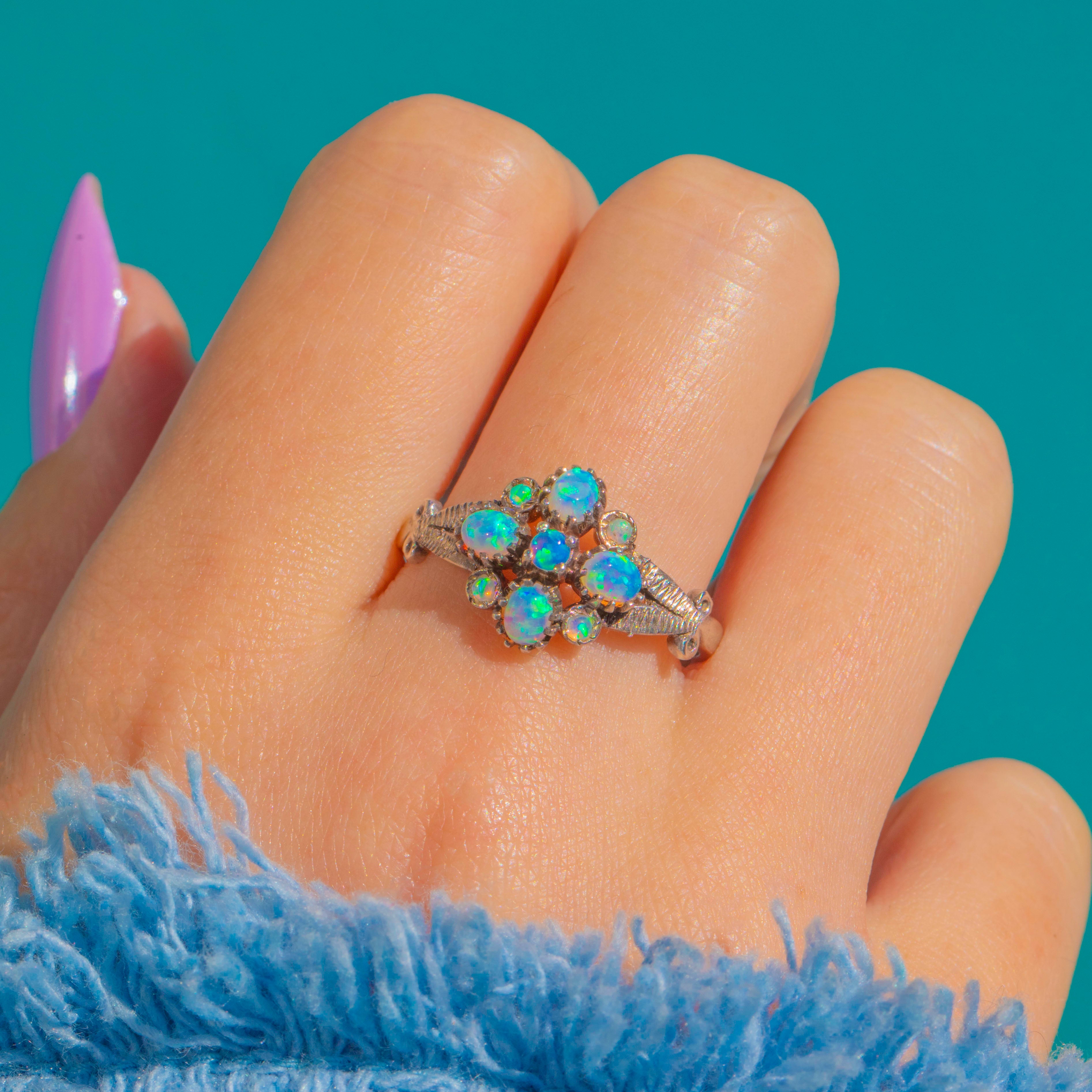This shimmering vintage Opal ring is an elegant bloom in Silver. A nine-stone arrangement—one central round Opal framed by four oval and four petite round Opals—creates a harmonious floral silhouette. Each cabochon dances with vivid blue-green play-of-colour, punctuated by delicate flashes of pink, yellow and purple as they move in the light.