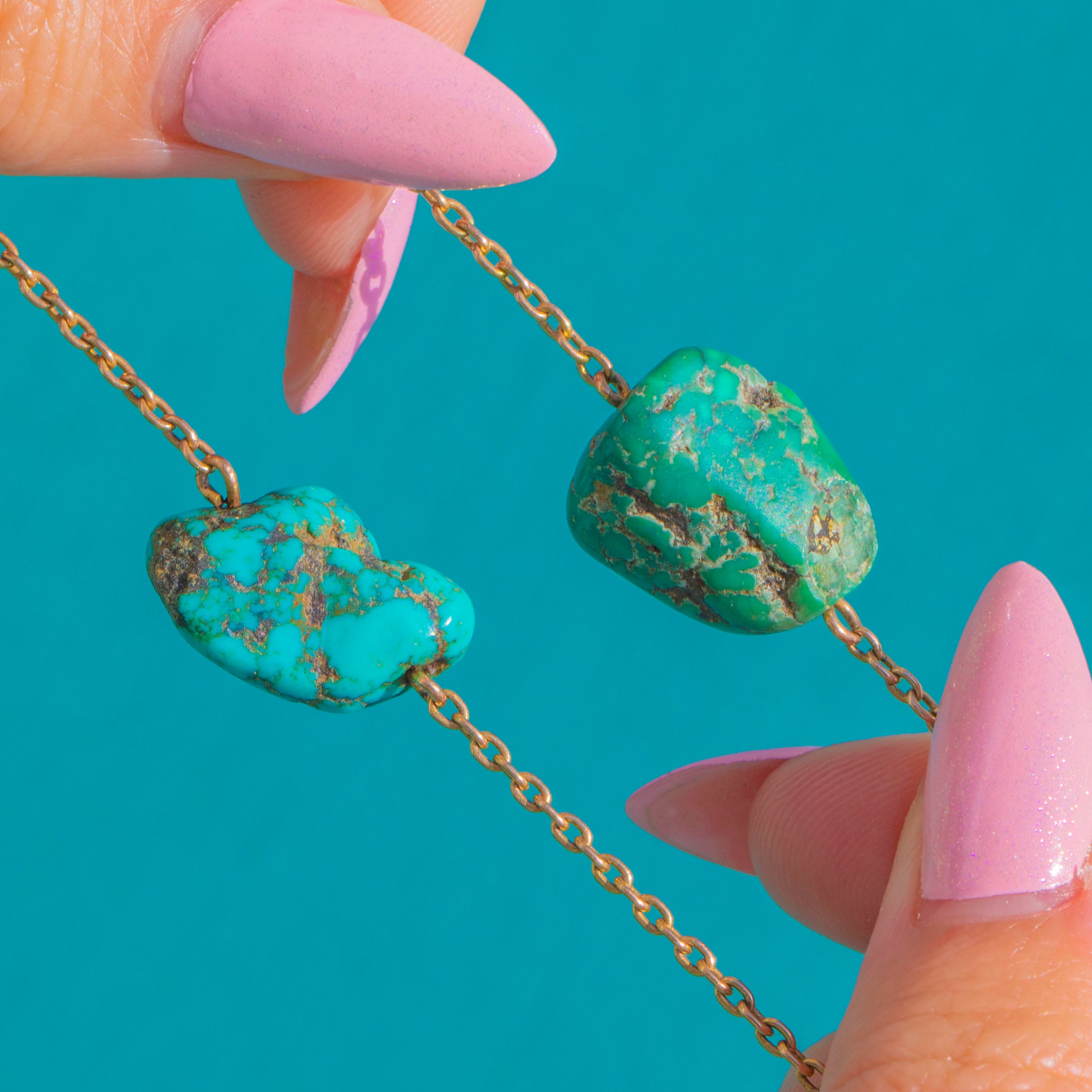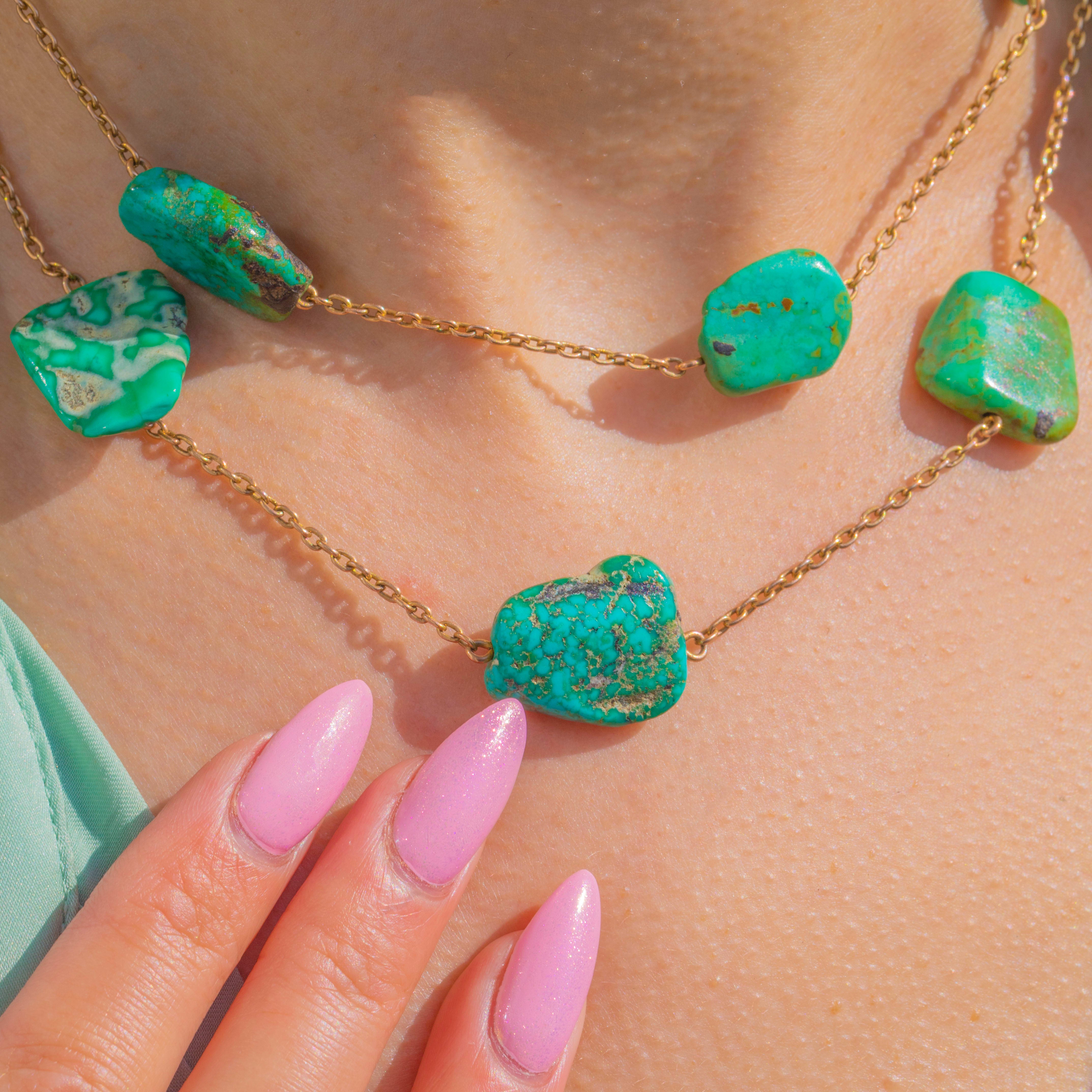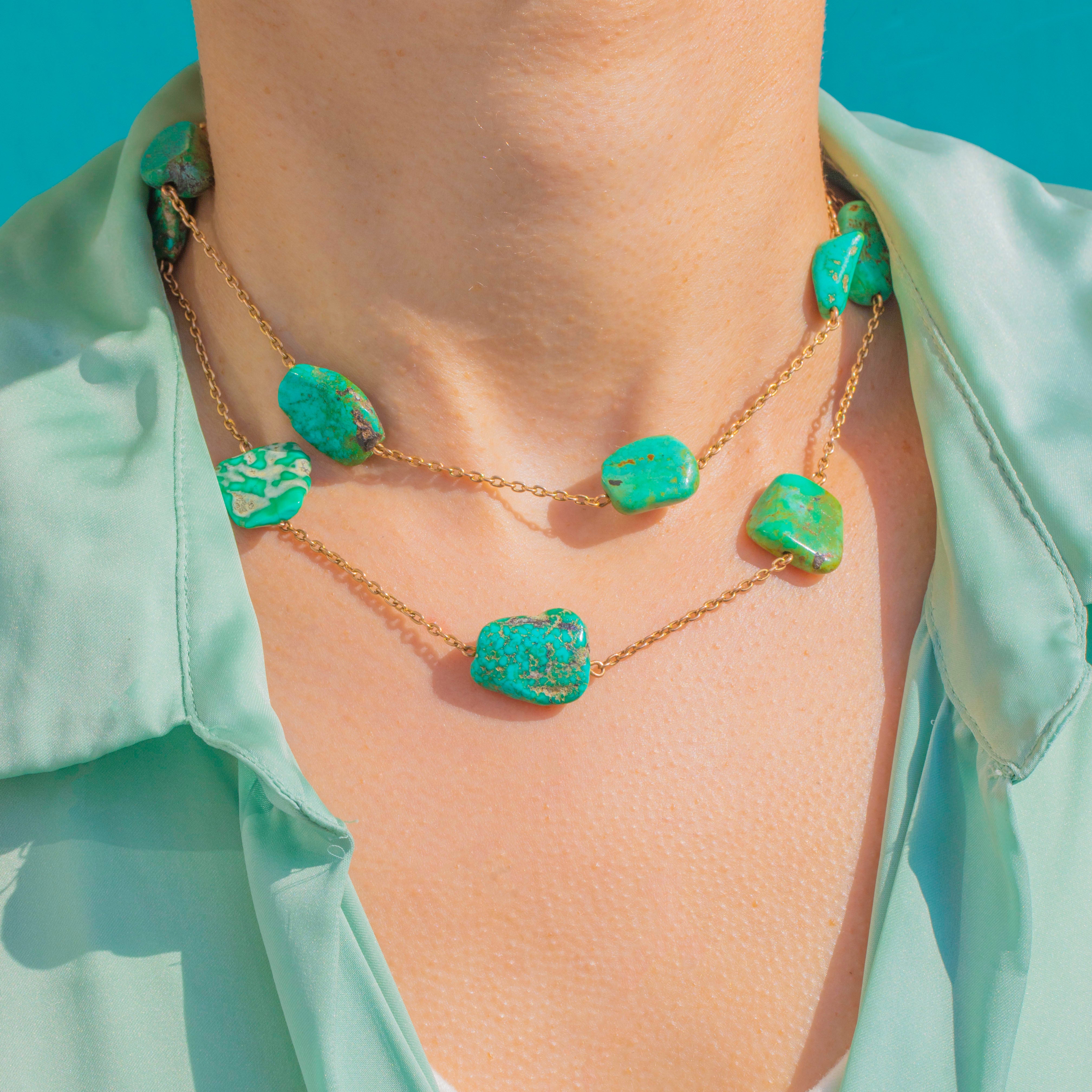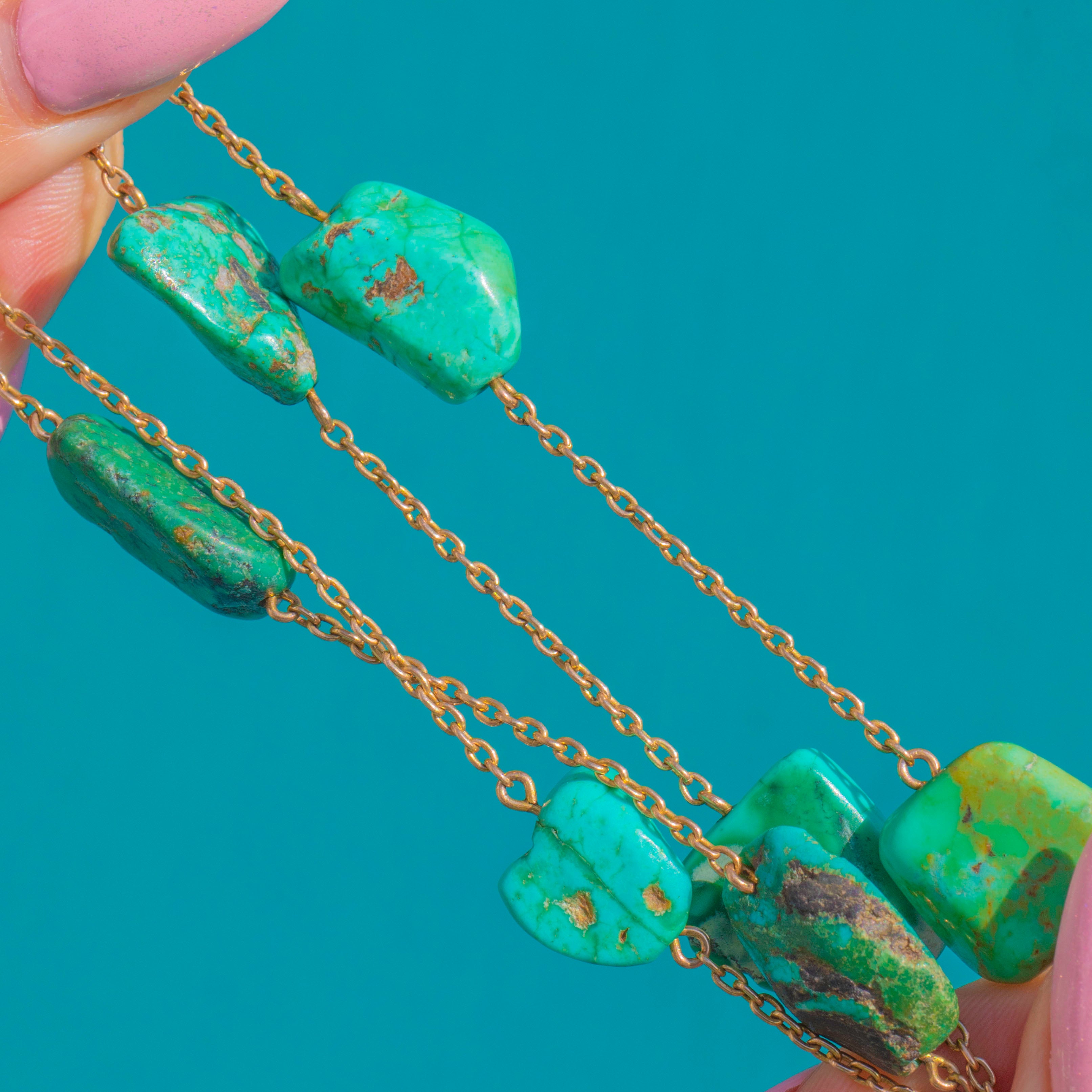 Glowing with character and colour, this antique 9ct Gold Turquoise necklace is pure joy to wear. An array of natural Turquoise stones showcases unique patterns and hues from cool mint to deep forest green, their beautiful matrix giving the piece an organic, earthy allure. The warm glow of 9ct Gold provides the perfect counterpoint, lending sophistication and effortless elegance.