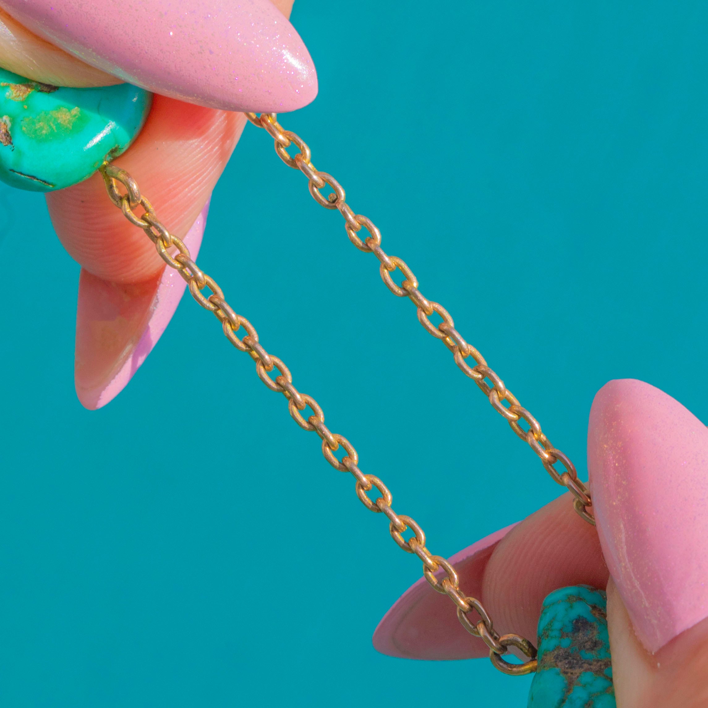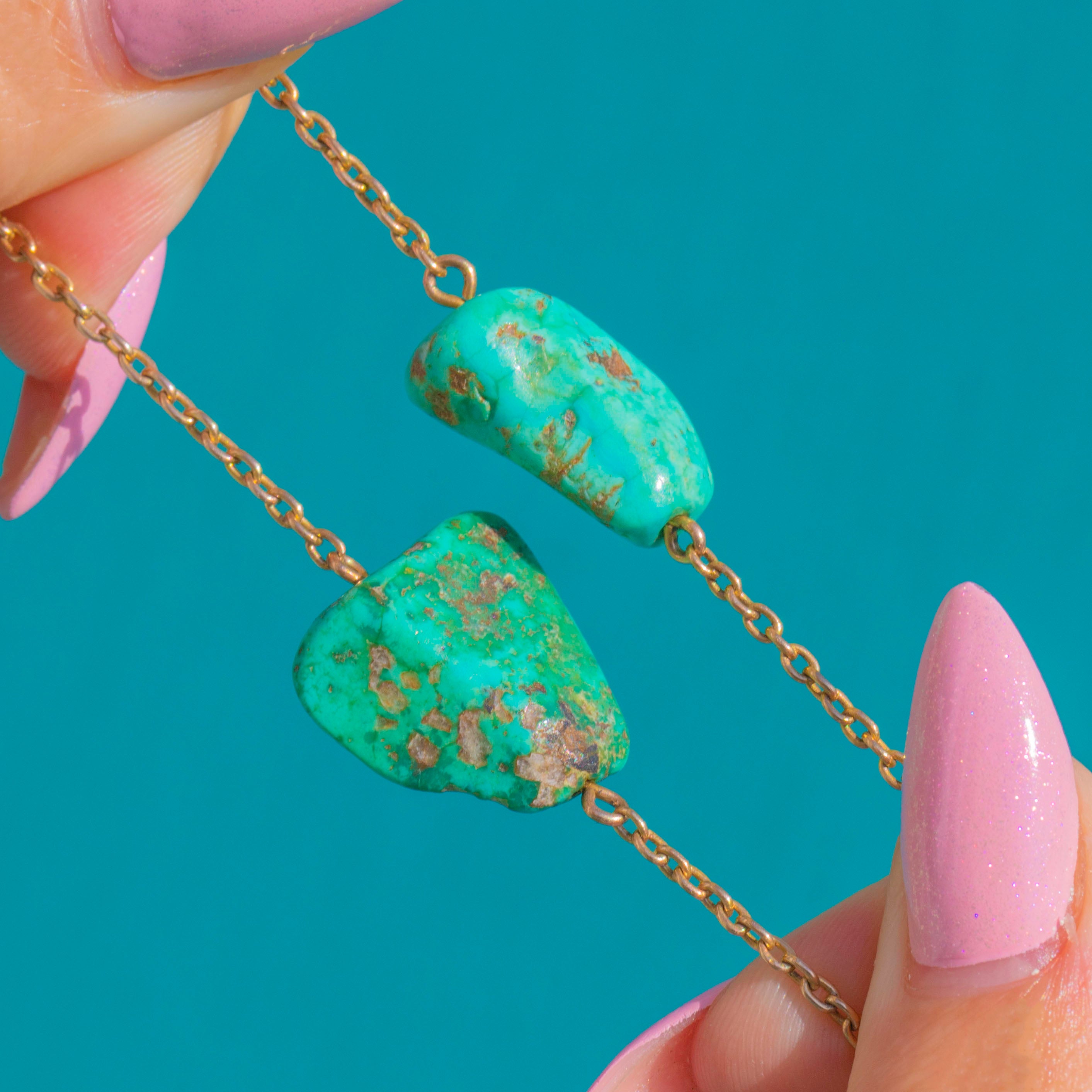VERY GOOD: The Turquoise remains vibrant with attractive natural matrix and only light surface wear visible under close inspection; no chips are noted. The 9ct Gold chain and links are bright and secure with gentle age-related patina, and the clasp operates well. No visible repairs or restorations are evident.