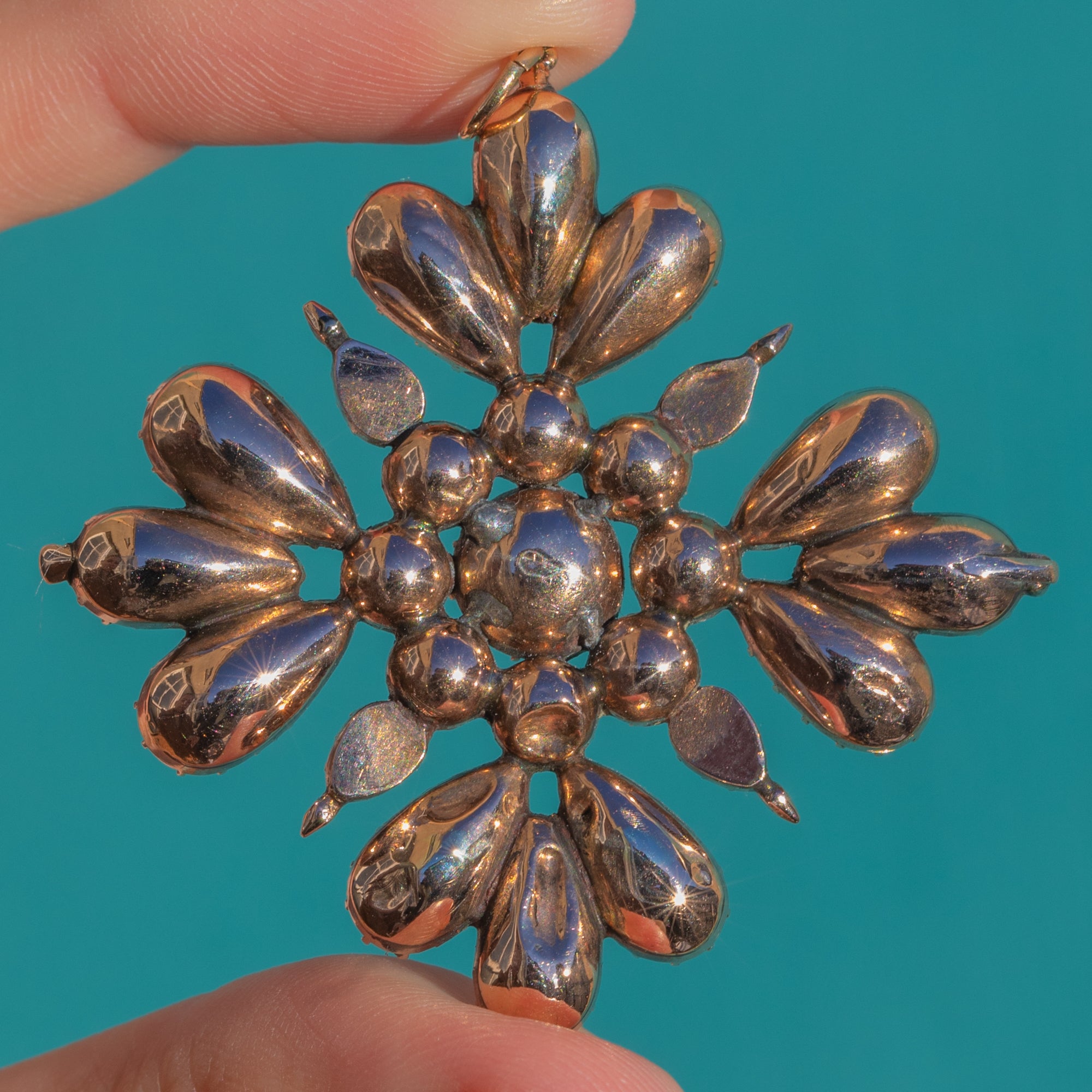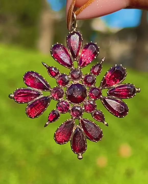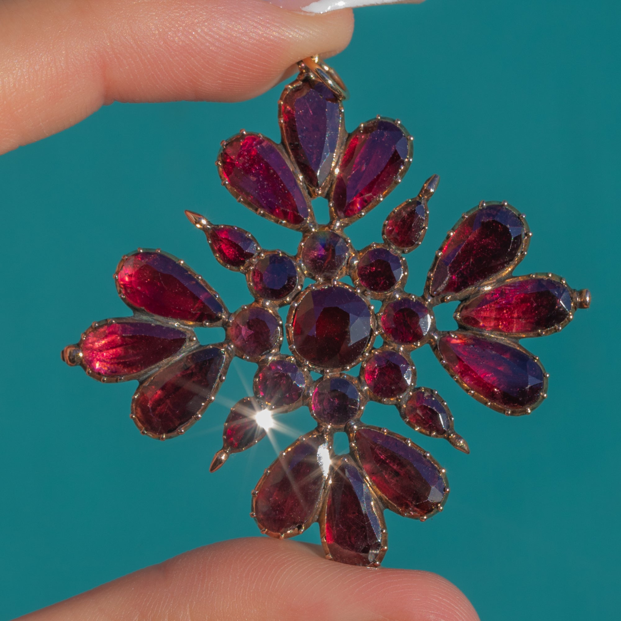 Grand, dramatic and unmistakably Georgian, this 42.00ct Garnet cross radiates with fiery depth and antique opulence. Twelve rich pear-cut Garnets bloom outward like petals, catching the light with plum-red flashes, while a cluster of eight round stones surrounds a single, larger round at the centre. The effect is bold yet refined; a true statement of 18th to early 19th century craftsmanship.