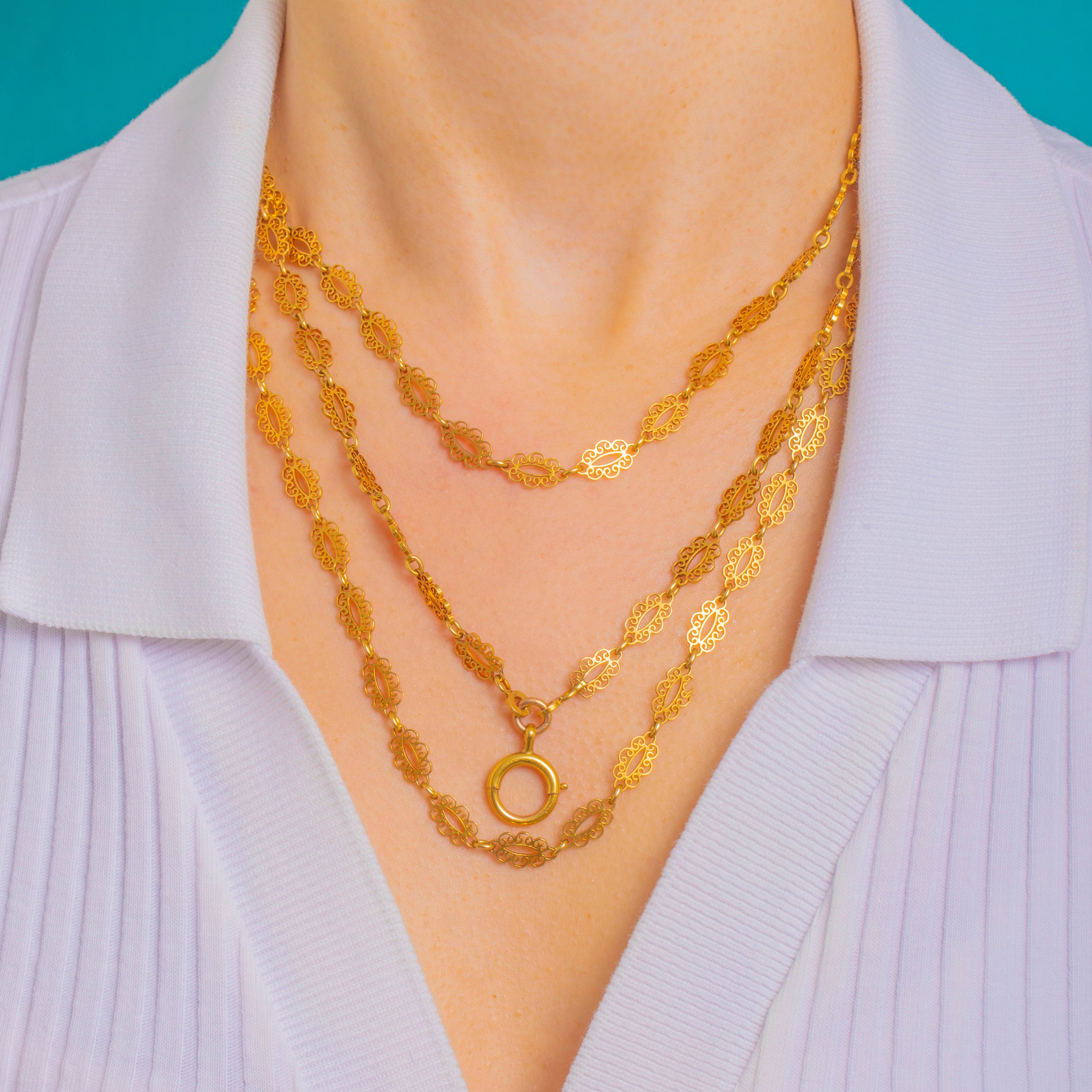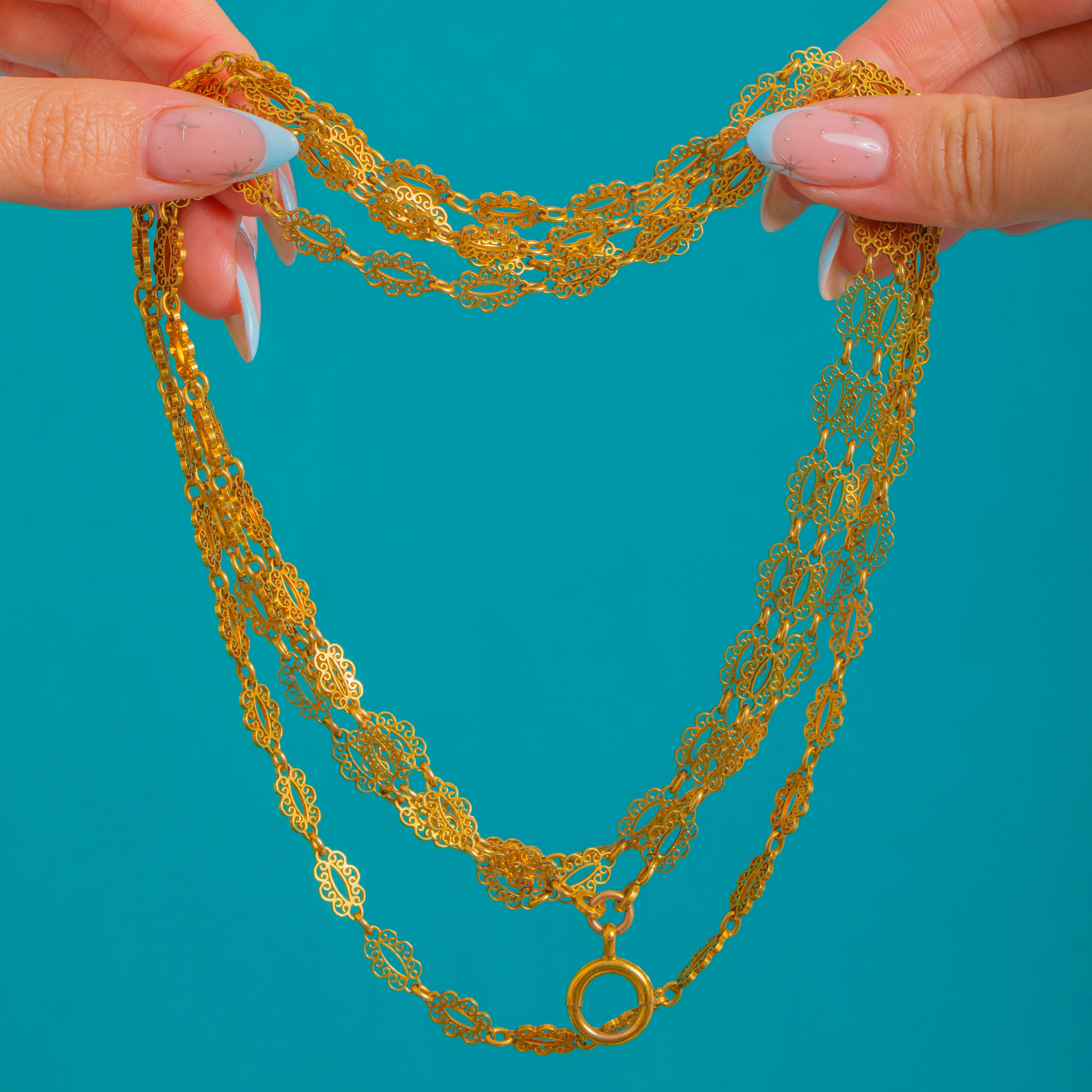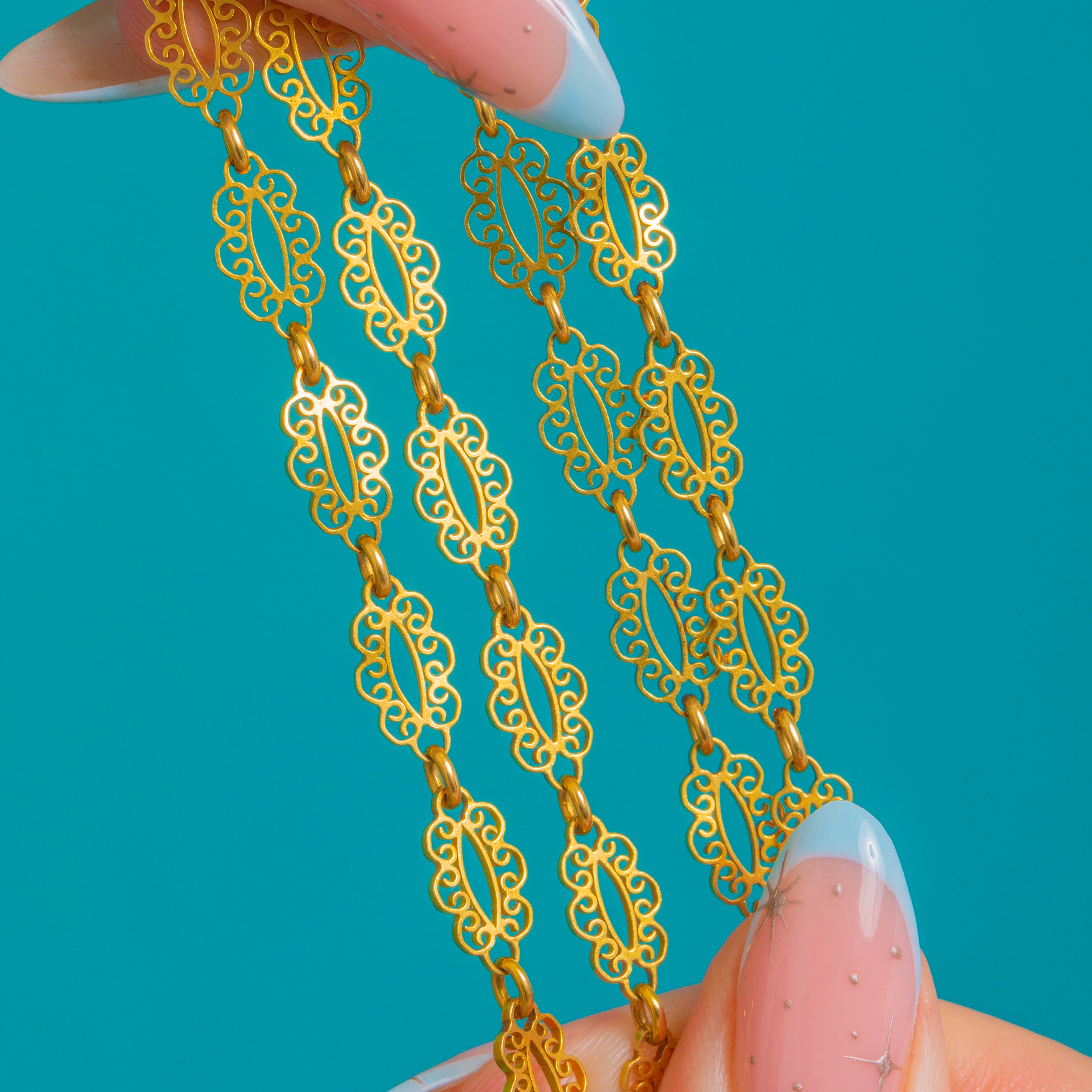An exquisite Victorian French 18ct Gold filigree guard chain, composed of repeating openwork plaques with elegant scrolling arabesques. The lace-like links flow with beautiful articulation, creating a refined, airy silhouette that feels both delicate and luxurious.