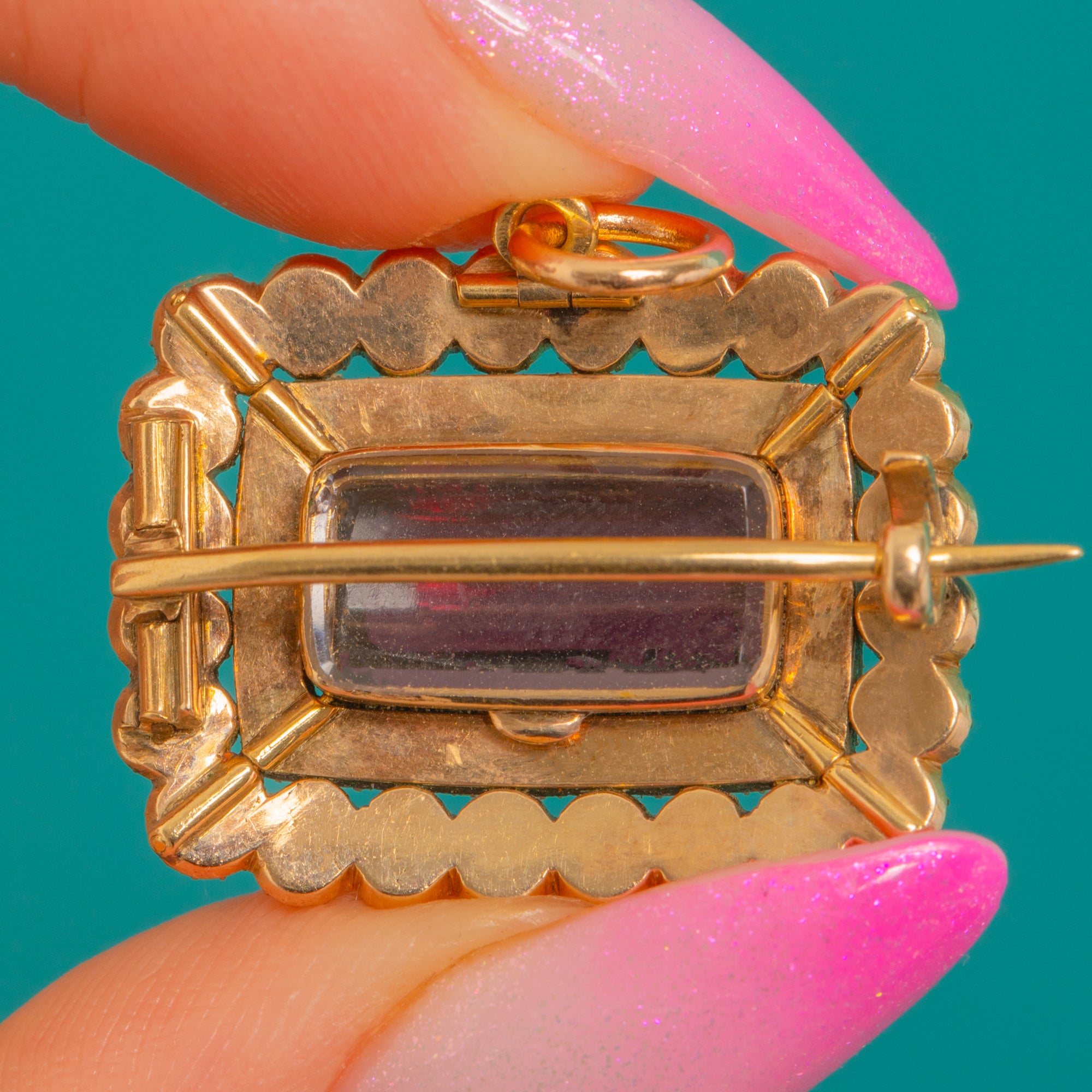A jewel of Georgian romance, this locket-back pendant centres a richly saturated Sugarloaf Garnet, its high dome glowing against a halo of creamy Natural Pearls. Hand-crafted in warm 9ct Gold, the rectangular silhouette and closely set Pearls create a beautiful play of light and texture, epitomising the refined elegance of early 19th-century design.