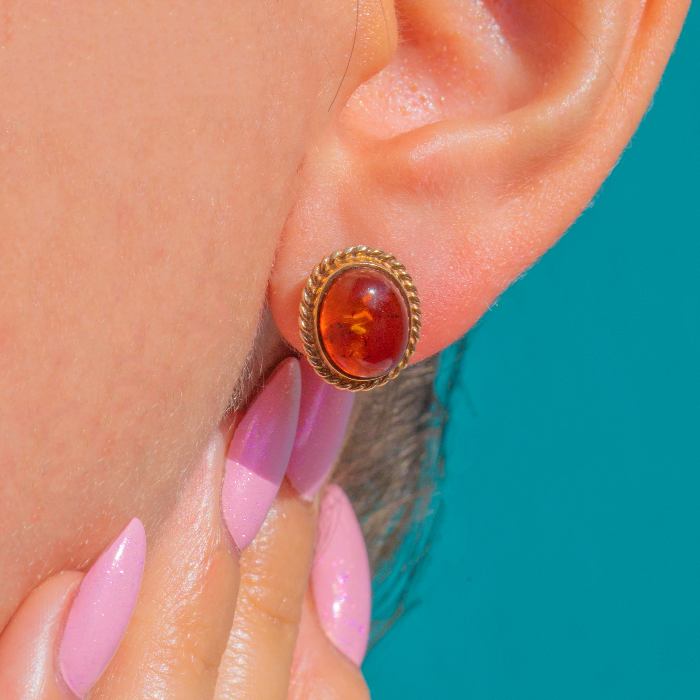 Warm and effortlessly elegant, this Vintage pair of 9ct Gold Amber studs brings a glow to every day. Oval cabochons of rich cognac Amber are cradled in smooth bezels and framed by a refined rope‑twist border, creating a classic silhouette that sits neatly on the ear.