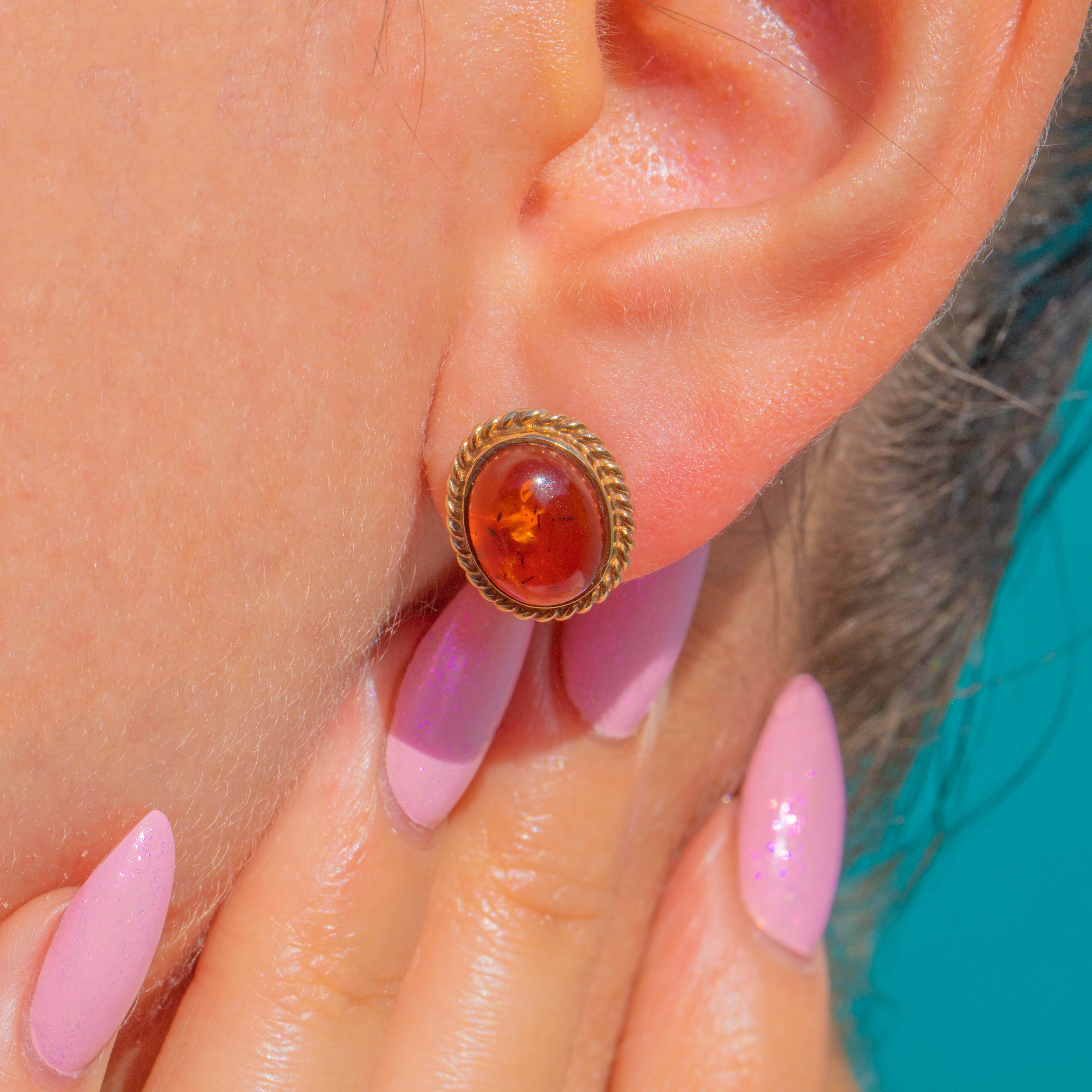 EXCELLENT: The Amber cabochons are glossy with natural internal inclusions and no chips or cracks visible. The 9ct Gold rope borders and bezels are crisp and secure with only light surface wear and a gentle patina. Posts and fittings present beautifully with no visible repairs.