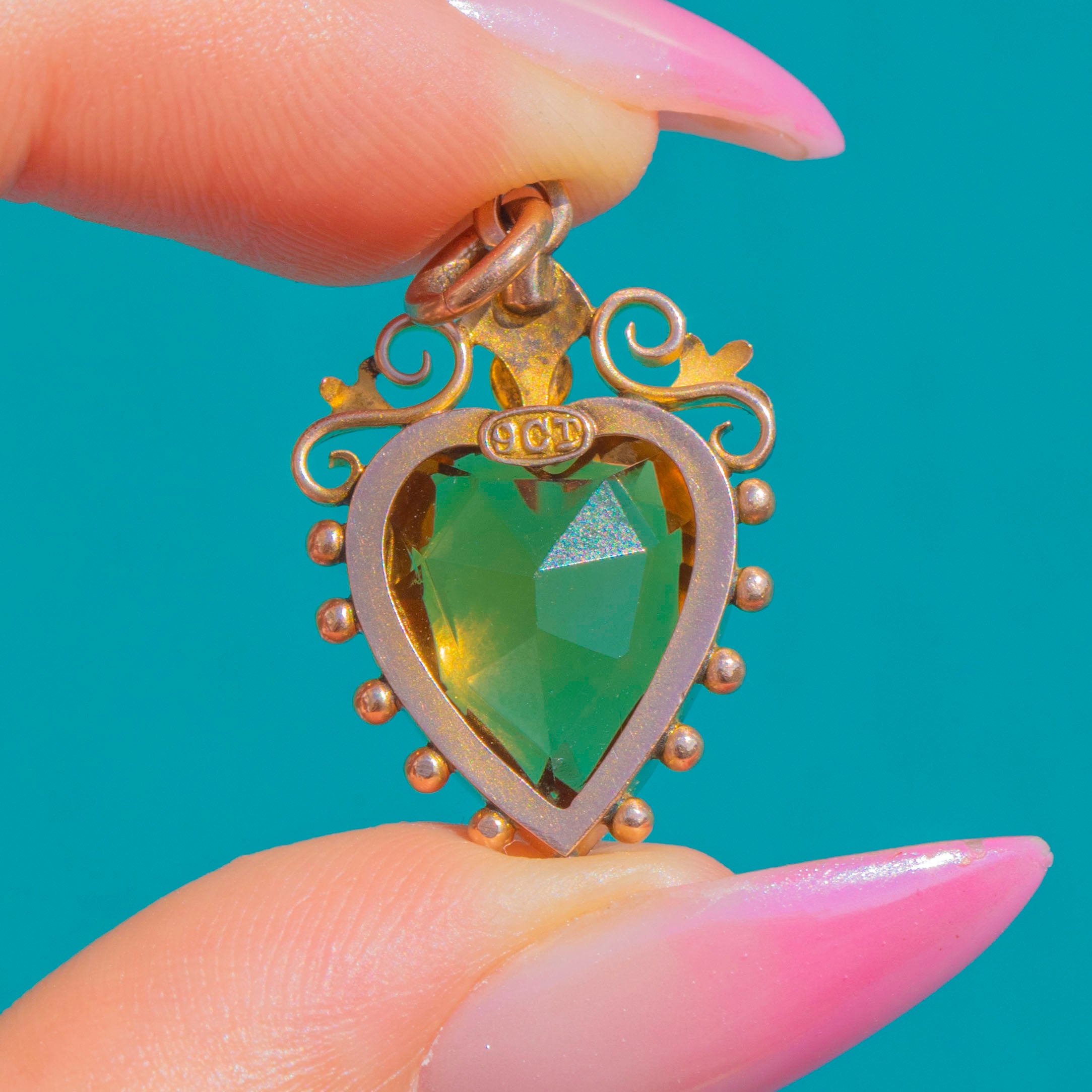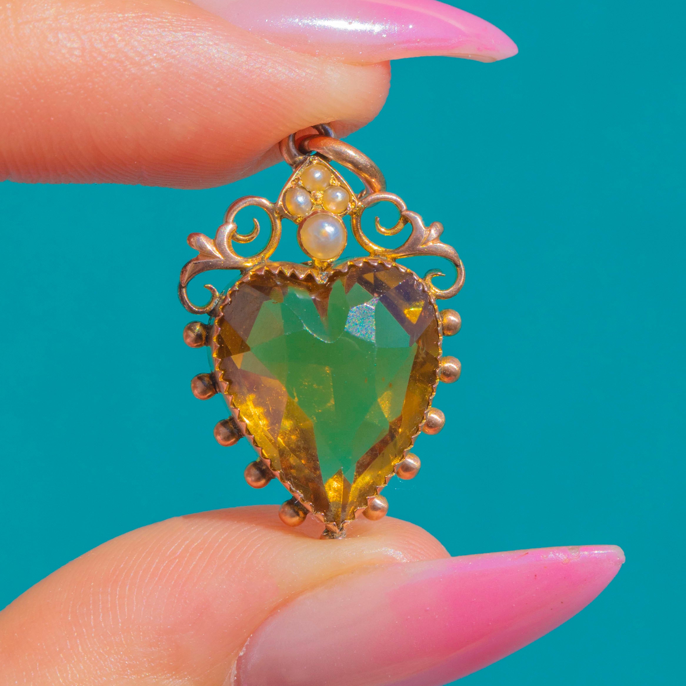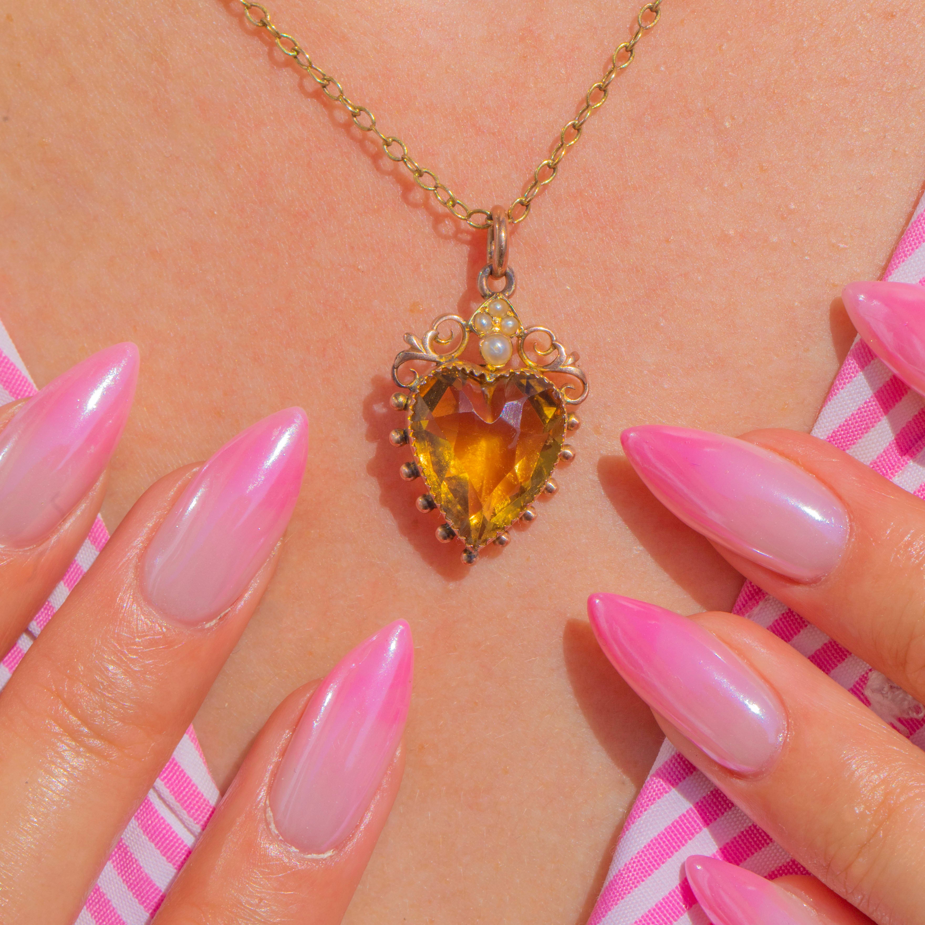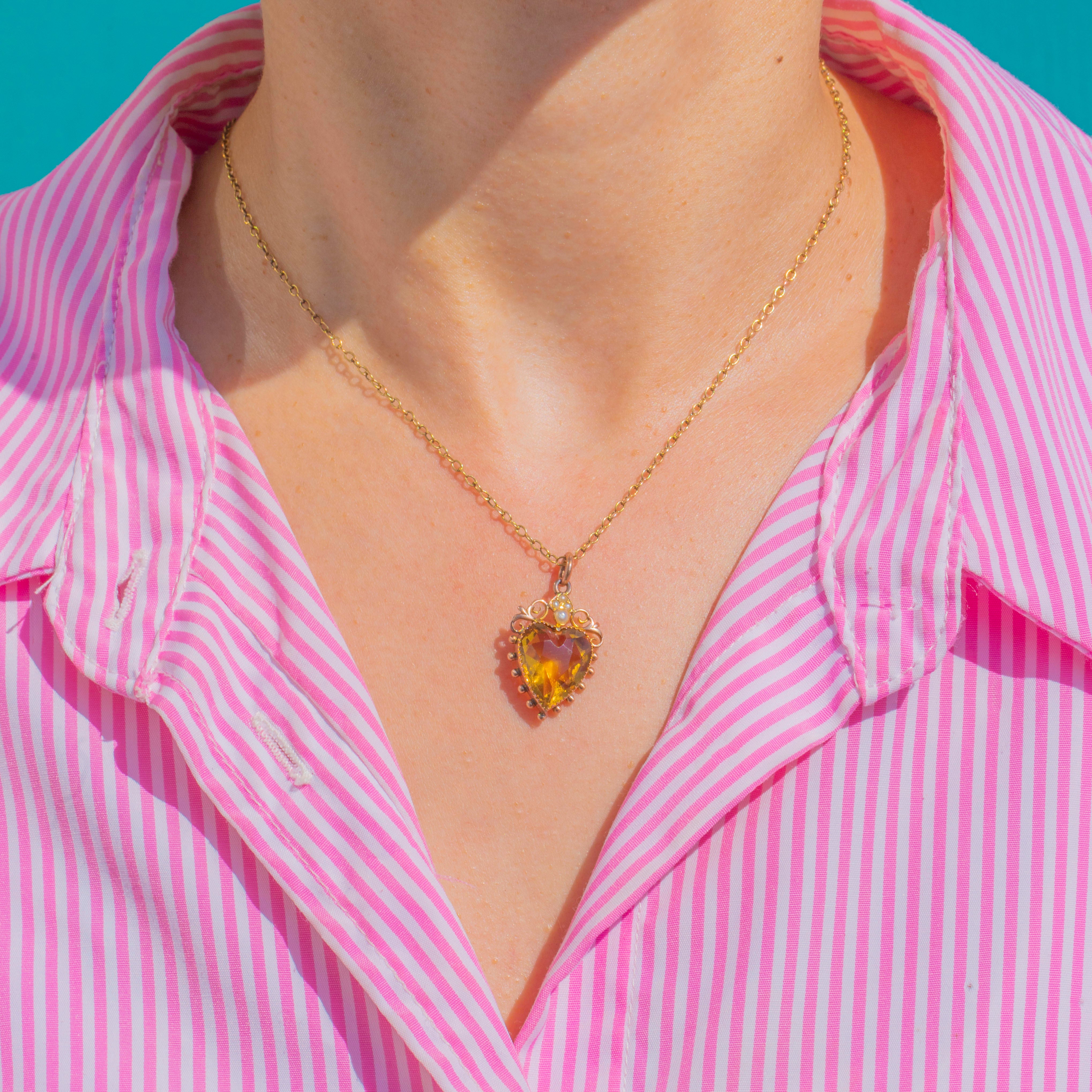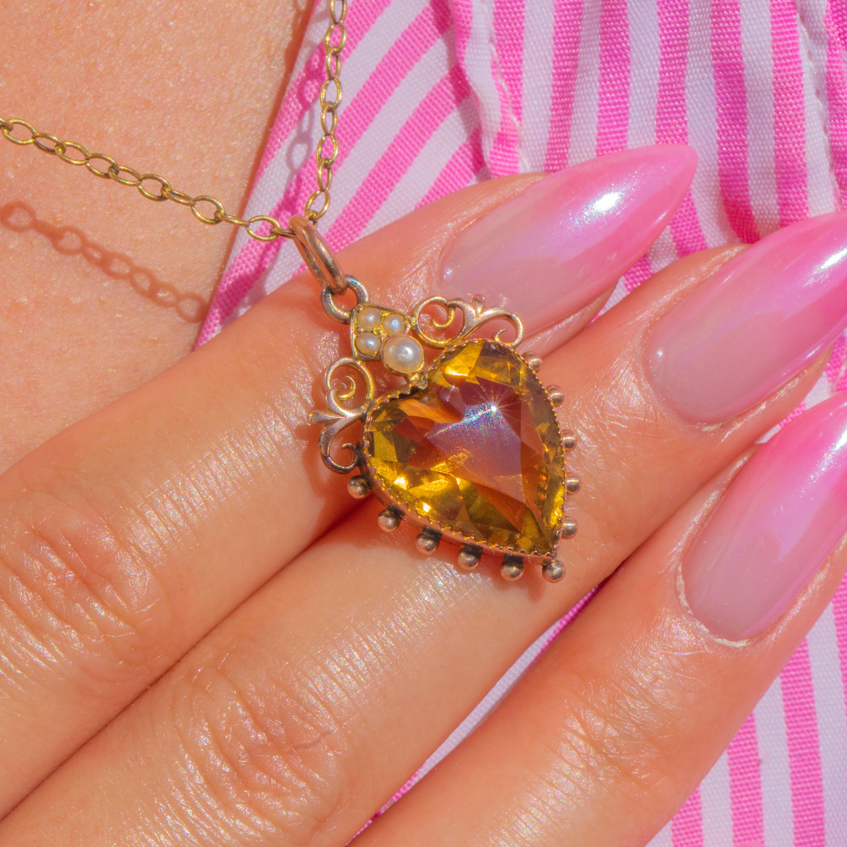 Romantic and radiant, this Victorian 9ct Gold heart pendant centres on a luminous Citrine of approximately 7.45cts. The gemstone is framed by a delicate beaded bezel and crowned with a sweet cluster of Seed Pearls, while graceful openwork scrolls add a touch of ornate whimsy.