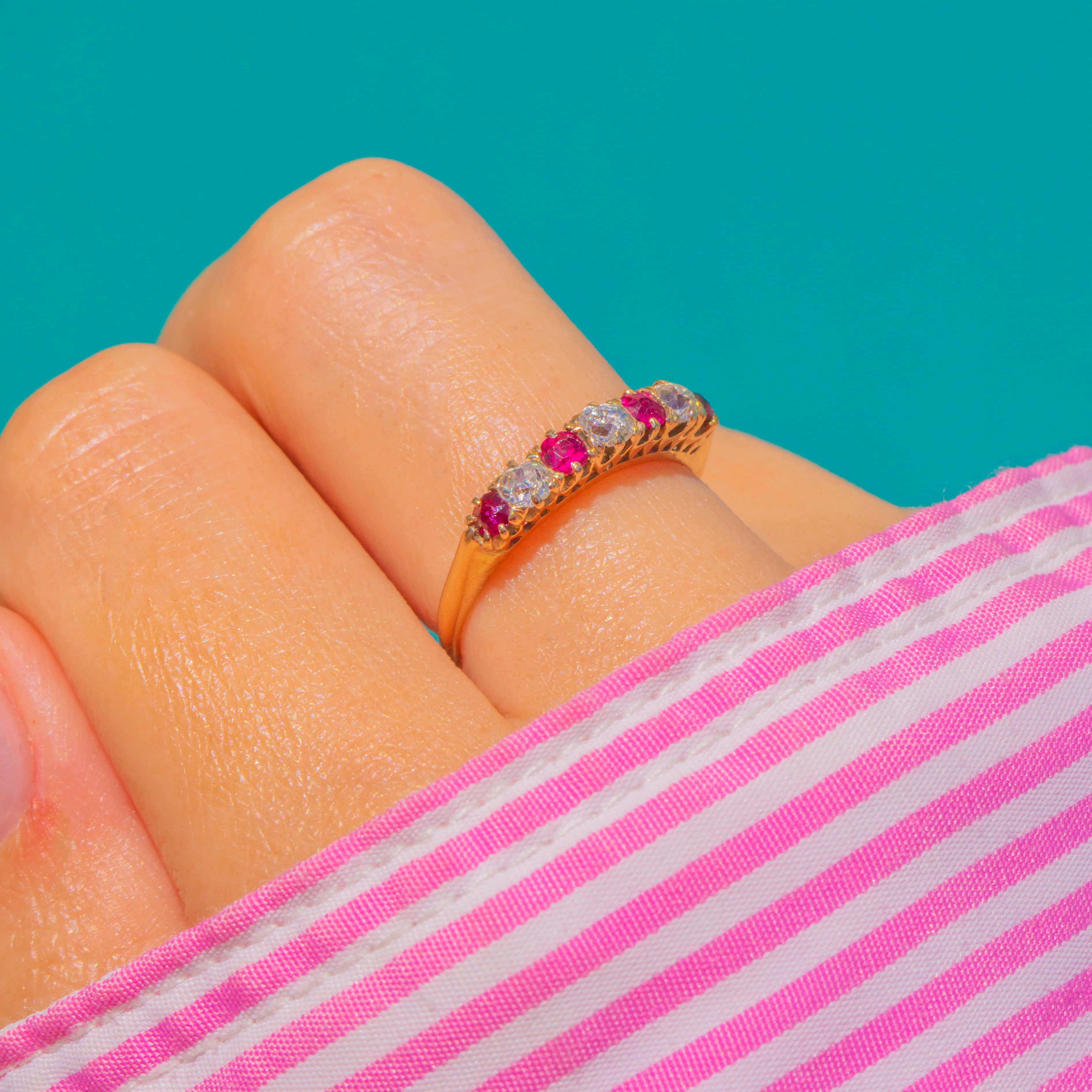 A delicate delight in 9ct Gold, this half eternity ring pairs vivid Rubies with twinkling Diamonds in a neat, alternating line. Each round stone is individually claw-set to catch the light, creating a refined ribbon of pink-red and white sparkle across the finger.