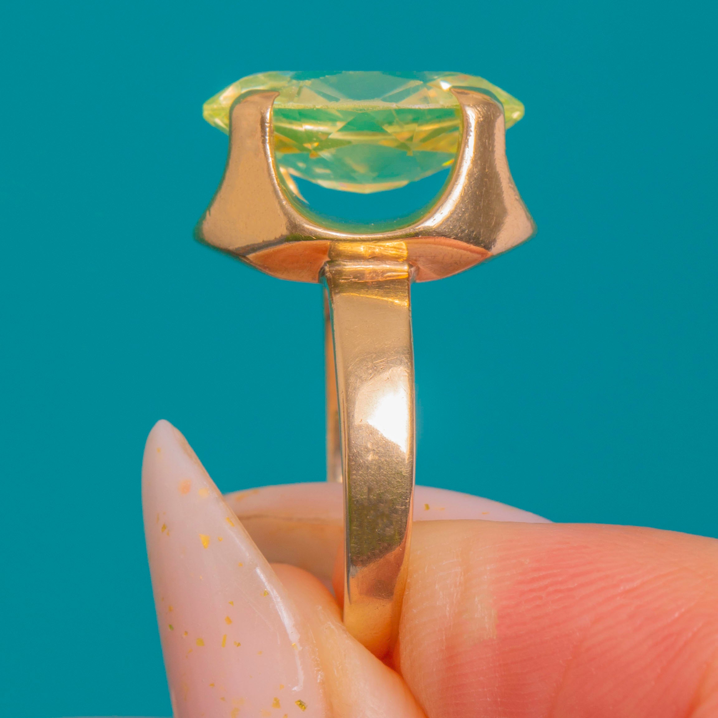 This bold Vintage solitaire ring showcases a vivid lemon‑lime green Synthetic Spinel in a sculptural 9ct Gold mount. The substantial head presents smooth, architectural lines with open side windows and a high gallery, giving the gemstone beautiful light and presence on the hand.