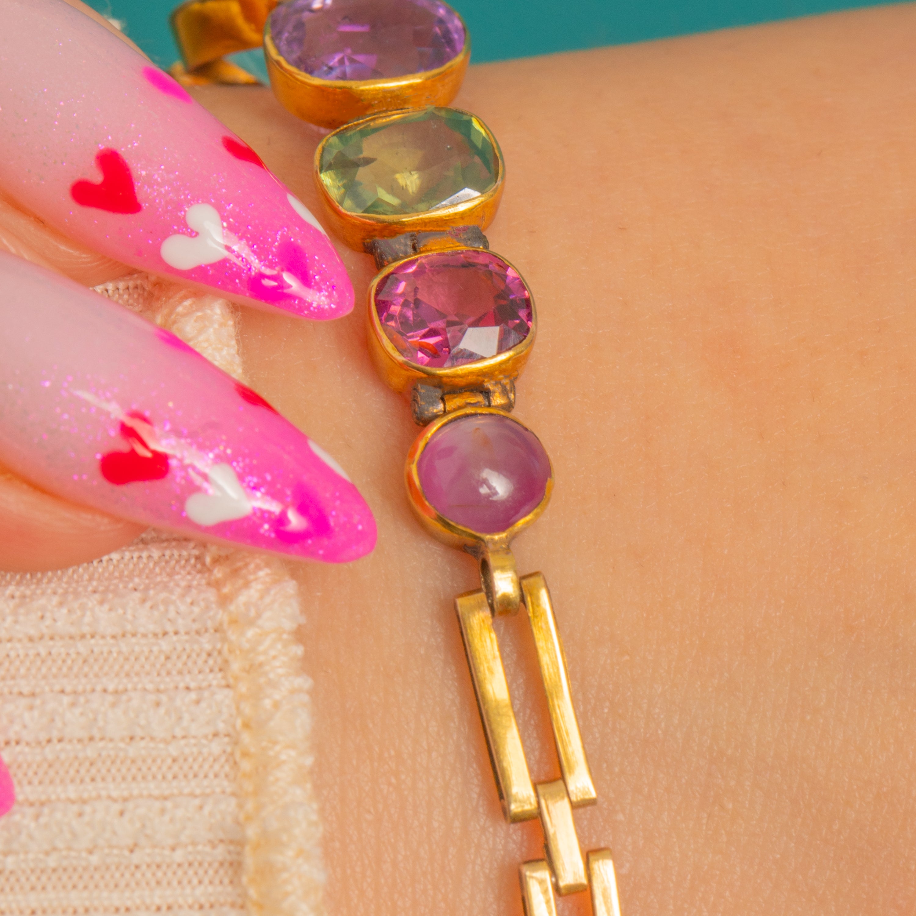 9ct Gold Harlequin Multi Gem Bracelet, Star Ruby, Emerald, Amethyst, Topaz, Citrine,