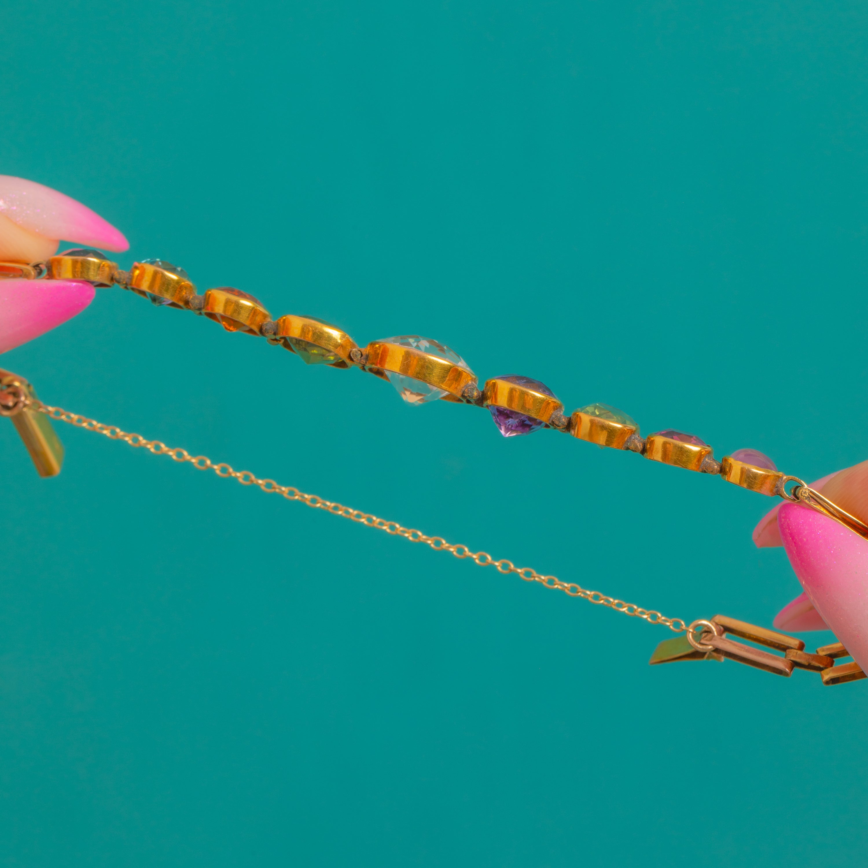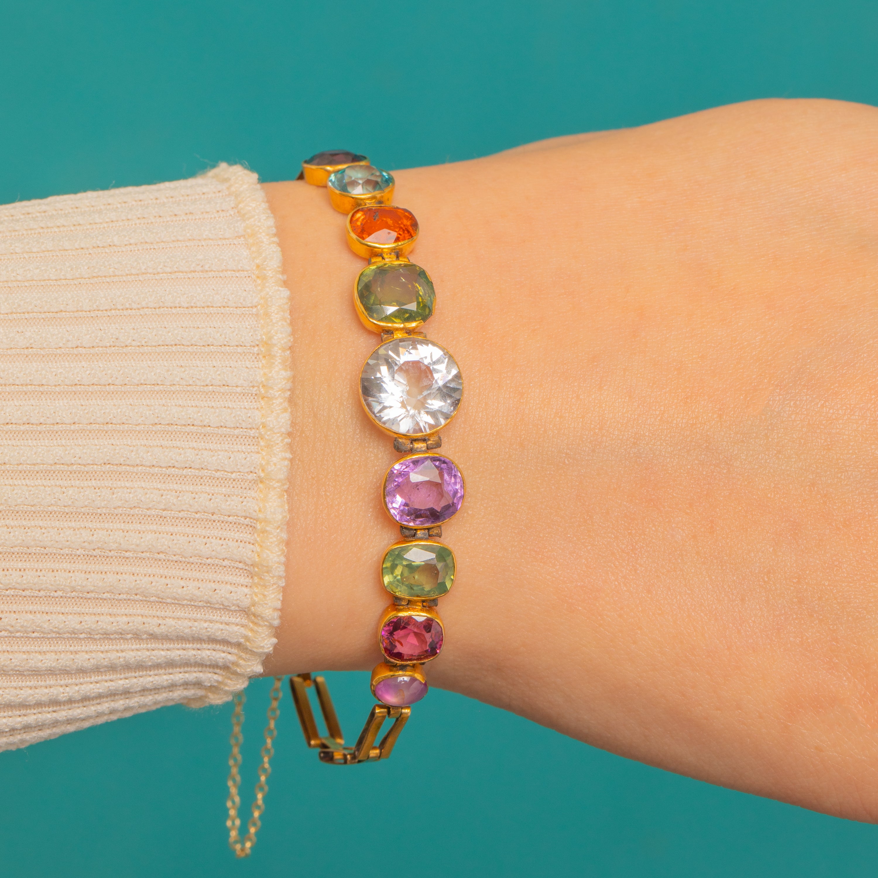 A joyous Victorian “harlequin” line bracelet in 9ct Gold, set with a kaleidoscope of coloured gemstones. At its heart sits a luminous White Topaz of approximately 3.60ct, framed by a vibrant parade of Star Ruby cabochon, Emerald, Amethyst, Pink and Green Tourmaline, Citrine, Aquamarine and Spinel. The smooth bezels and articulated construction create a refined, wearable silhouette that lies beautifully on the wrist.