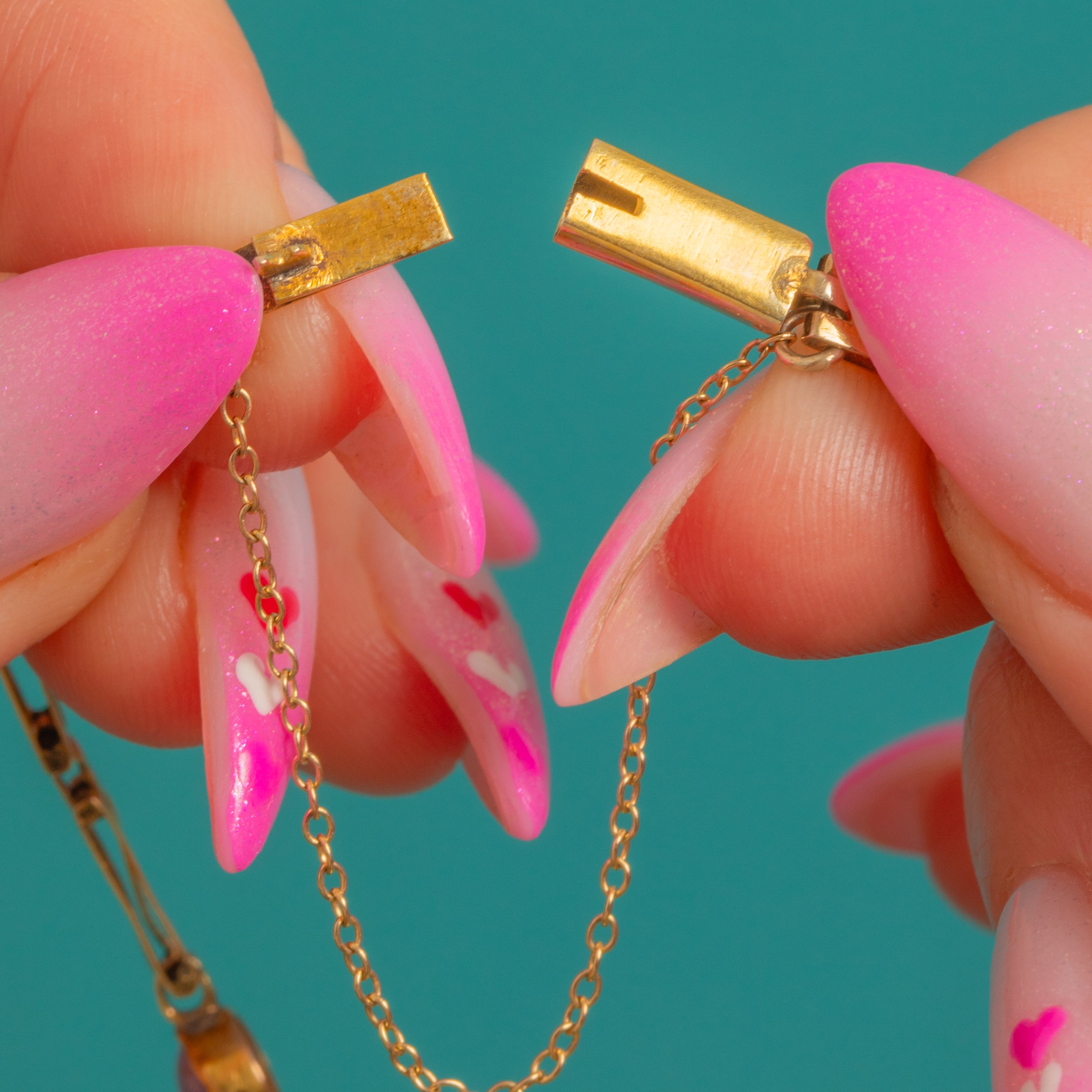 The palette is wonderfully balanced—cool aquas and lilacs dancing with rich greens, pinks and golden honey tones—capturing the whimsical charm collectors love in harlequin jewels. Finished with a box clasp and safety chain for confidence in wear, this antique treasure brings colour, character and timeless elegance in equal measure.