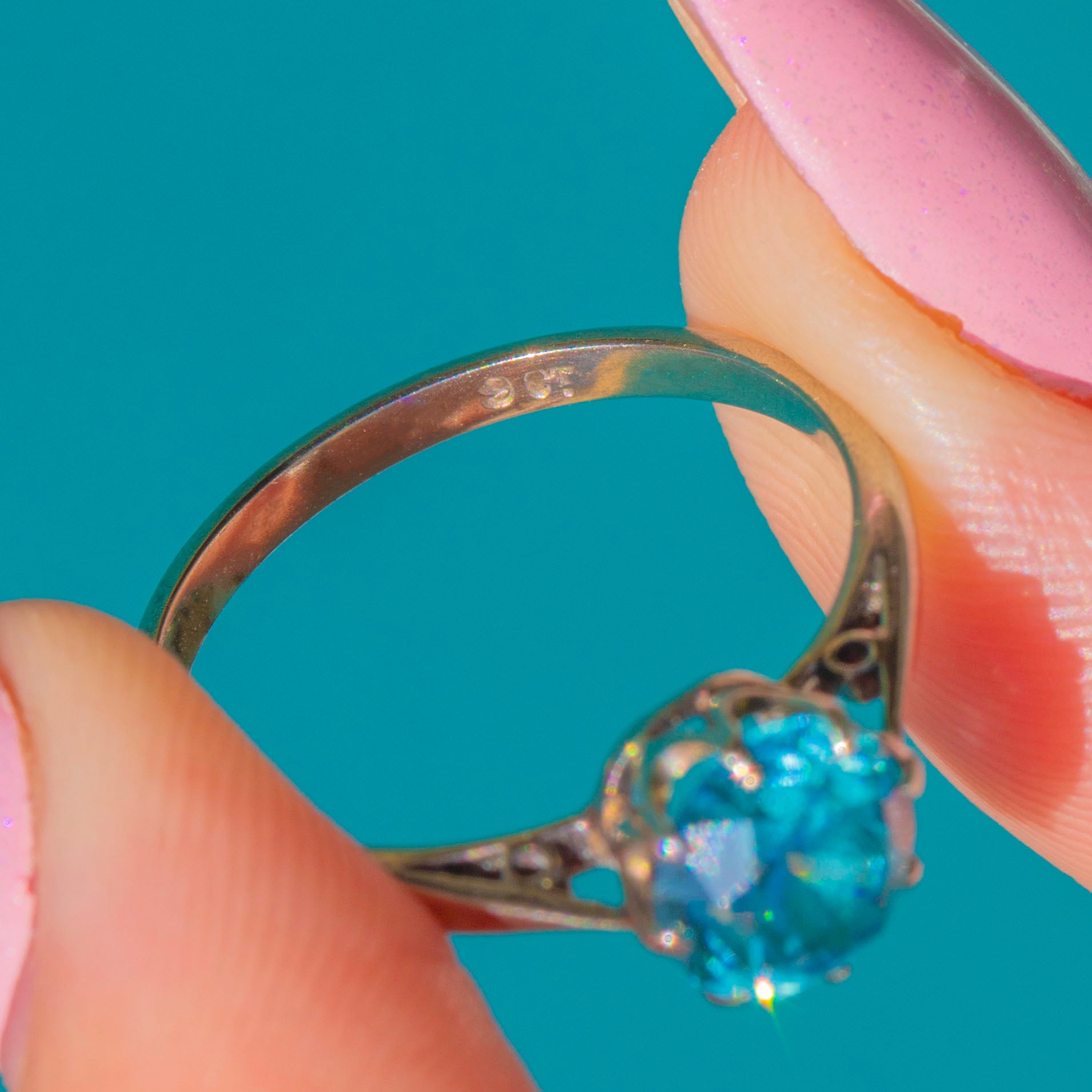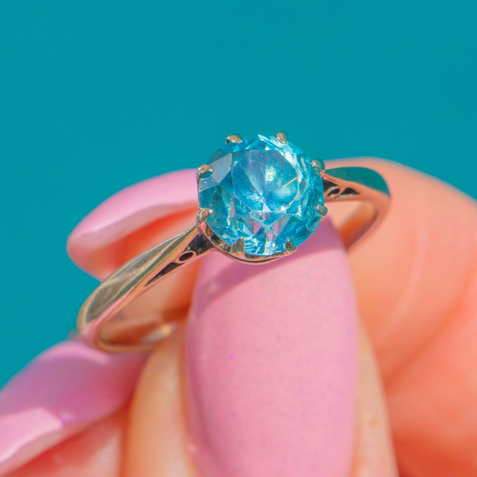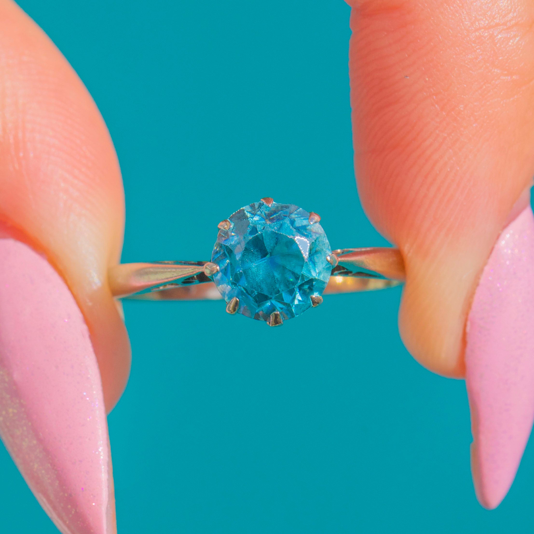 EXCELLENT: The Blue Zircon is bright and lively with only a couple of tiny facet nicks visible under magnification, and no eye-visible chips. The multi‑claw basket and slim shank are secure with light surface scratches from gentle wear. No visible resizing or restoration, and the claws hold the stone securely.