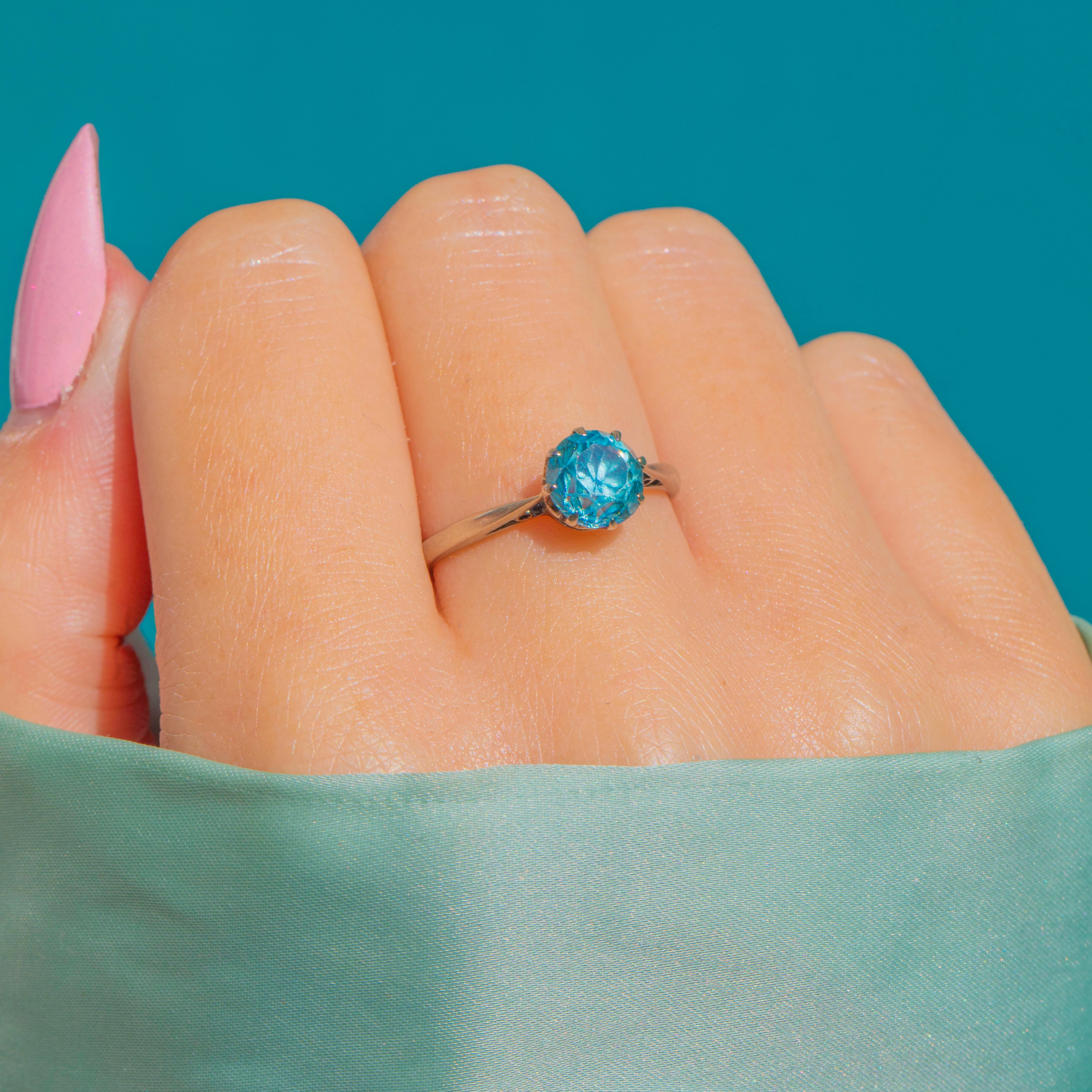 A luminous Blue Zircon solitaire in cool 9ct White Gold. The natural Blue “Starlite” Zircon of approximately 1.50ct sits in a refined multi‑claw basket, its vivid aqua hue sparkling with lively fire. A slim, elegant shank keeps the silhouette clean and timeless—beautiful worn alone or stacked for a flash of colour.