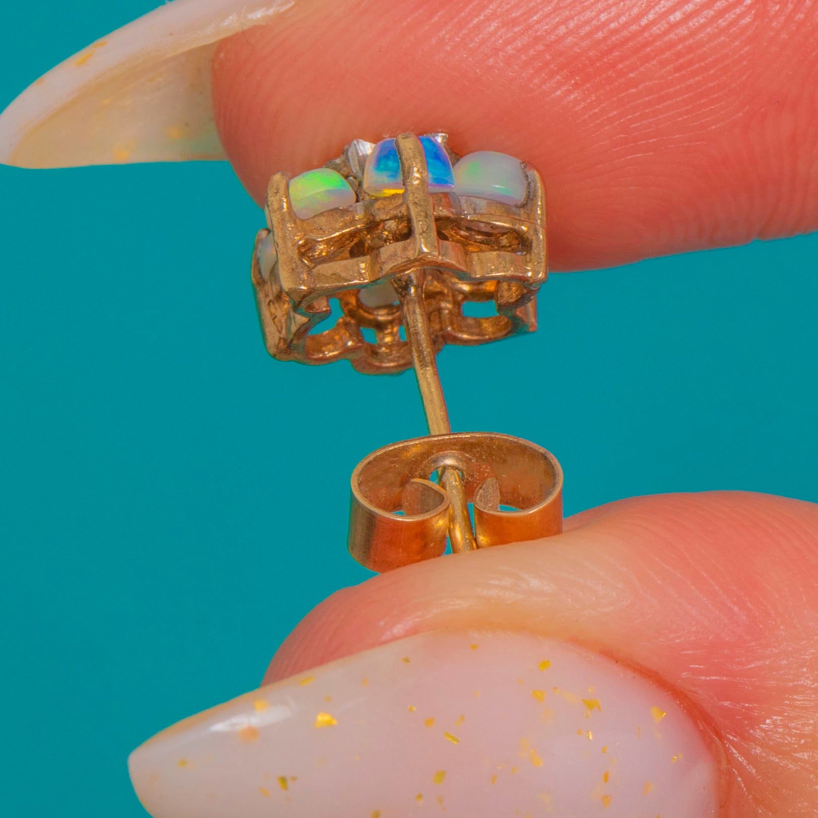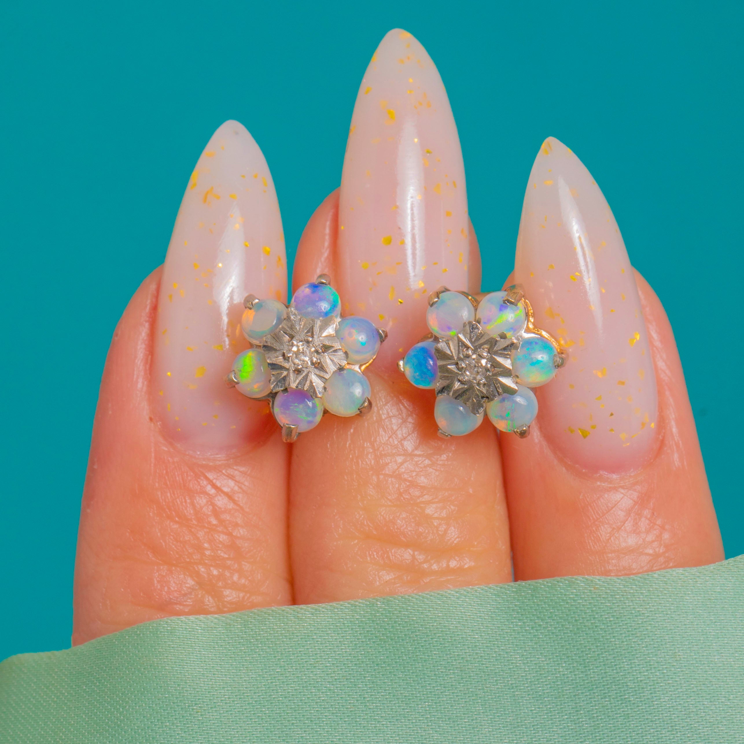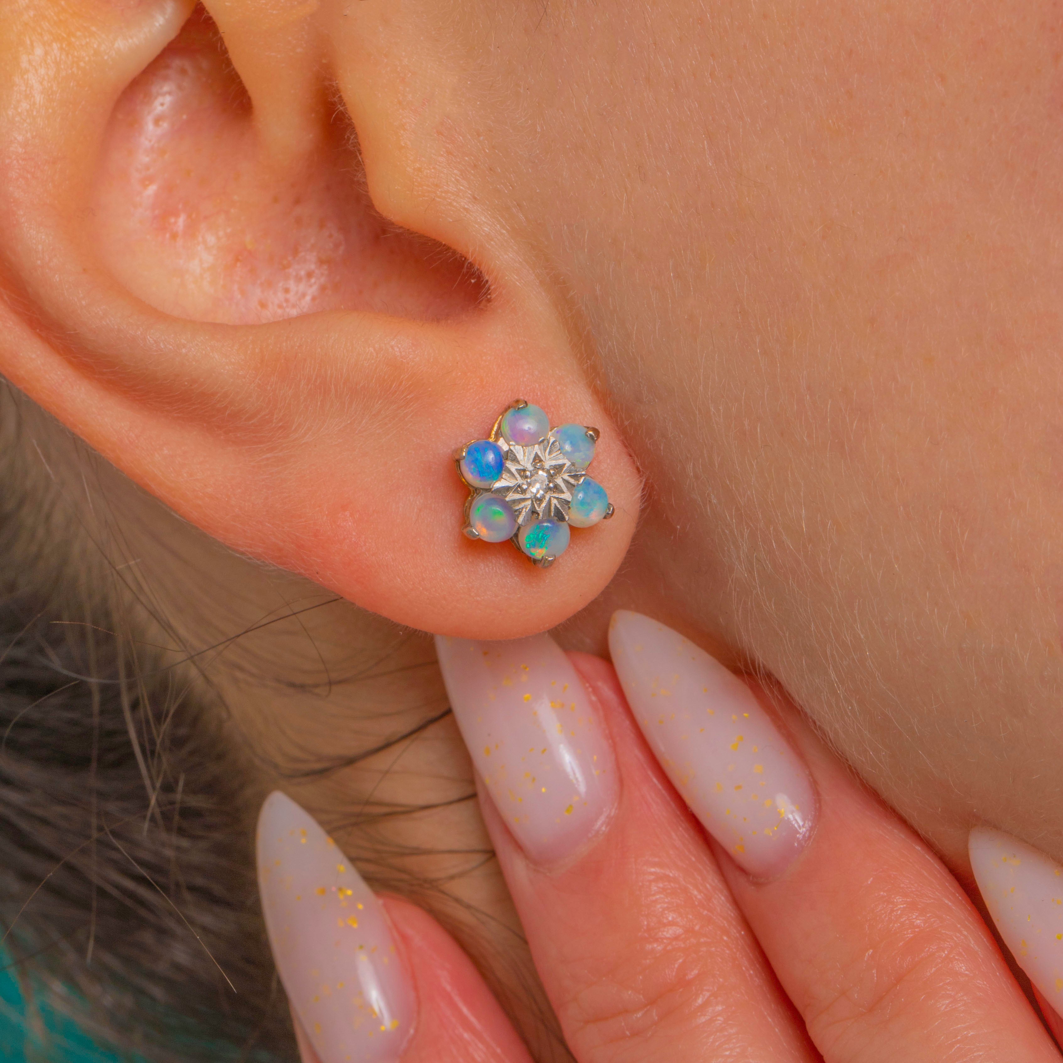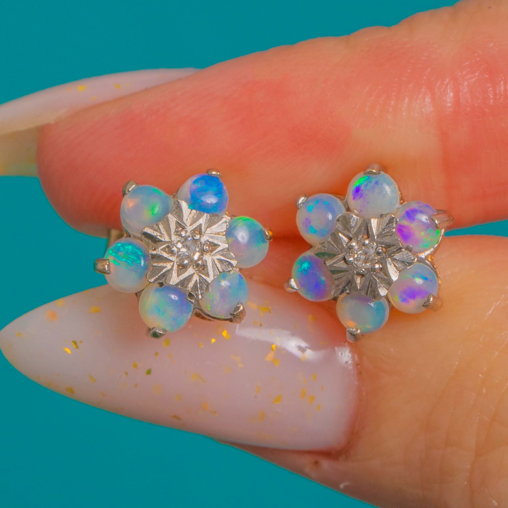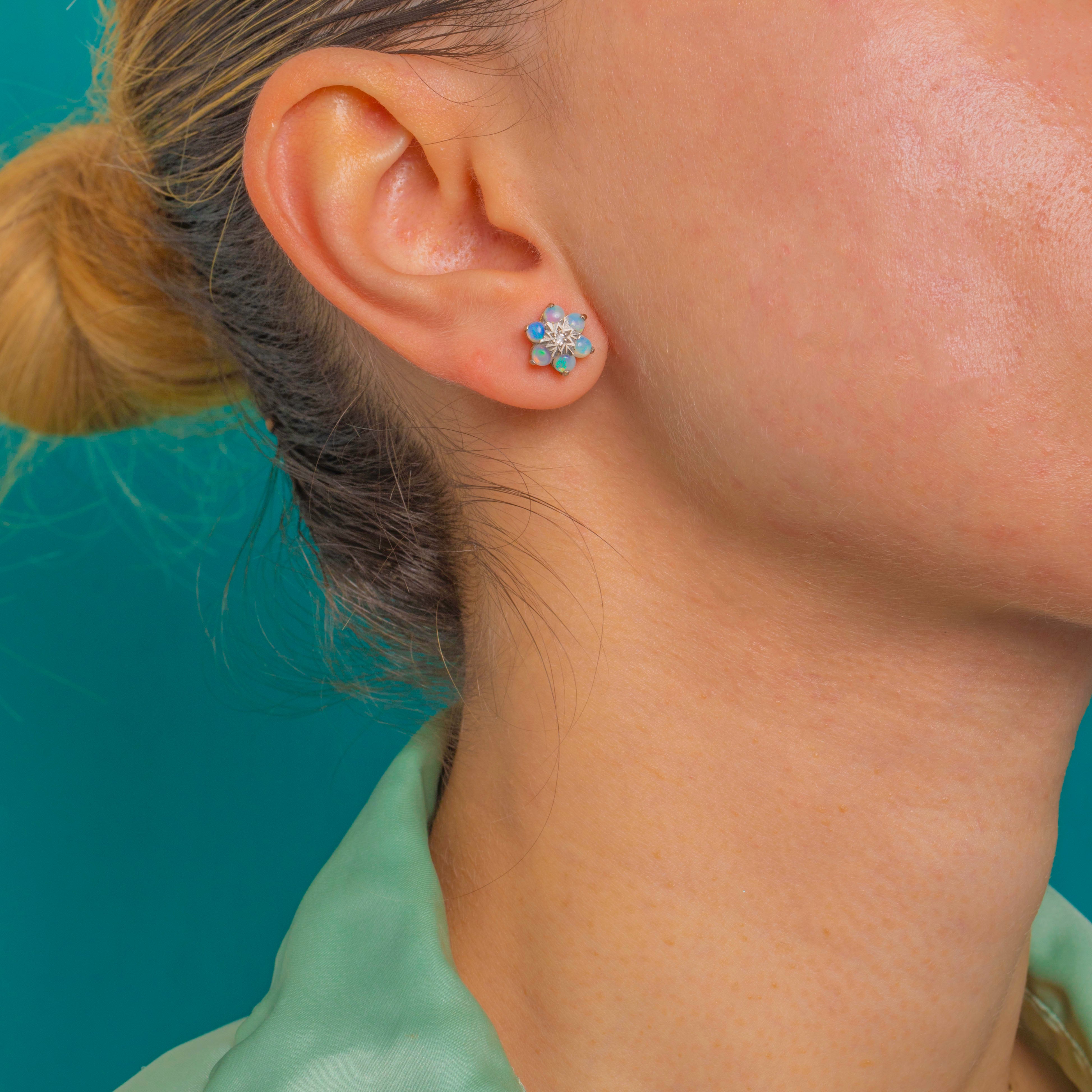 Petite yet luxurious, these Vintage Opal and Diamond cluster stud earrings bloom with soft iridescence. Six Natural solid Opals in each earring display dreamy pastel hues—pinks, lilacs and blue‑green flashes—arranged in a delicate daisy halo. At the heart sits a tiny round Diamond set in a White Gold “illusion” star, lending a bright, crisp sparkle and beautiful two‑tone contrast against the Yellow Gold.