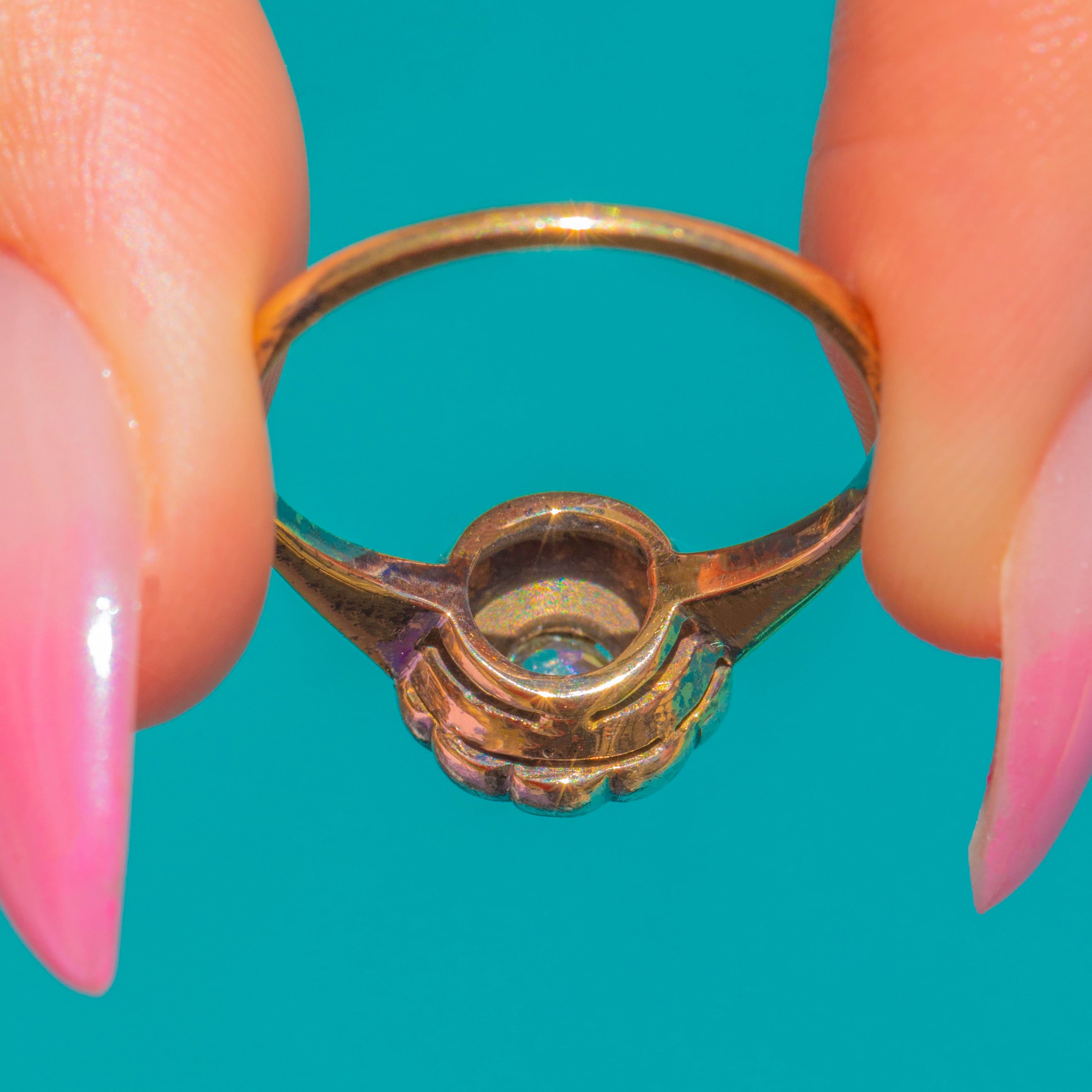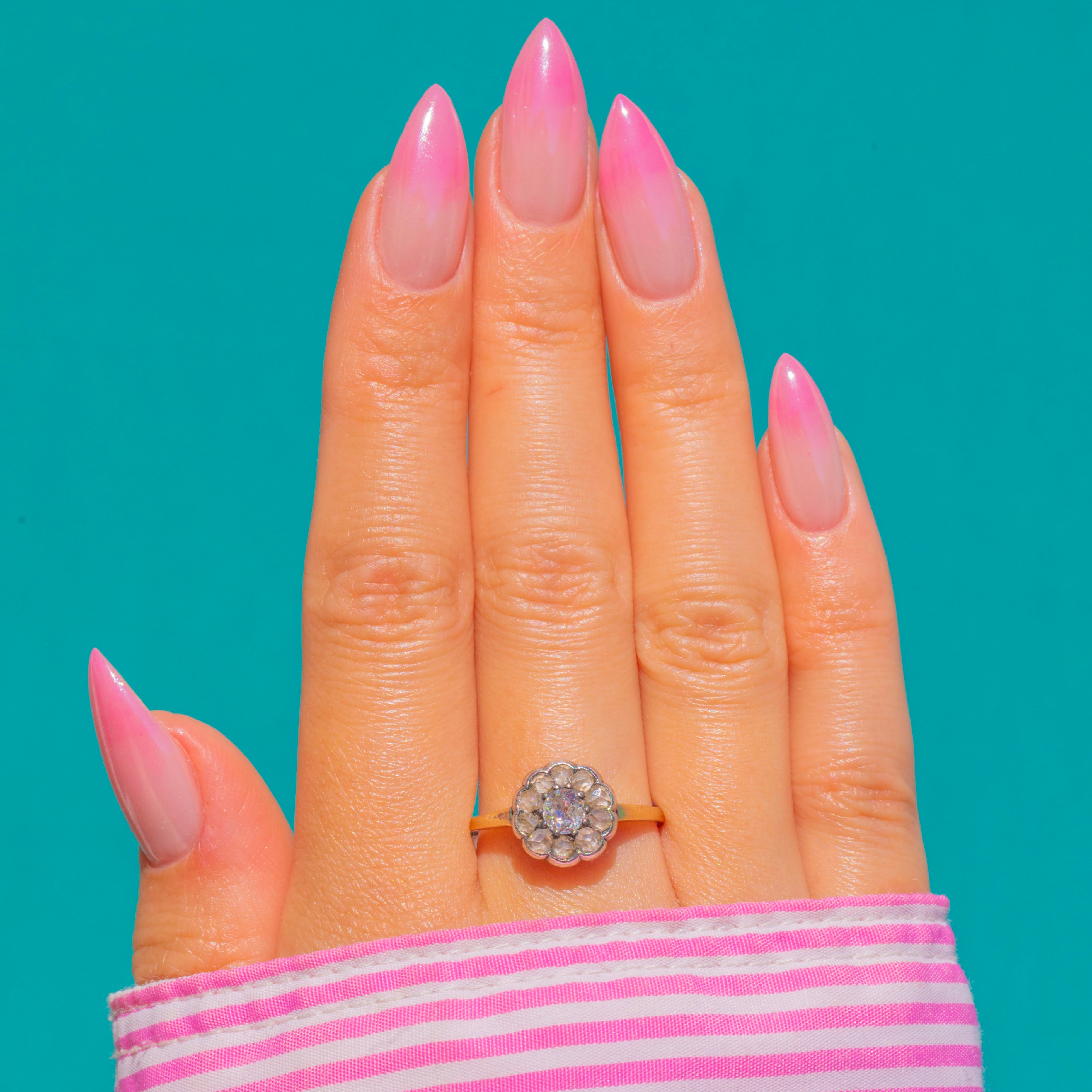 The Diamonds total approximately 0.85ct, with an estimated 0.25ct at the centre and around 0.60ct in the surrounding halo. Petite yet radiant, this piece has all the charm of antique craftsmanship in miniature—perfect worn alone or as a graceful accent within a stack.