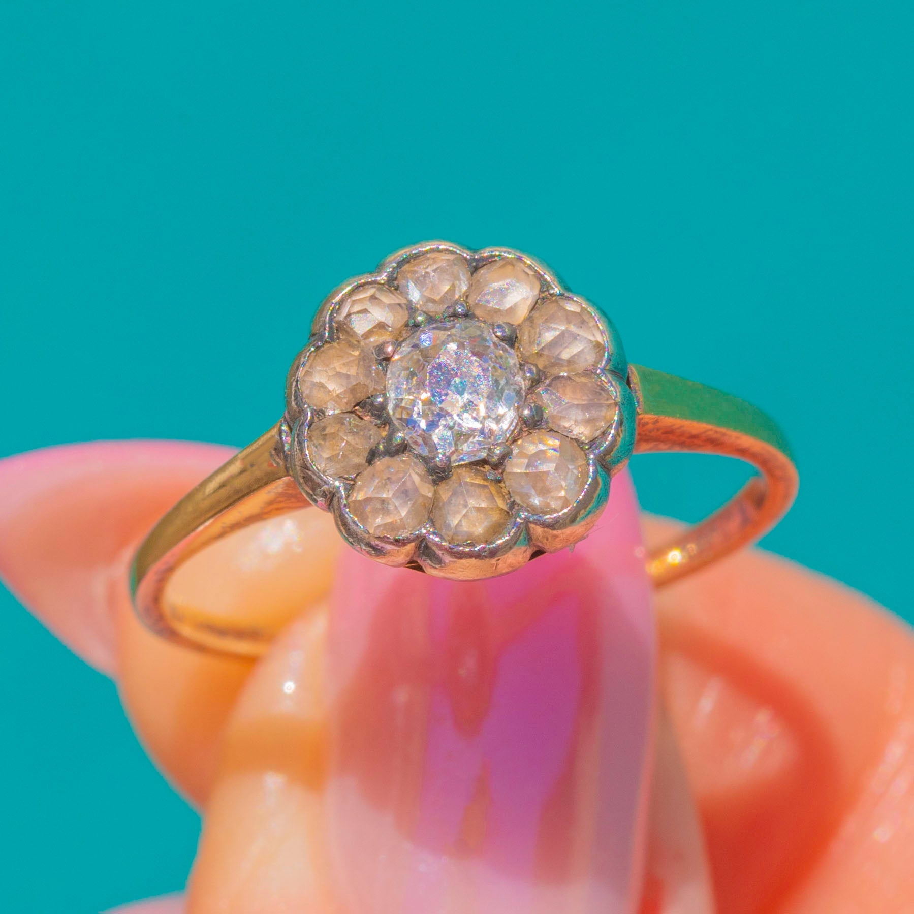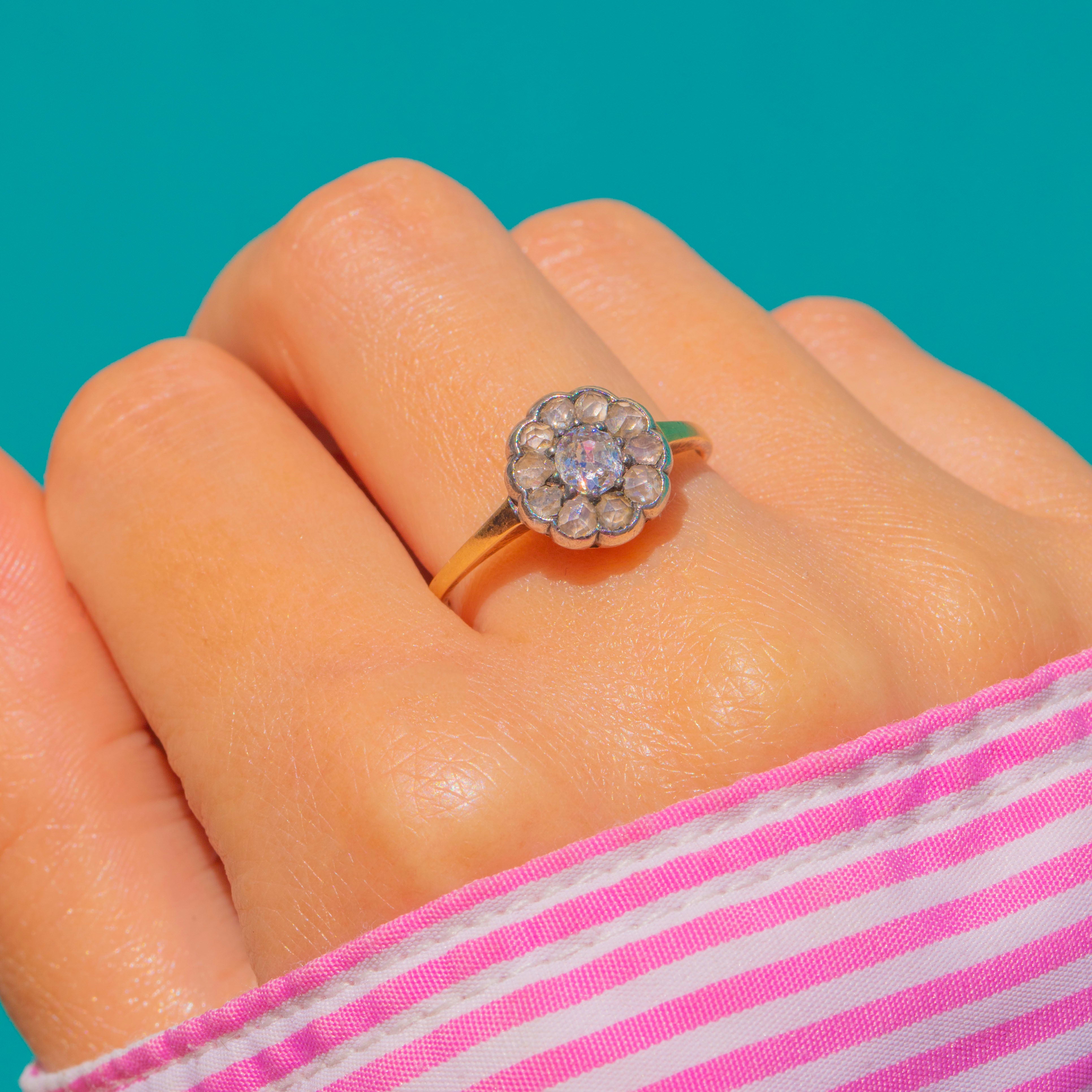 A romantic Edwardian Diamond flower cluster ring, delicately crafted with a scalloped Silver head and a slender 9ct Gold shank. A round faceted central Diamond is framed by a halo of glistening rose-cut Diamonds, creating that timeless posy silhouette beloved of the era. The elegant two-tone palette highlights the crisp sparkle of the Diamonds and the soft glow of Gold for a beautifully refined finish.