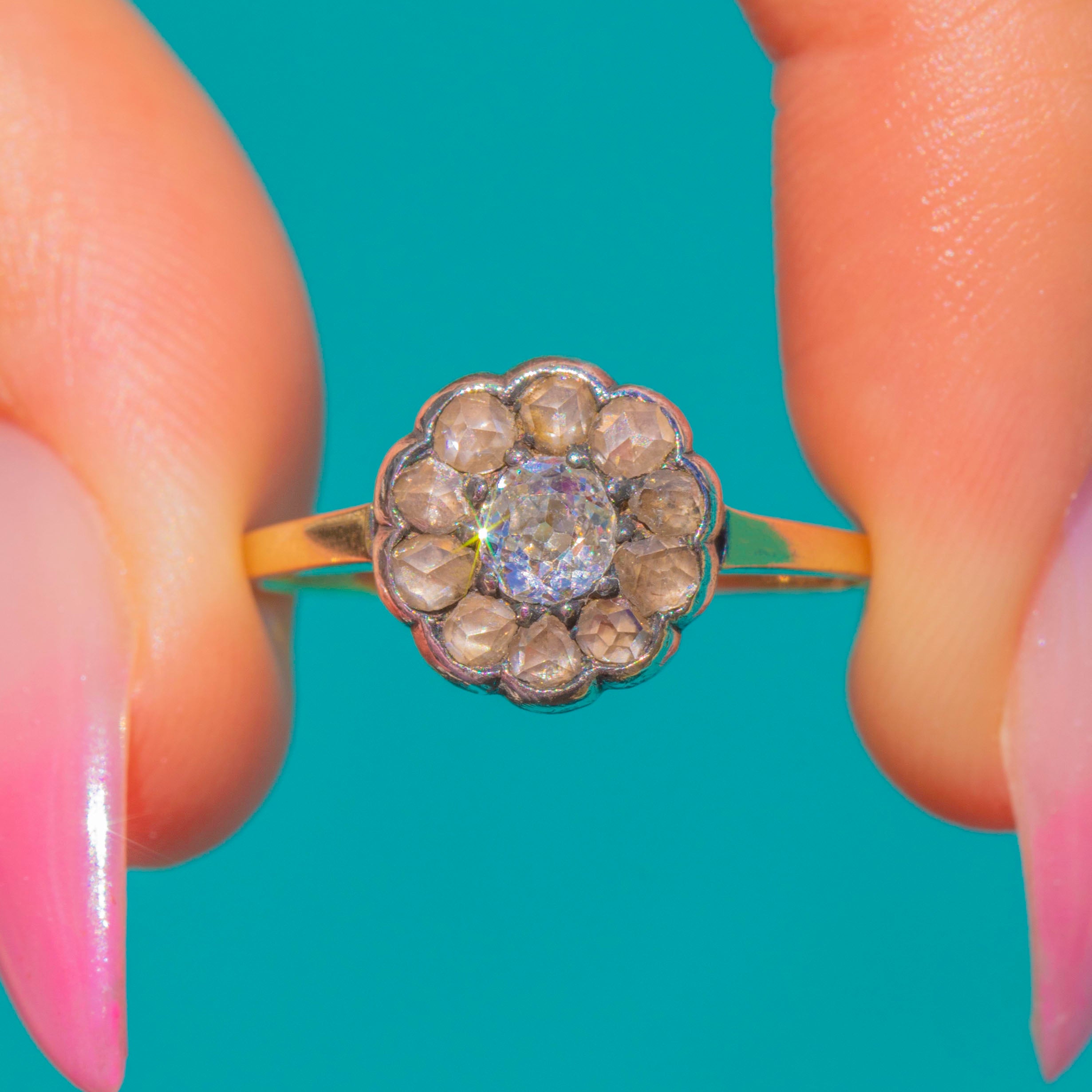 EXCELLENT: The Diamonds present brightly with no obvious chips, and the halo shows only minimal antique surface wear visible under magnification. The scalloped Silver settings and 9ct Gold shank are secure and well-preserved, with a light, even patina to the Silver that enhances the period character. No evidence of resizing or restoration.