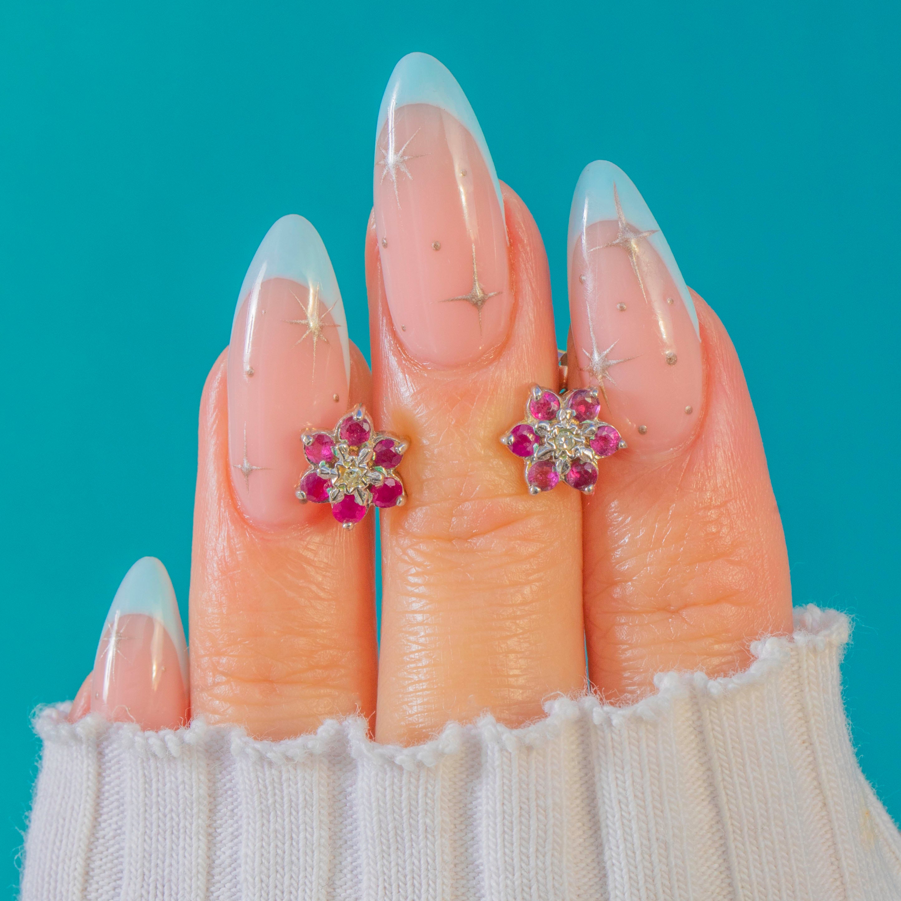 Sweet and sparkling, these 20th-century Vintage Ruby and Diamond cluster studs are a timeless pop of colour for every day. The crisp rosettes glow with vivid pink-red Rubies, punctuated by a twinkle of Diamonds at the centre for a fresh, lively sparkle.