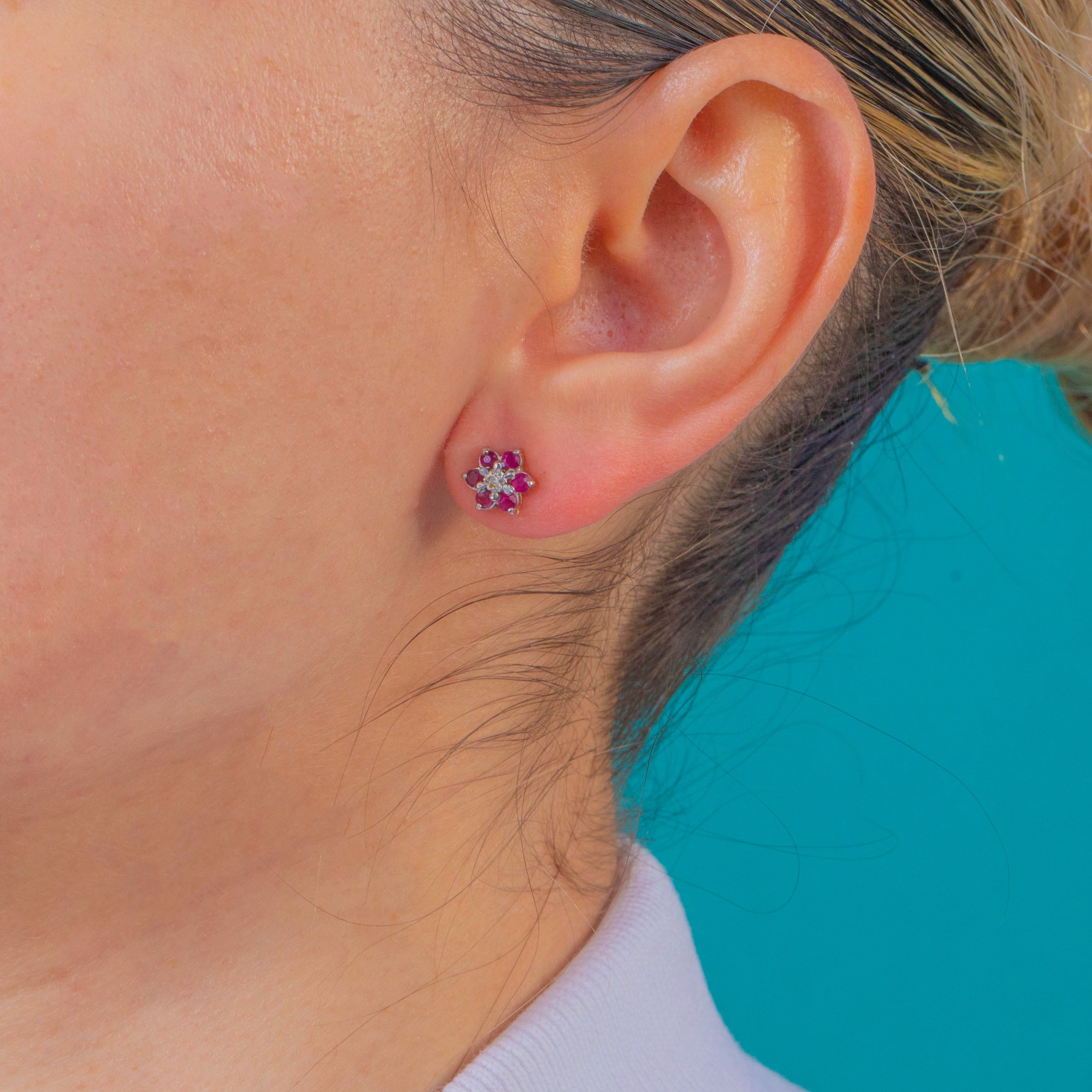 EXCELLENT: Rubies are bright and well-matched with only minor facet abrasions visible under close inspection; Diamonds are lively. The settings and prongs are secure with light, sympathetic surface wear to the metal consistent with careful wear. Posts and butterflies are sound, with no visible repairs or alterations.