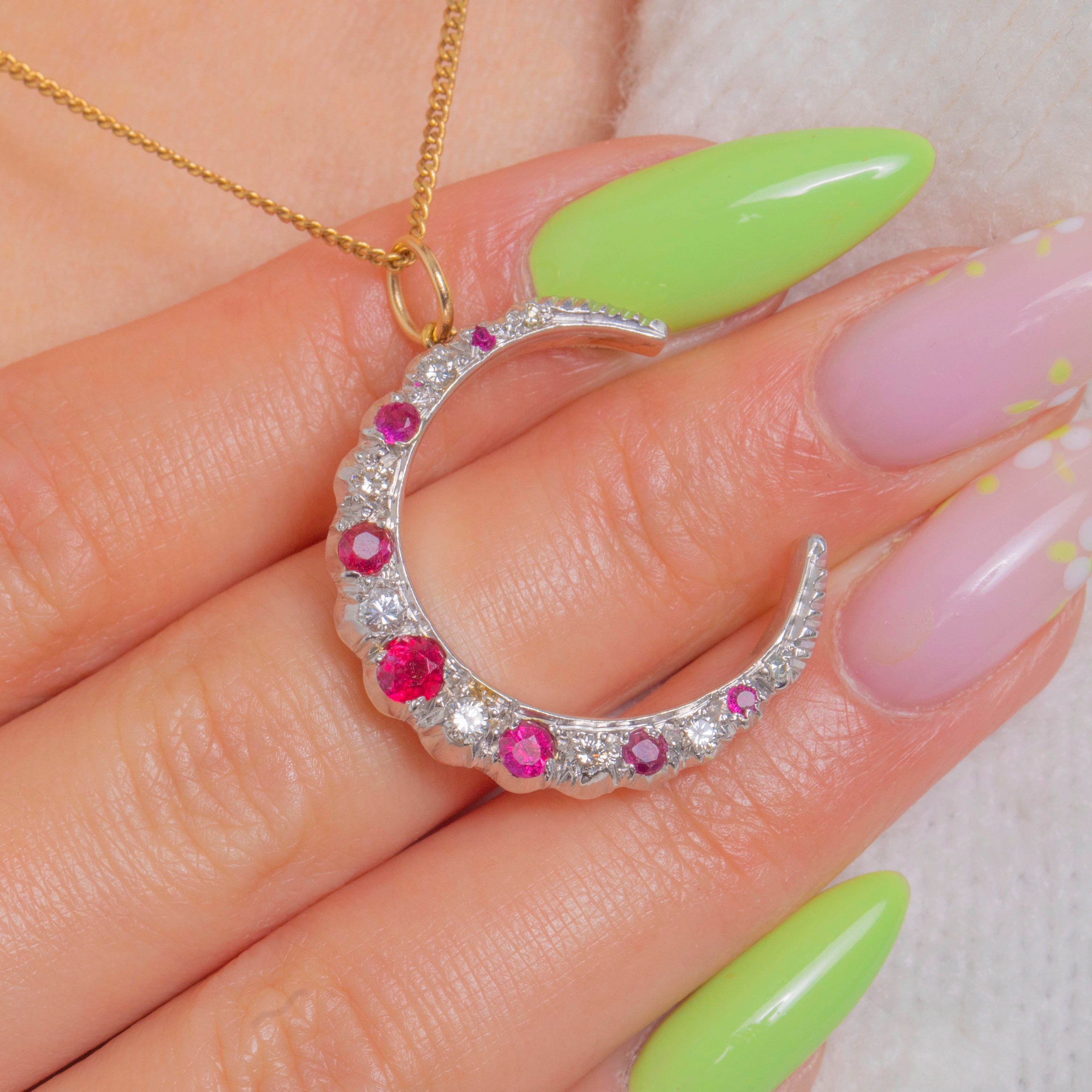 A luminous celestial treasure, this Vintage crescent moon pendant is crafted in two-tone 9ct Gold with a white Gold crescent and yellow Gold accents. The arc is set with a graceful graduation of bright Rubies and sparkling Diamonds in scalloped settings, lending a romantic Victorian-revival feel with crisp milgrain detail. Vivid reds play beautifully against icy white brilliance, creating an elegant, timeless glow.