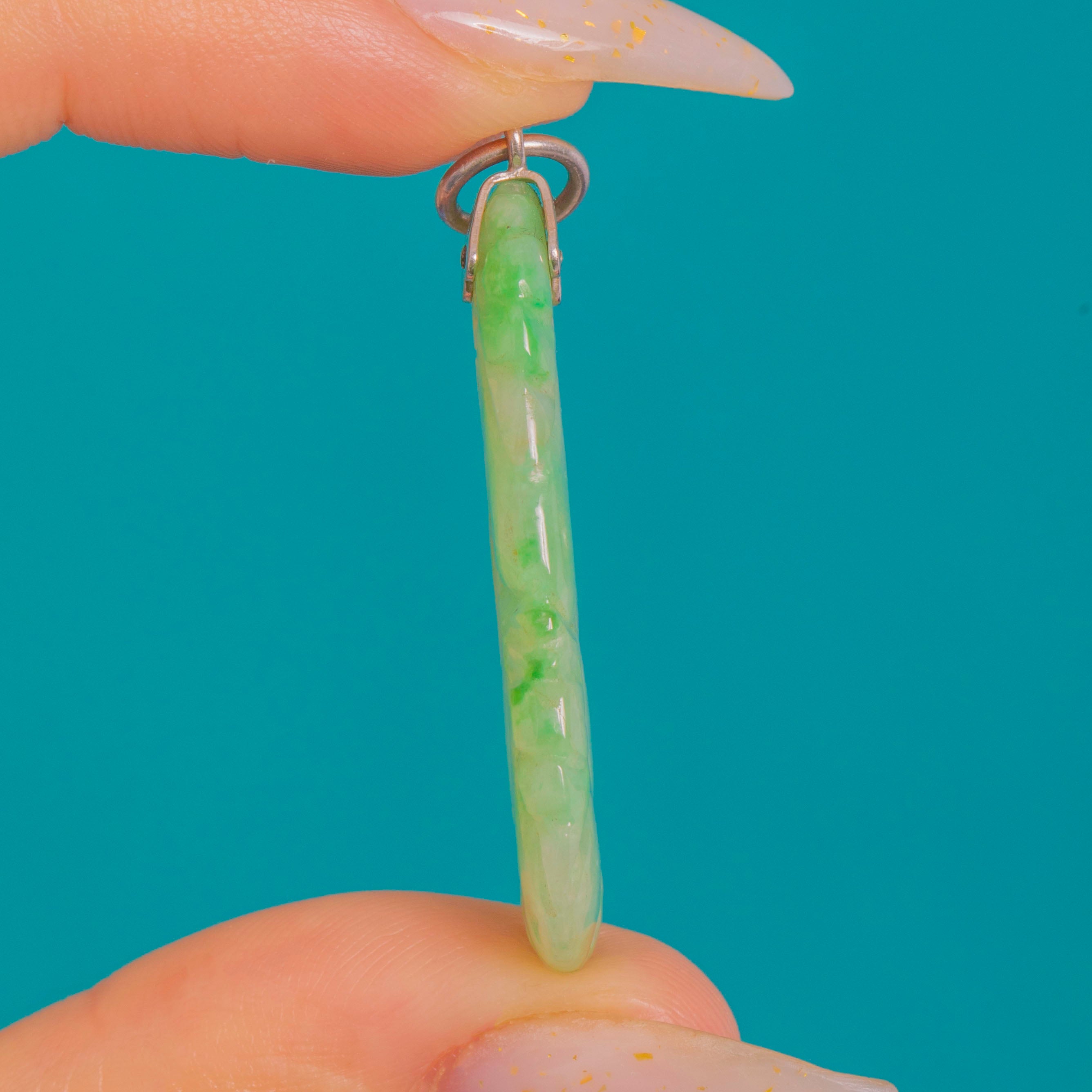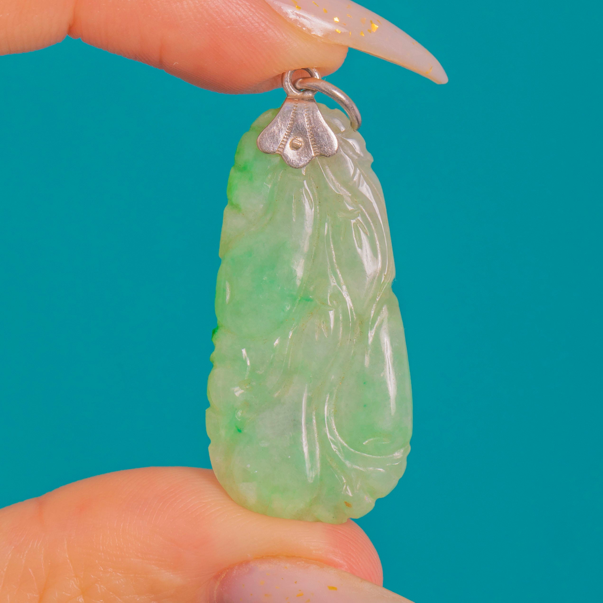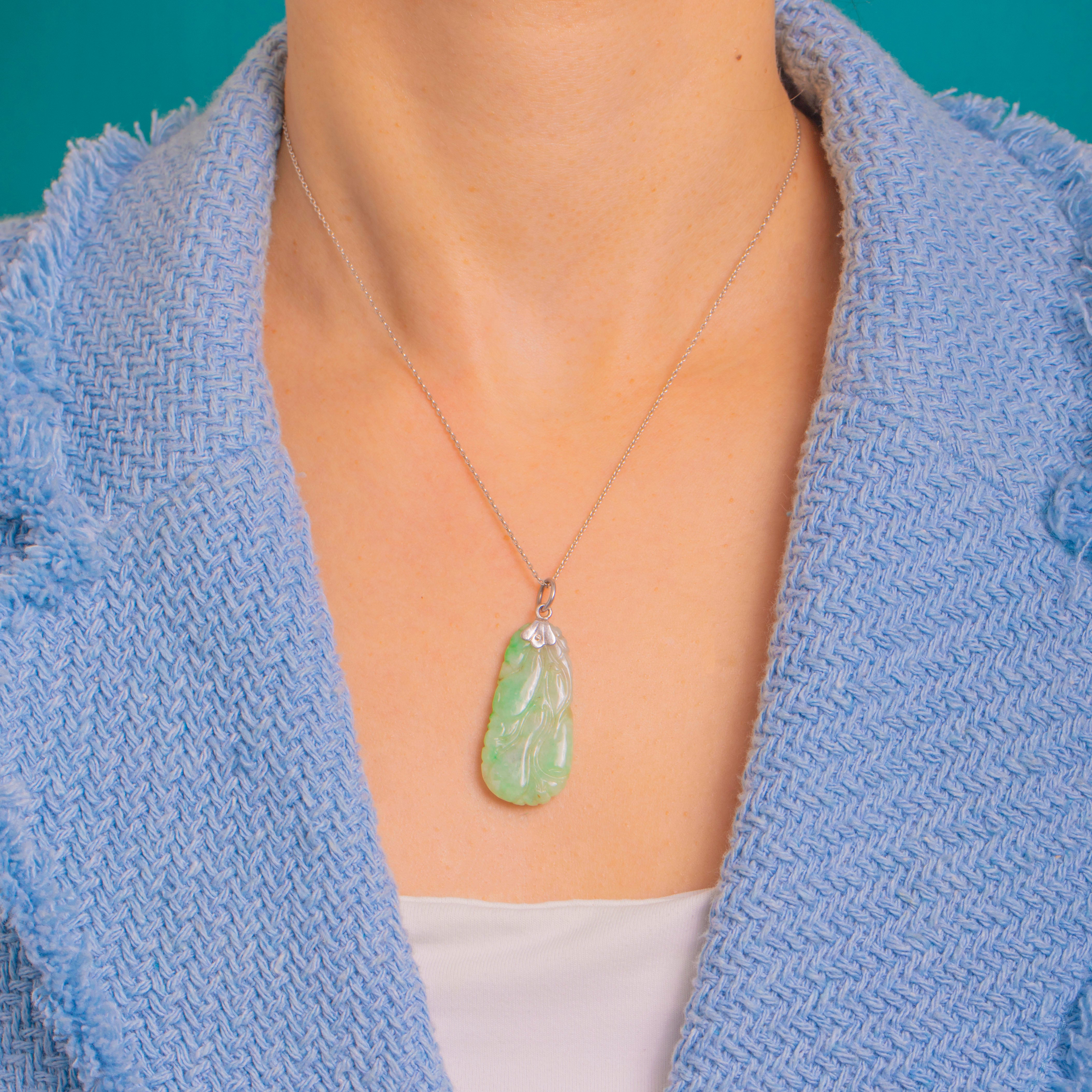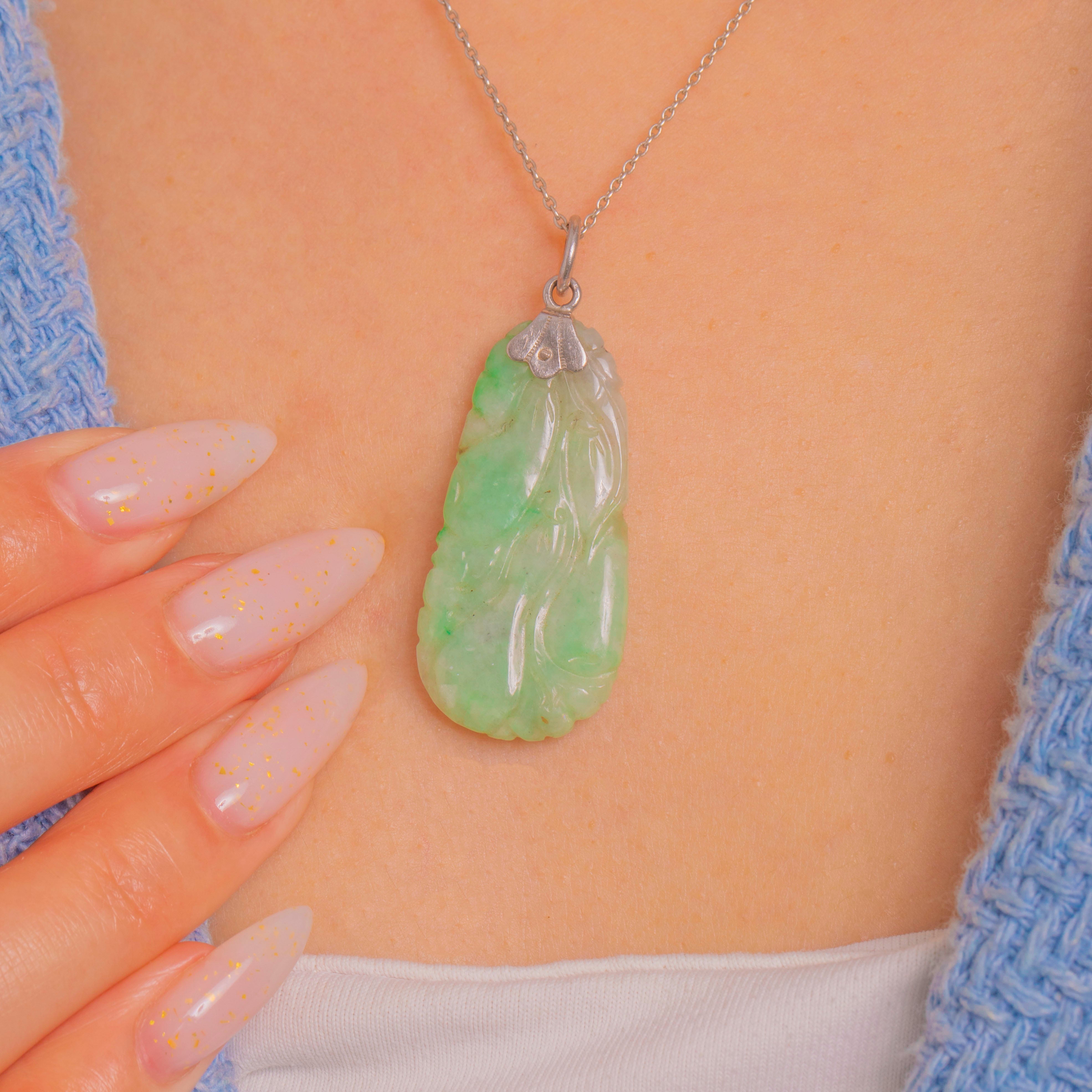 A graceful Art Deco carved Jade drop pendant, its elongated silhouette alive with soft, organic carvings. The semi‑translucent green Jade shows beautiful natural mottling and milky clouds that catch the light with a gentle glow.