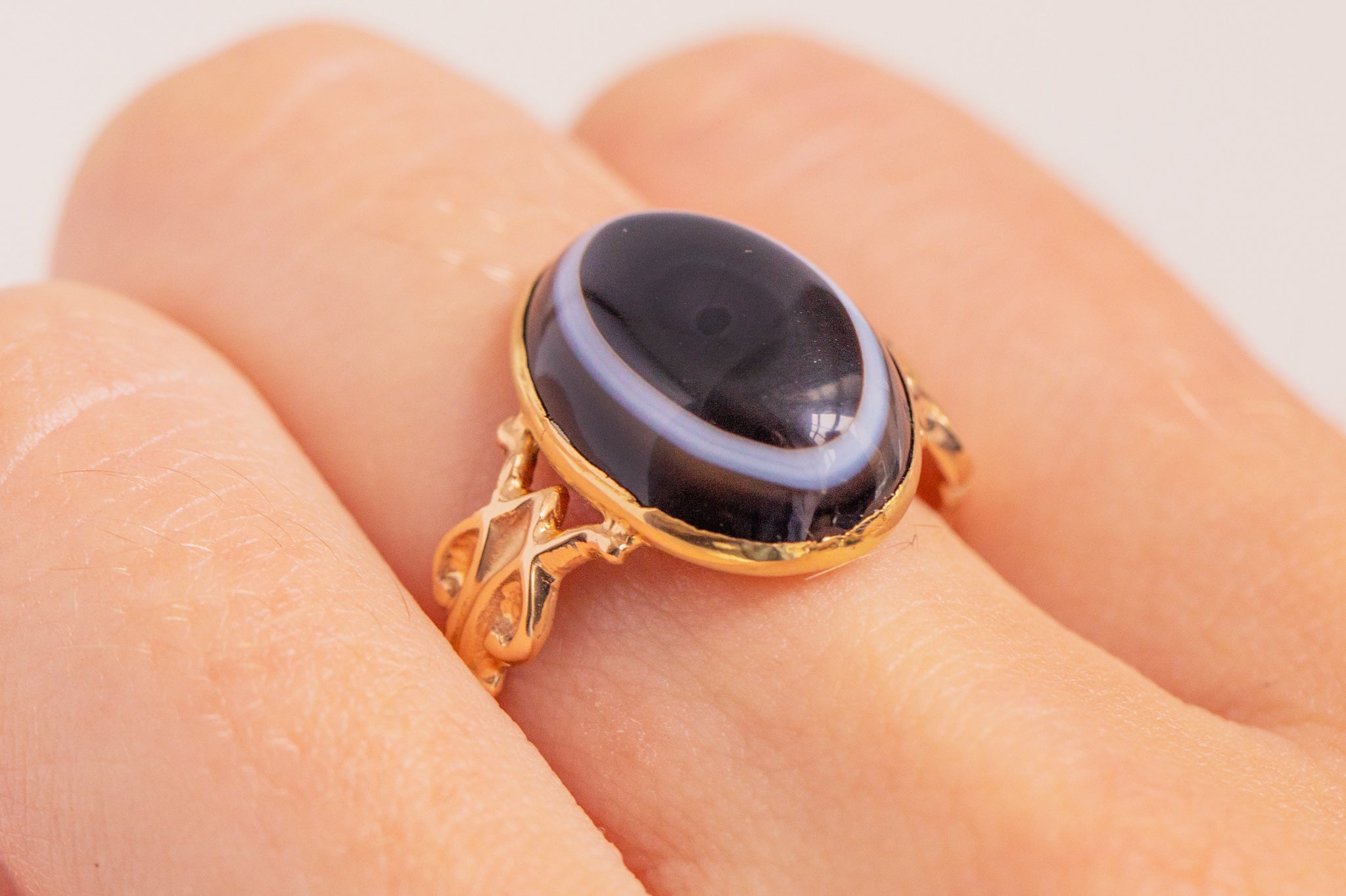 This is a gorgeous antique 15ct Gold banded Agate ring! This piece is classically Victorian in style, and we adore the mahogany brown and milky white hues running through the Agate.
