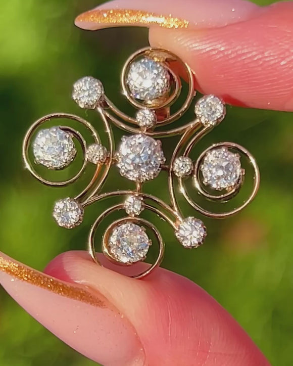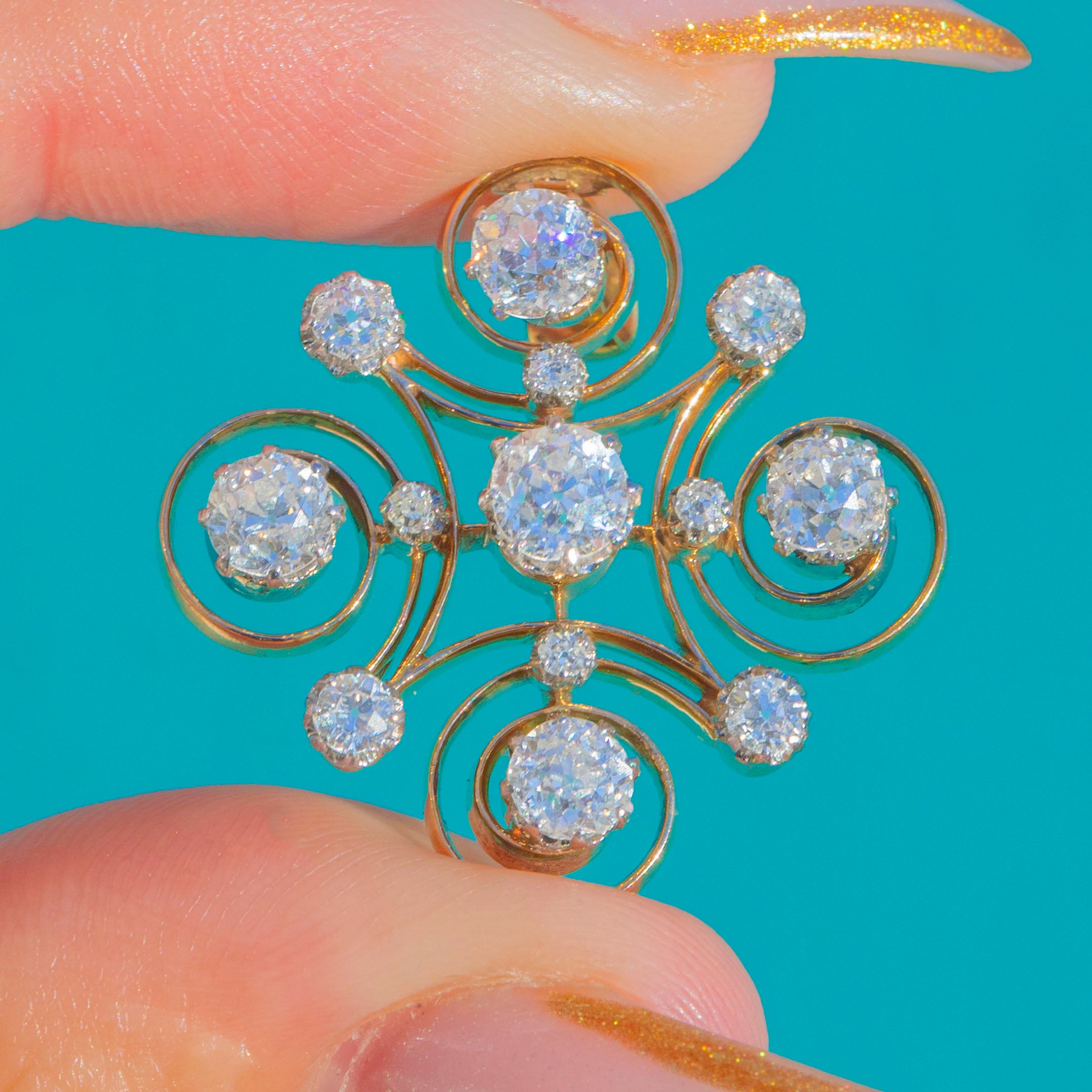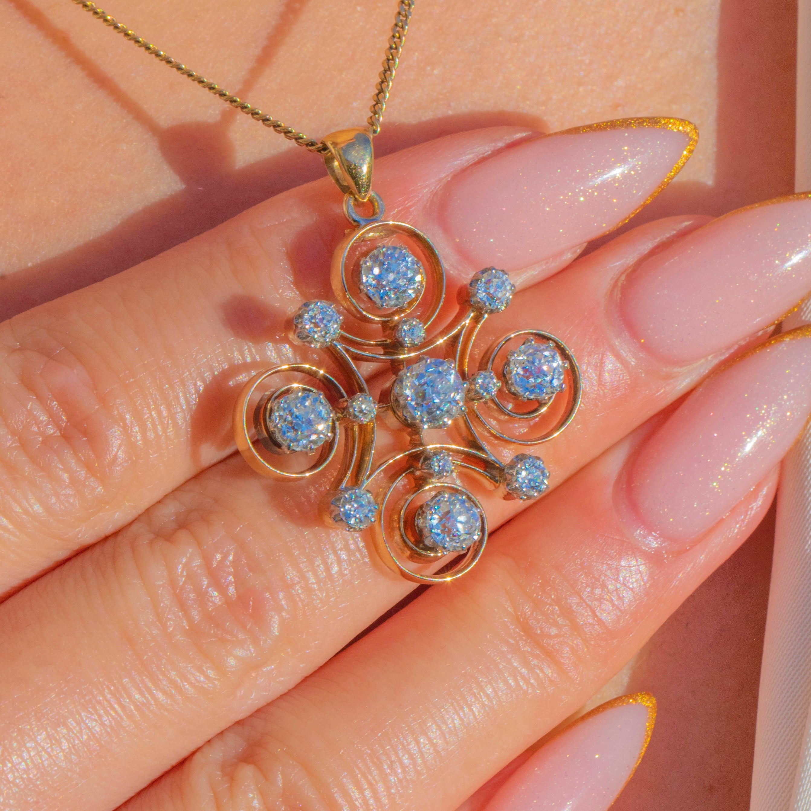 This exquisite Victorian old mine-cut Diamond jewel is crafted in 15ct Gold and designed as an elegant scrolling cross motif, set throughout with bright, lively Diamonds. Circa 1890, she blends classic antique Diamonds of the late 18th Century with swirling Art Nouveau influences from the Continent.