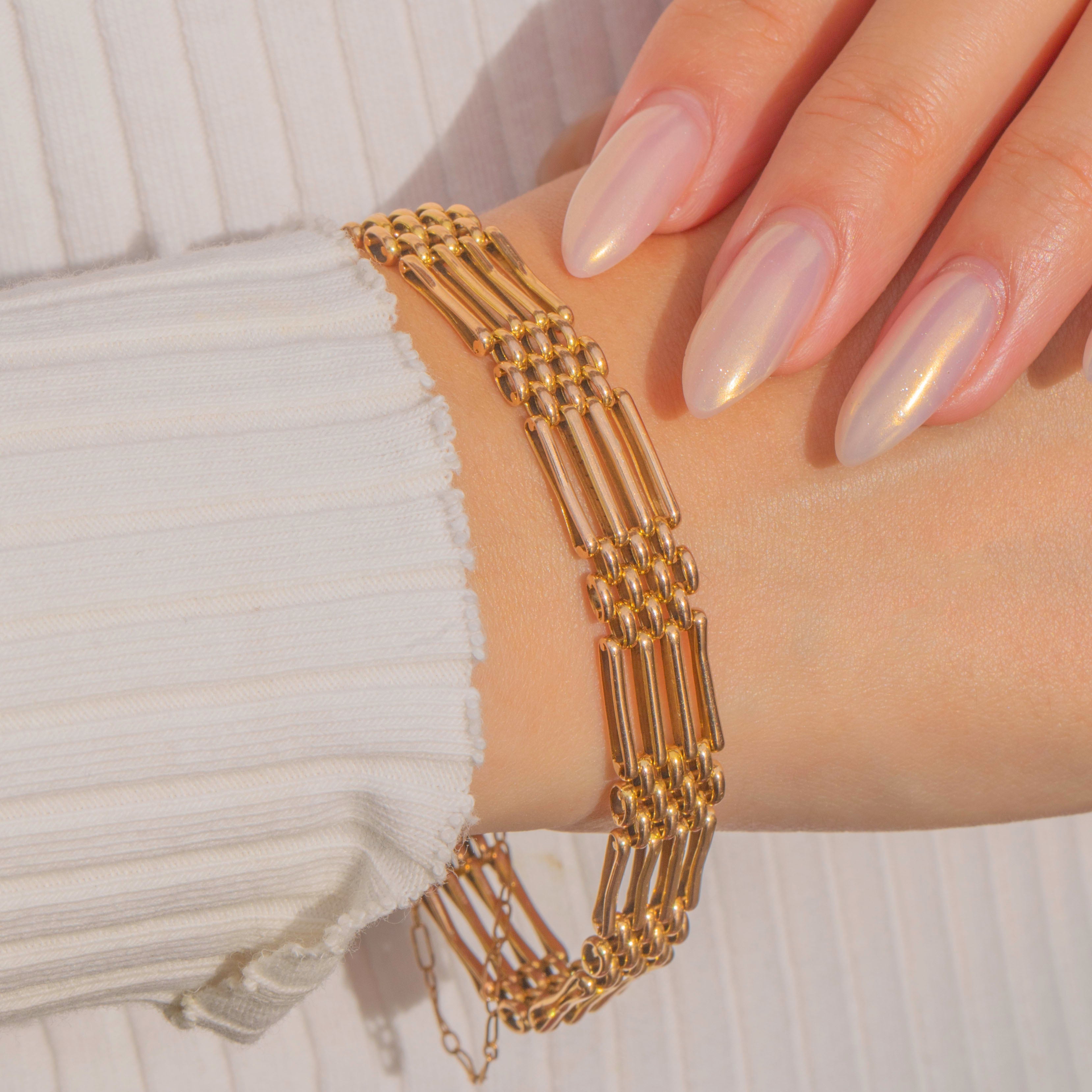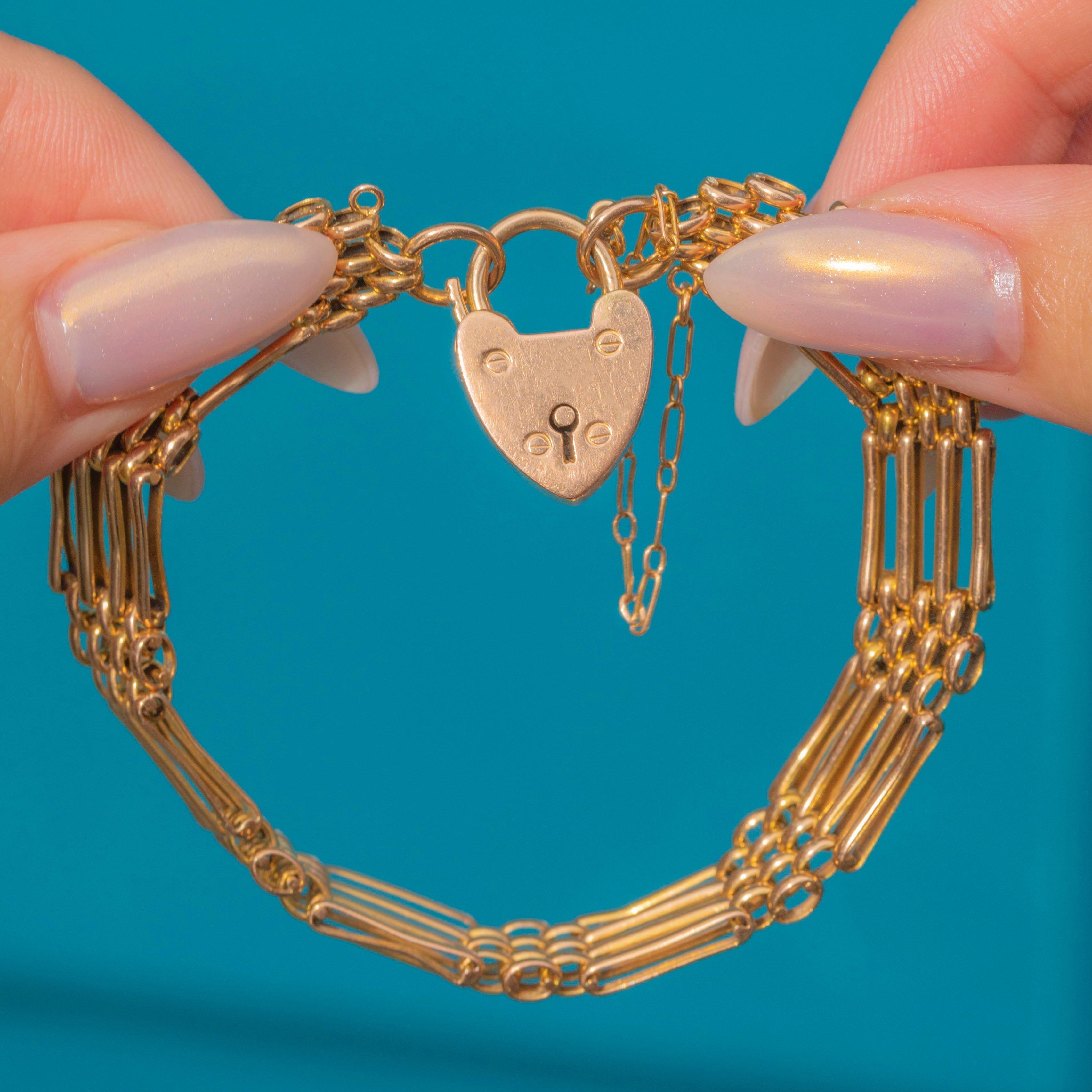 A superb Antique Victorian gate bracelet crafted in solid 15ct Gold, finished with a romantic heart padlock clasp. The classic multi-bar gate design offers both strength and elegance, with beautifully interlinked sections that drape fluidly around the wrist. A traditional symbol of love and commitment, the heart padlock clasp adds a sentimental touch and is fully functional.