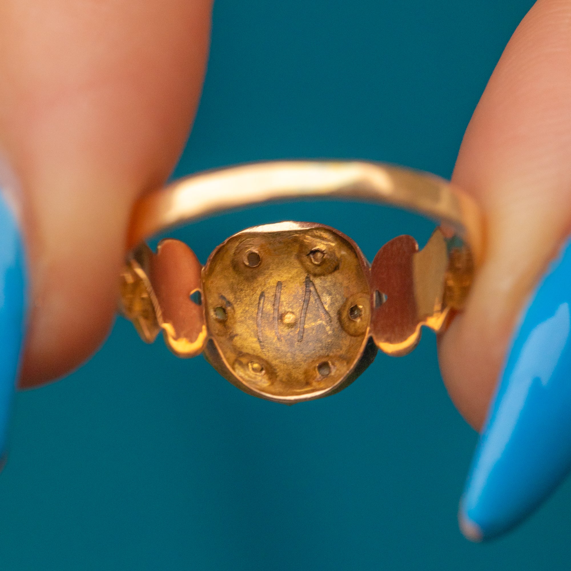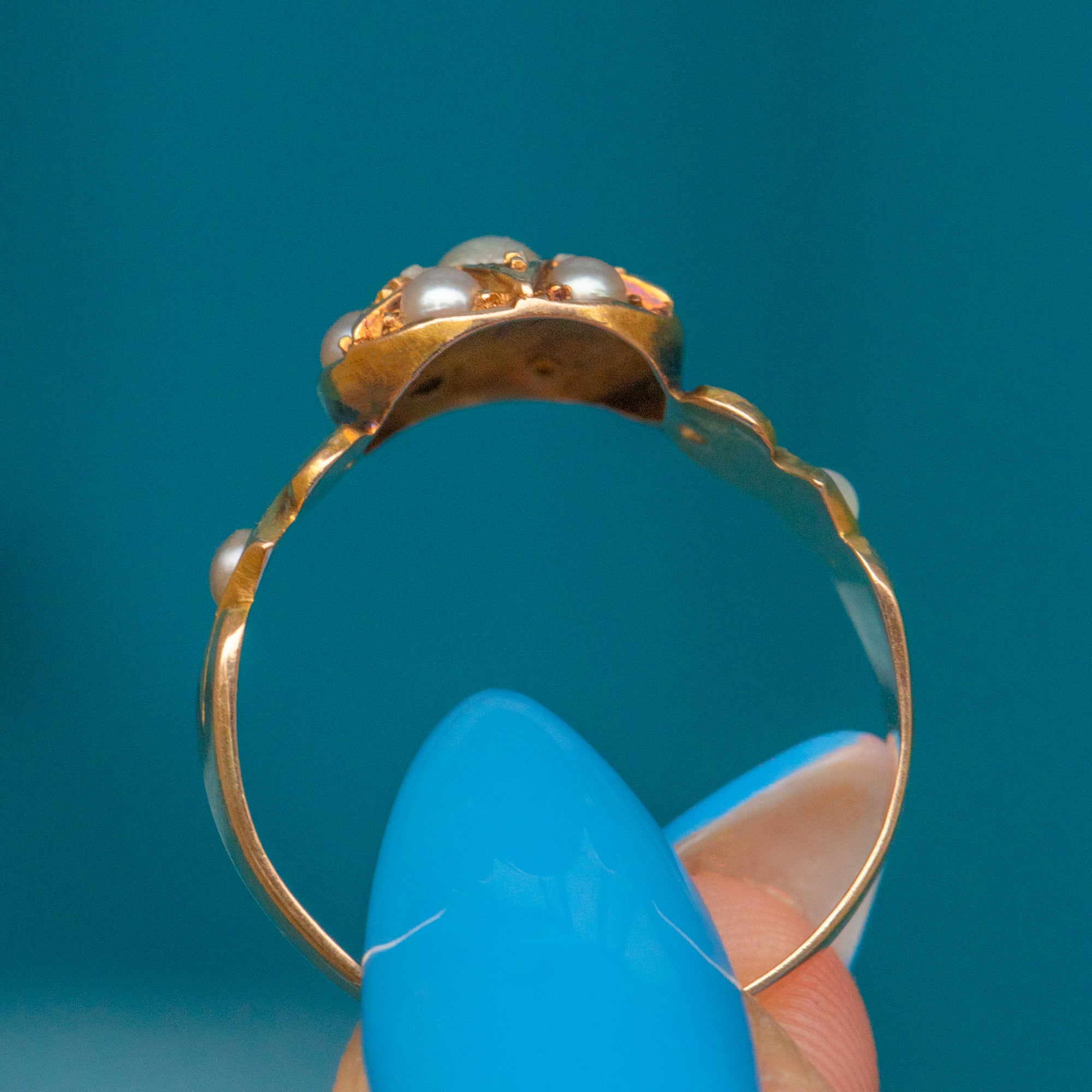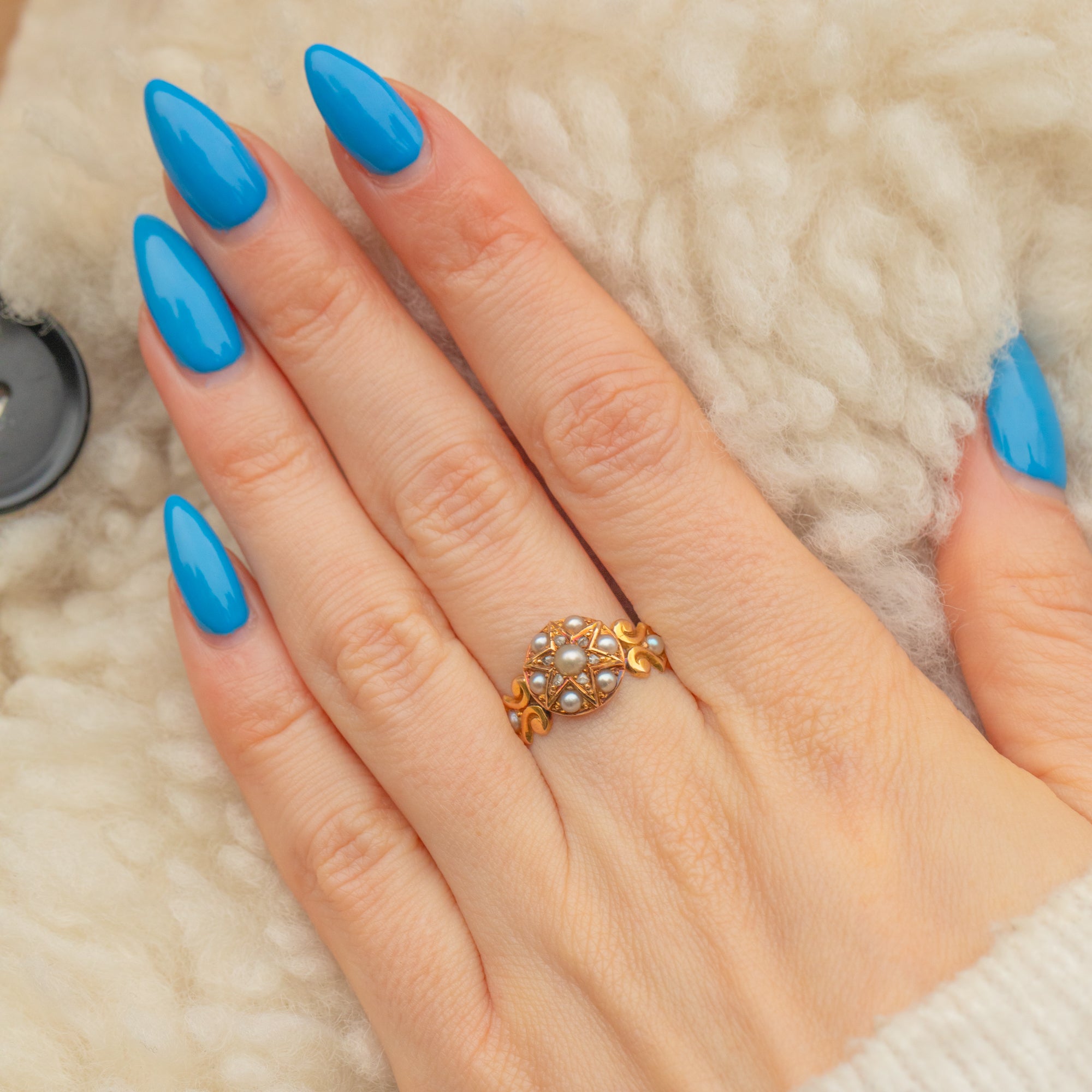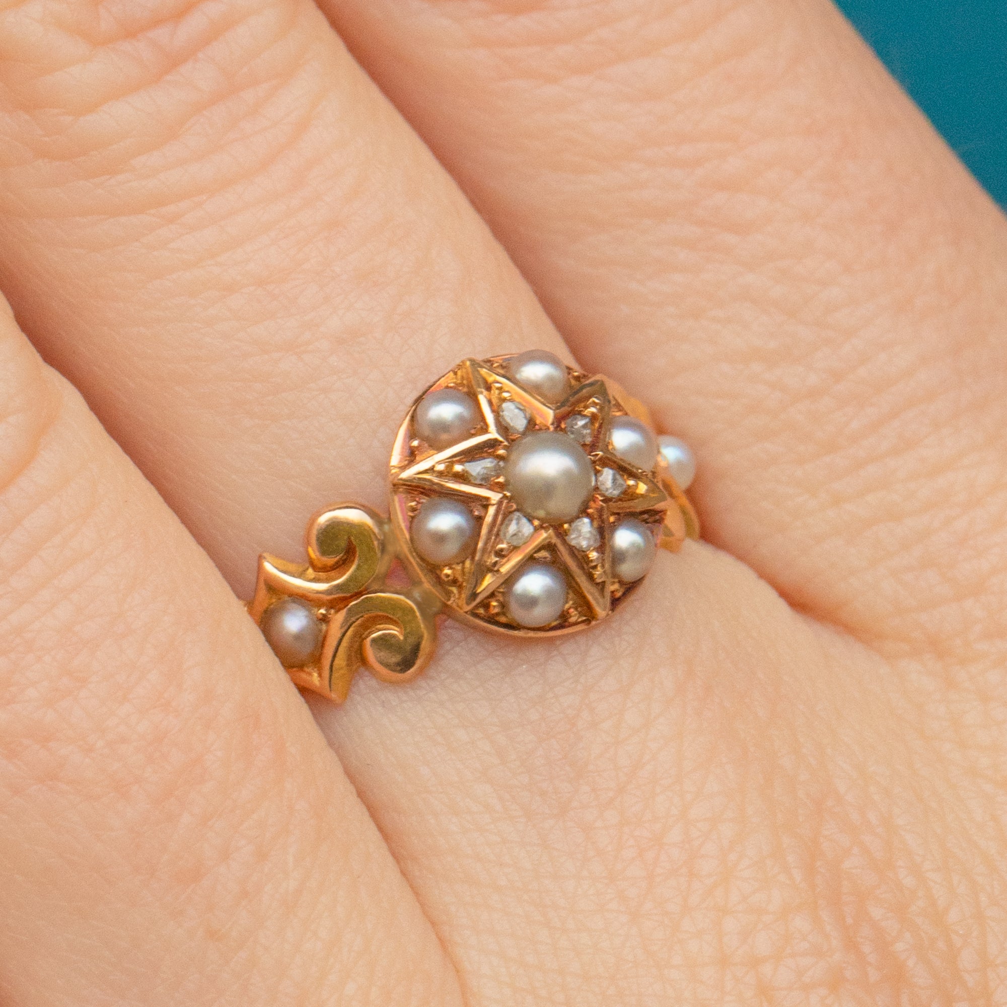 EXCELLENT. This antique 15ct Gold Pearl Diamond star cluster ring is in excellent condition. The front of the ring is absolutely lovely, with crisp details and silvery Pearls. The Pearls and Diamonds are all present and securely set, free from any signs of wear. There is some minor wear on the back of the setting, commensurate with age, but this in no way impacts the integrity of the ring and cannot be seen during wear. The band has held its form well and feels comfortable on the finger when worn.