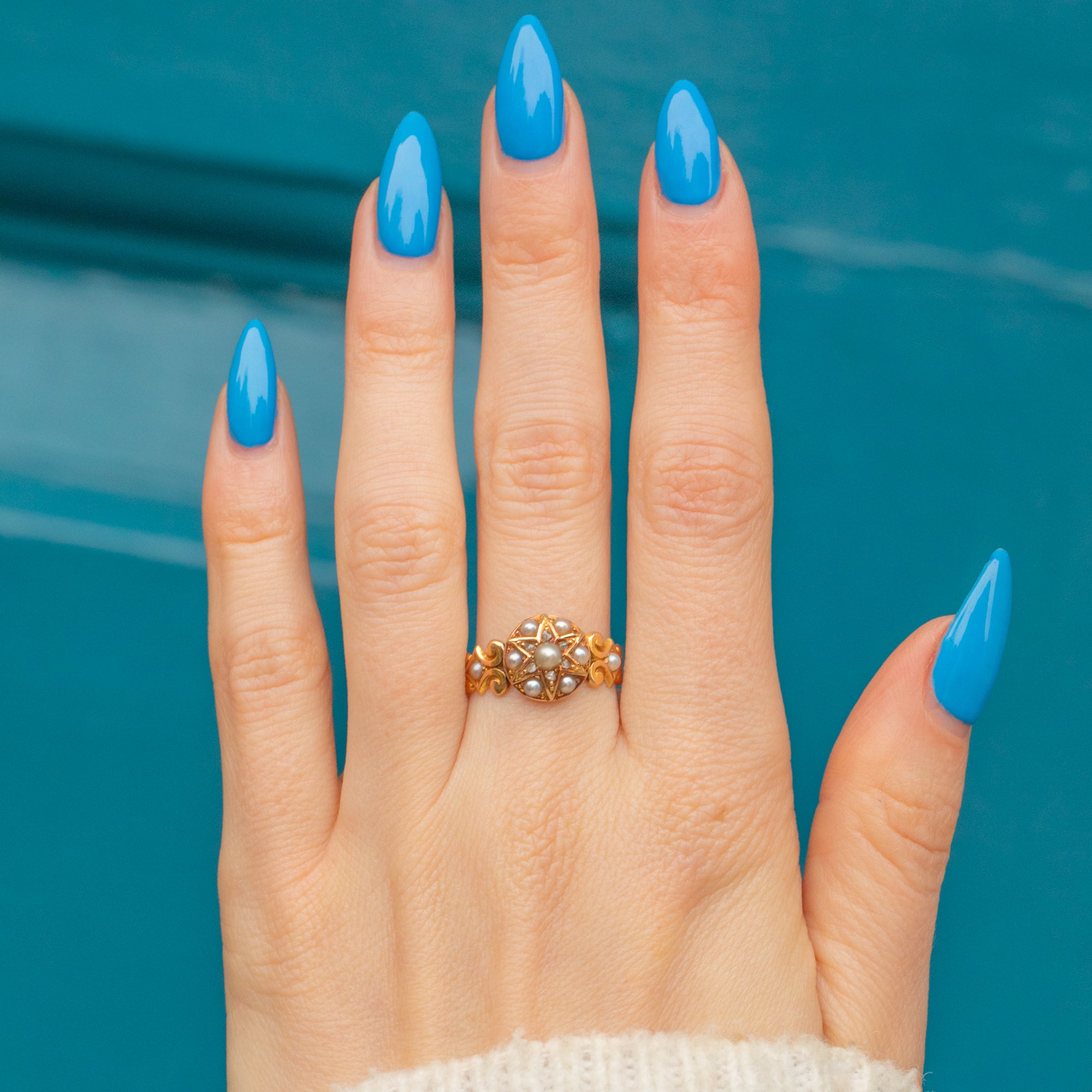 The central cluster features a bold star design, flanked by ornately formed shoulders that will bring whimsy to your hand. Boasting charming details and an elegant colour palette, this Victorian Pearl ring will provide you with endless wearing pleasure!