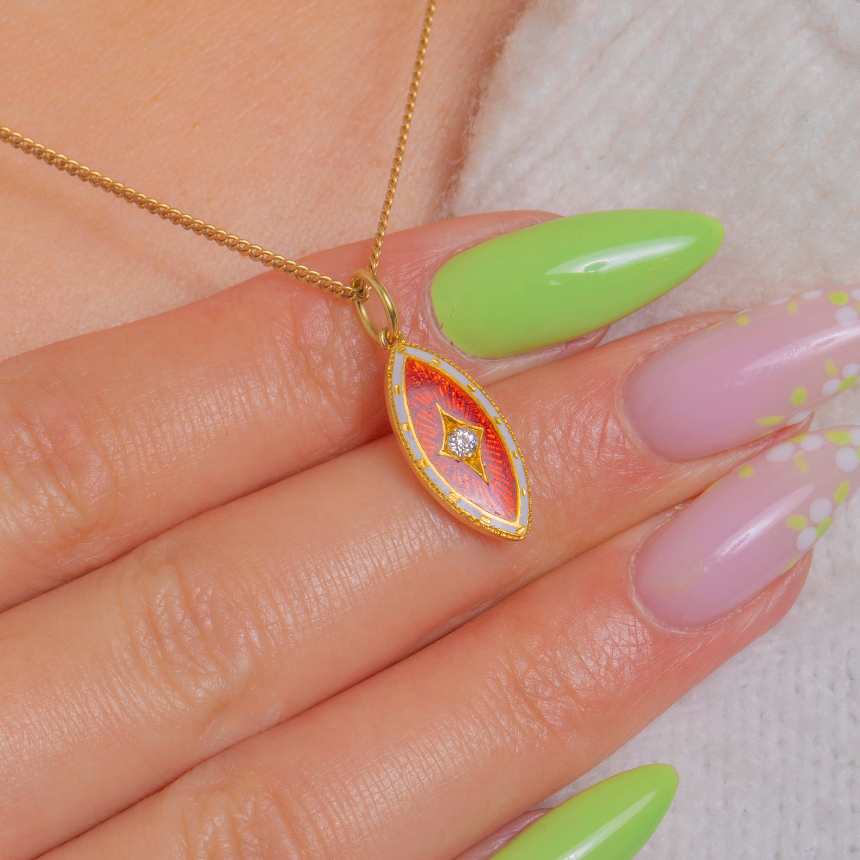 Brimming with Edwardian elegance, this petite navette charm glows with rich translucent red guilloché Enamel framed by a fine white Enamel border and dainty milgrain. At its heart sits a twinkling Diamond in a raised square setting, lending a crisp point of light to the warm 15ct Gold.