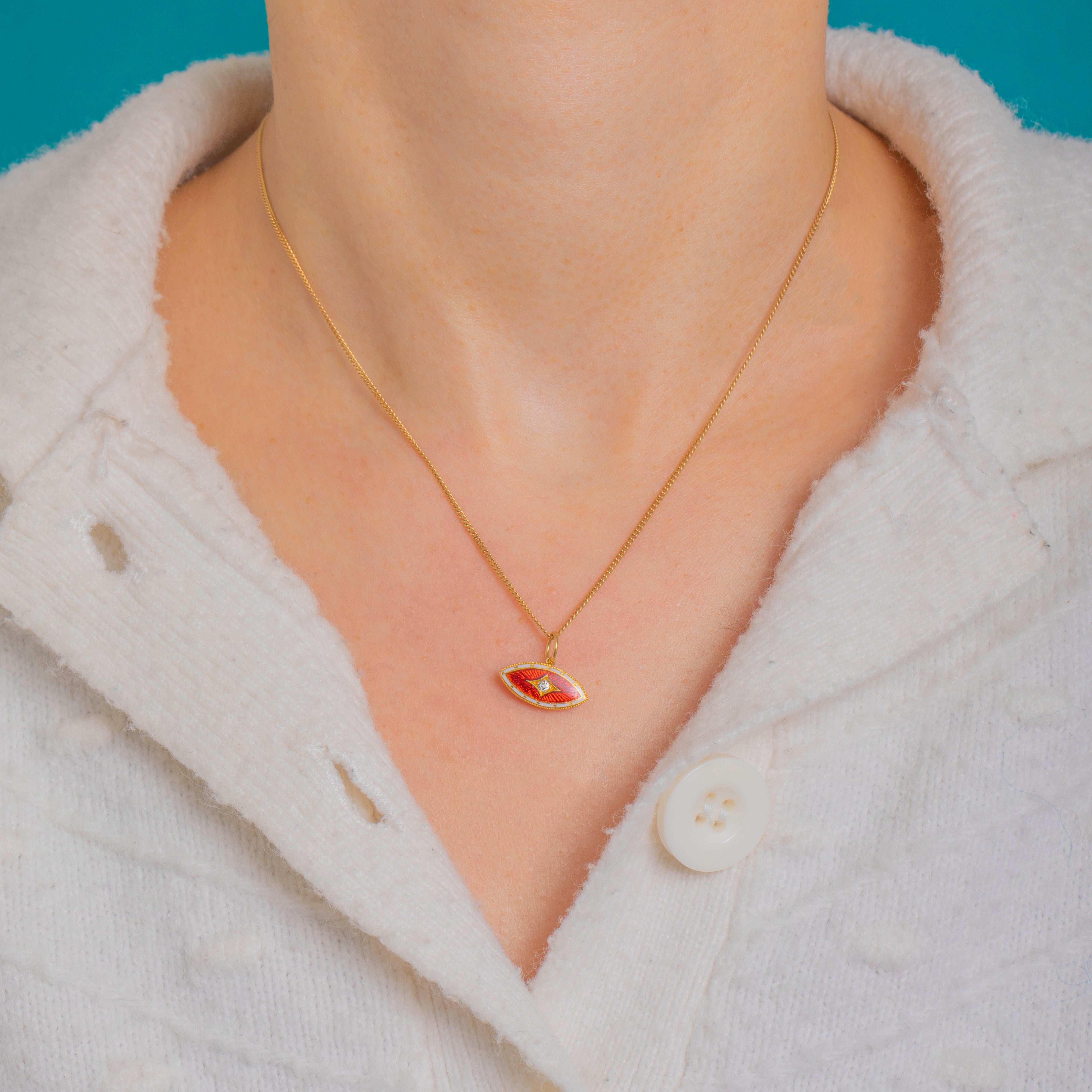 A dainty jewel with a decadent splash of colour, this Edwardian charm is crafted in 15ct Gold and finished with sumptuous translucent red guilloché Enamel. A fine white Enamel border and delicate milgrain edge frame the marquise silhouette beautifully, drawing the eye to a single sparkling Diamond set in a star‑shaped lozenge at the centre.