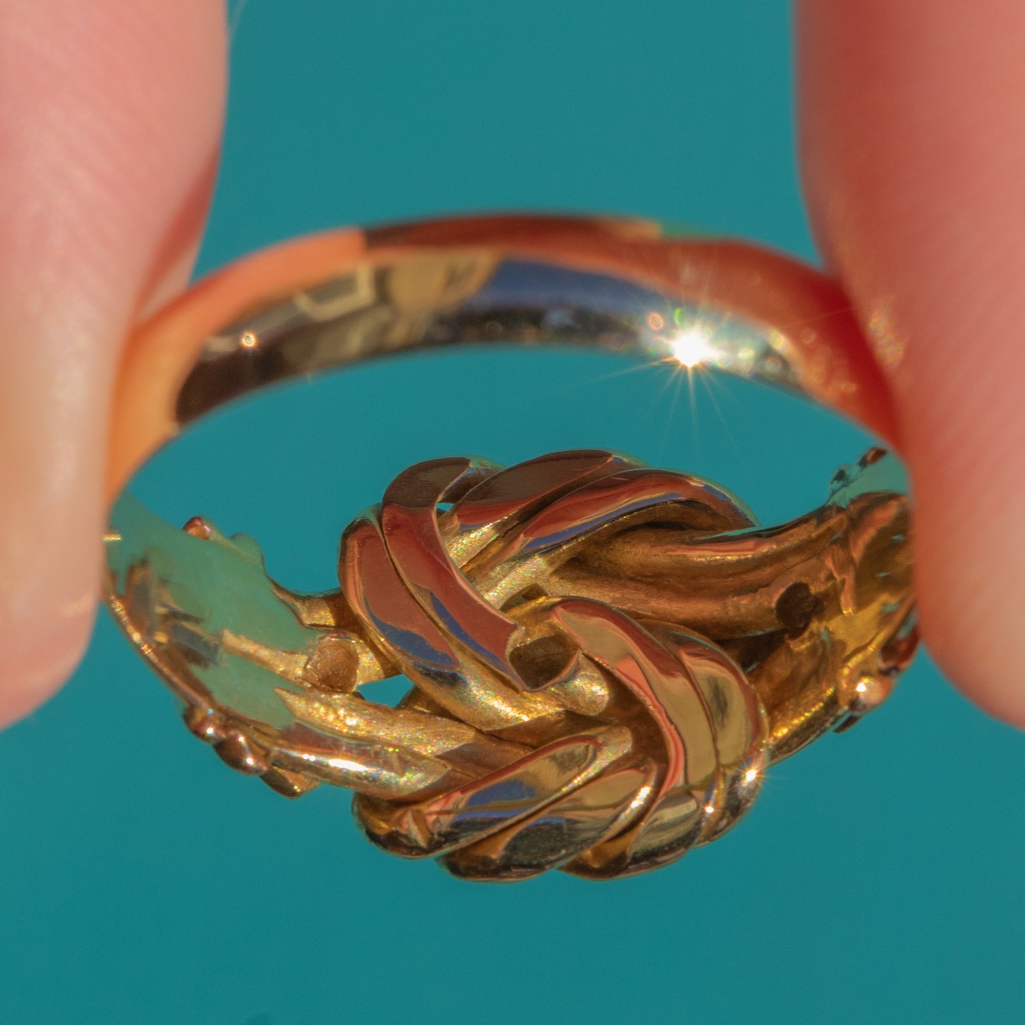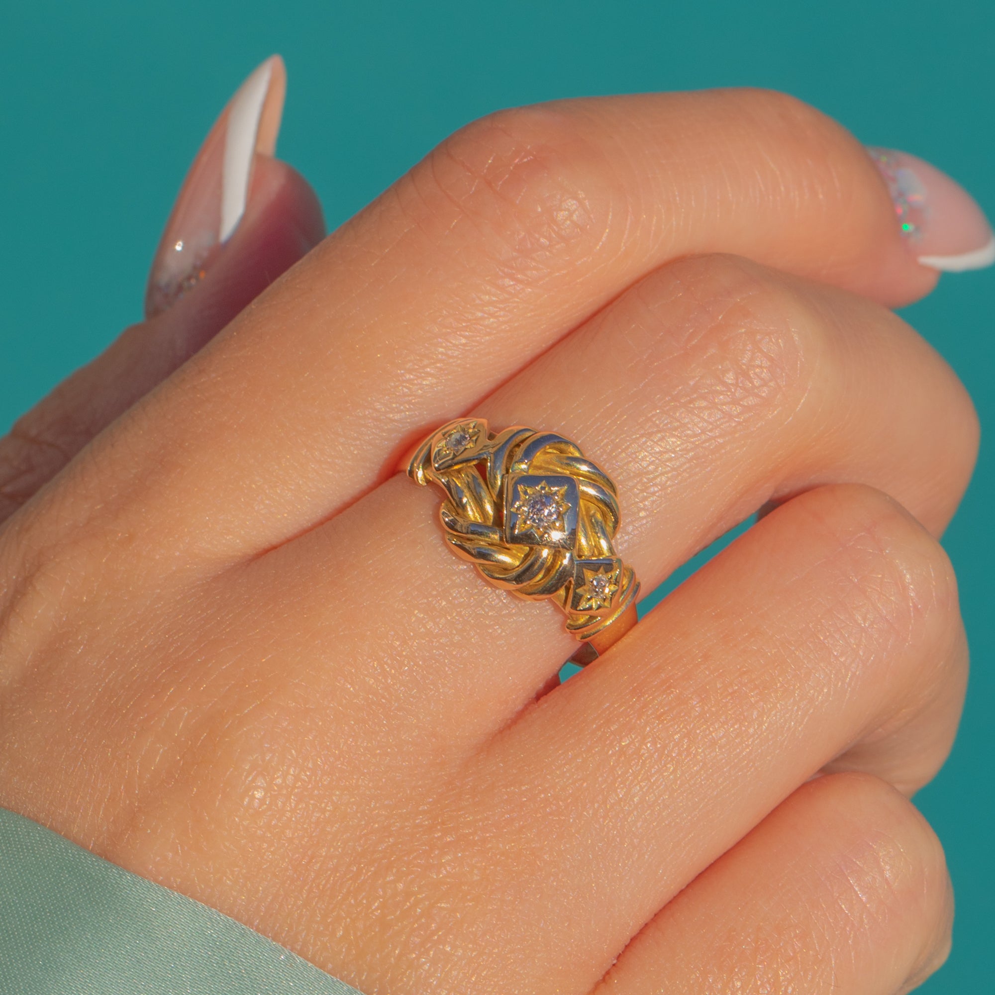 This Antique 18ct Gold Diamond Knot Ring is a wonderfully romantic Chester piece, crafted in 1911. The knot motif is richly modelled in flowing, interlaced Gold, symbolising eternal love and commitment, while sparkling old mine cut Diamonds are star-set into angular panels for a crisp, celestial touch.
