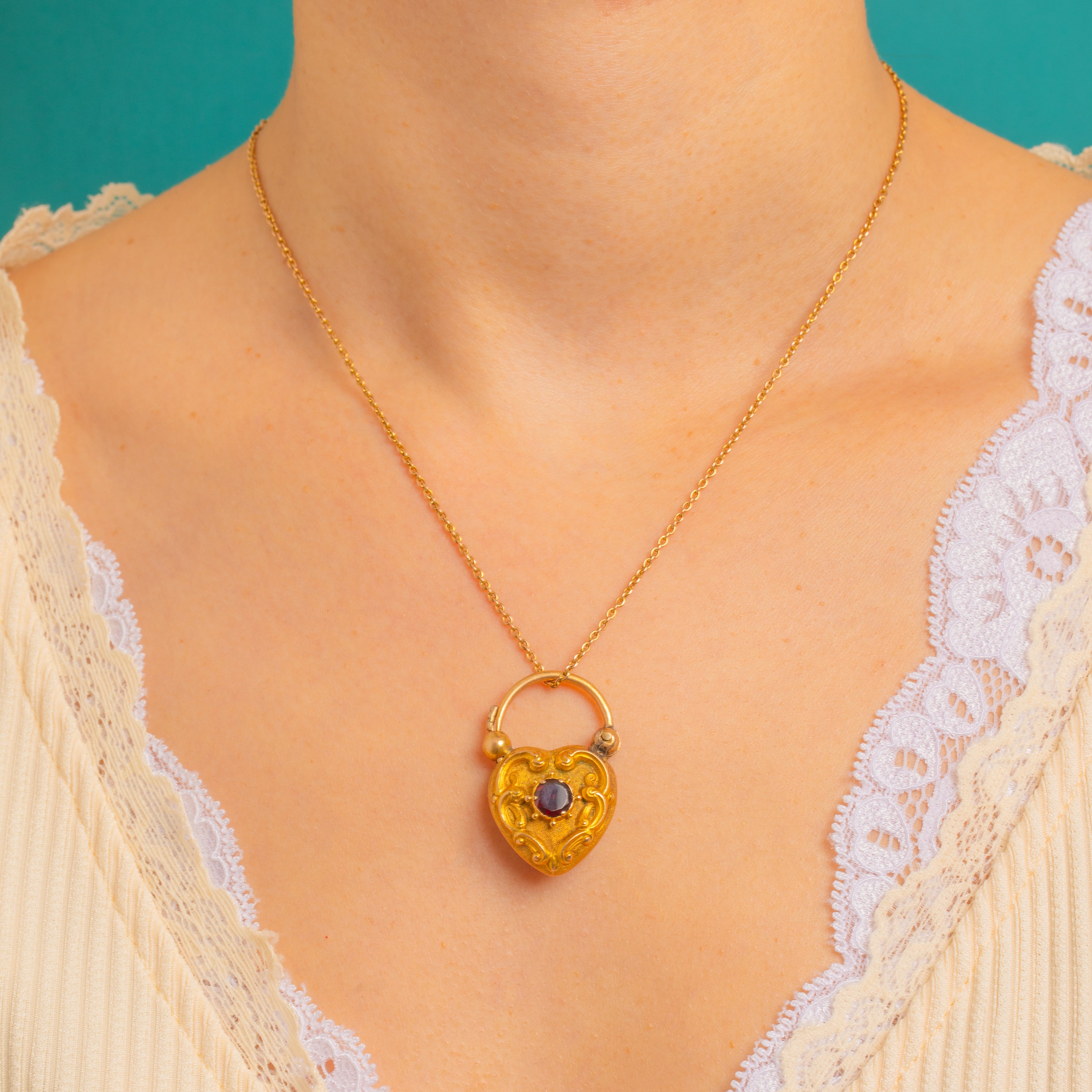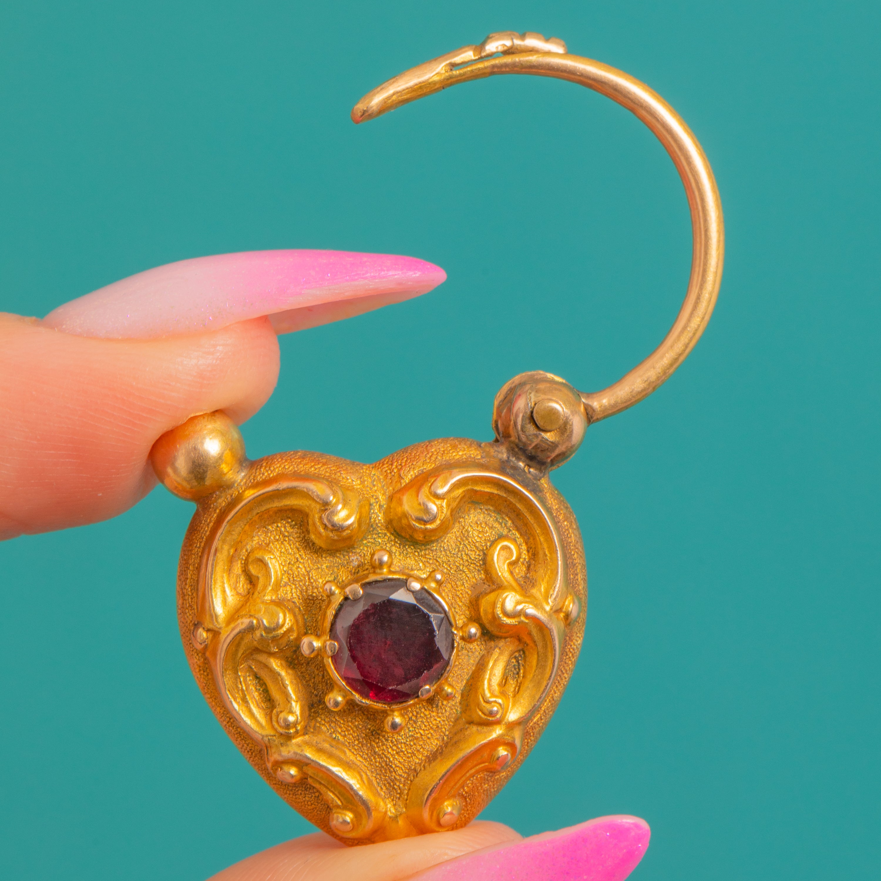 Romance and craftsmanship entwine in this Victorian 18ct Gold heart padlock, richly ornamented with scrolling foliate motifs over a softly textured ground. At the centre sits a round Garnet of deep, wine-red hue that glows against the warm Gold, its bezel framed with delicate beaded accents for a refined, heirloom feel.