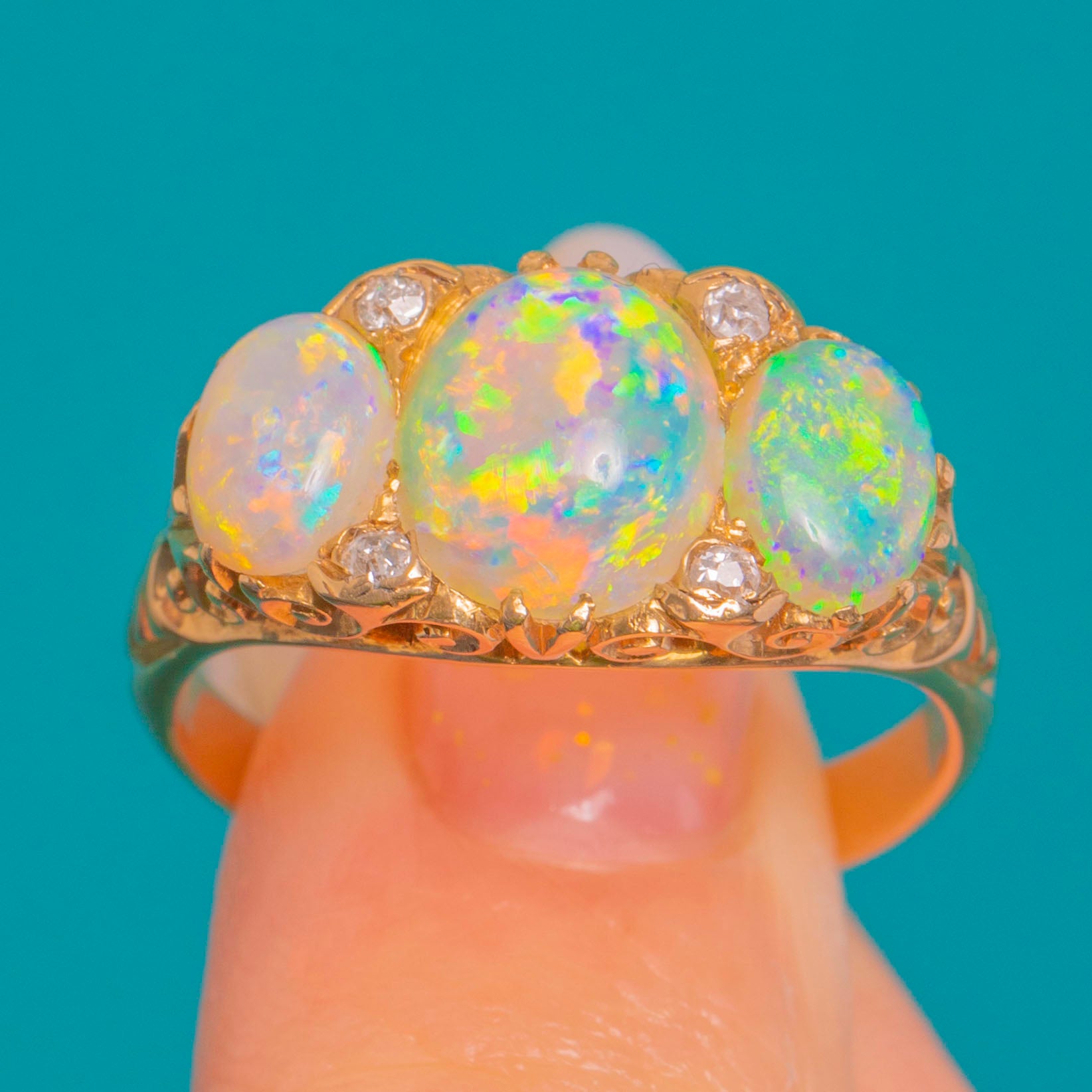 A luminous Victorian boat ring in 18ct Gold, alive with the electric play-of-colour only fine Opals can deliver. Three graduated oval Opal cabochons glow with shifting greens, oranges and reds, punctuated by tiny Diamond accents that add a delicate sparkle between the stones. The low ring face glides across the finger, beautifully framed by a pierced scroll gallery and foliate-carved shoulders for that romantic antique flourish.