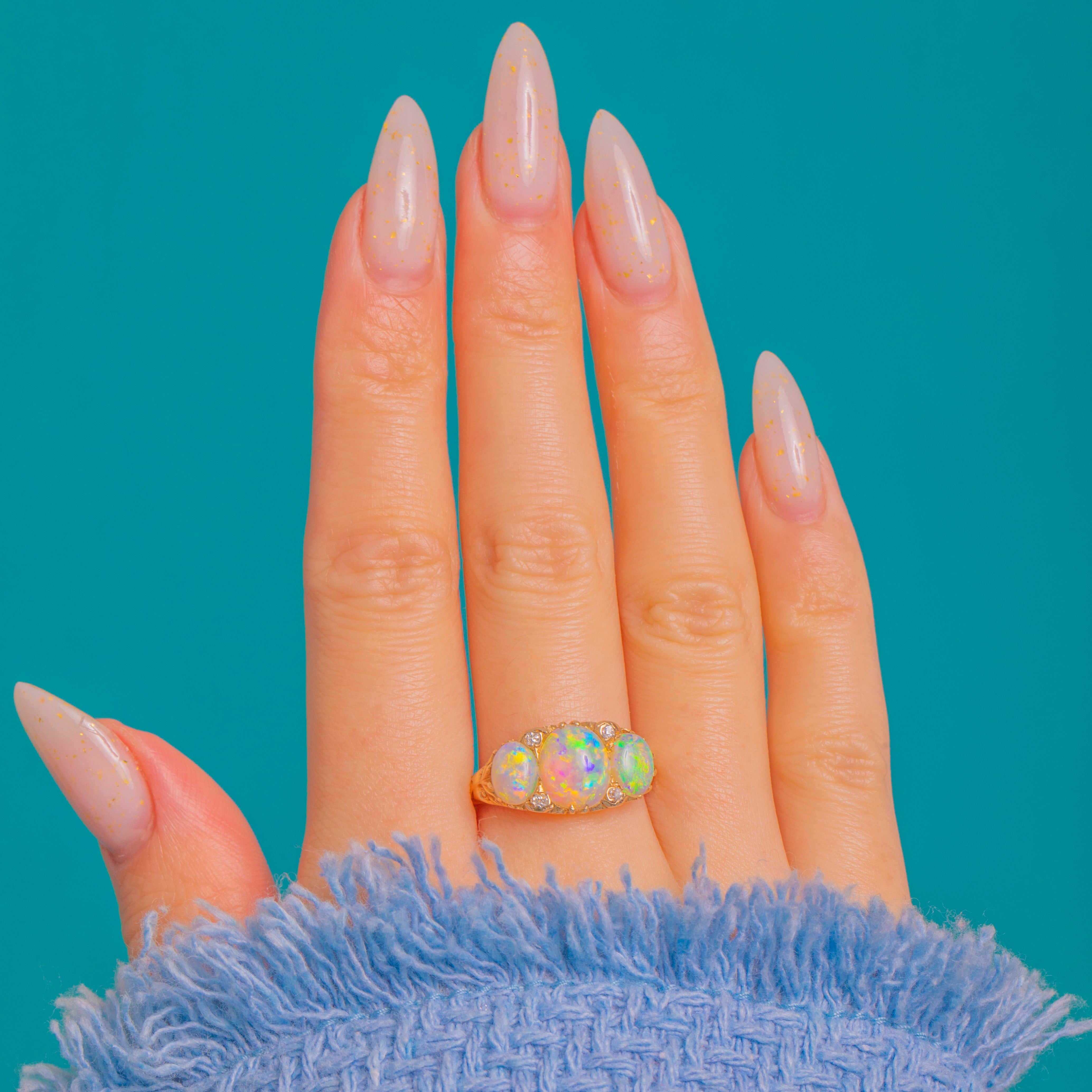 Expertly crafted with open backs and neat claws, the ring tapers to a comfortable shank while keeping all eyes on those vivid Opals. A timeless Victorian treasure with elegant proportions and ornate detailing, perfect for lovers of classic antique glamour.