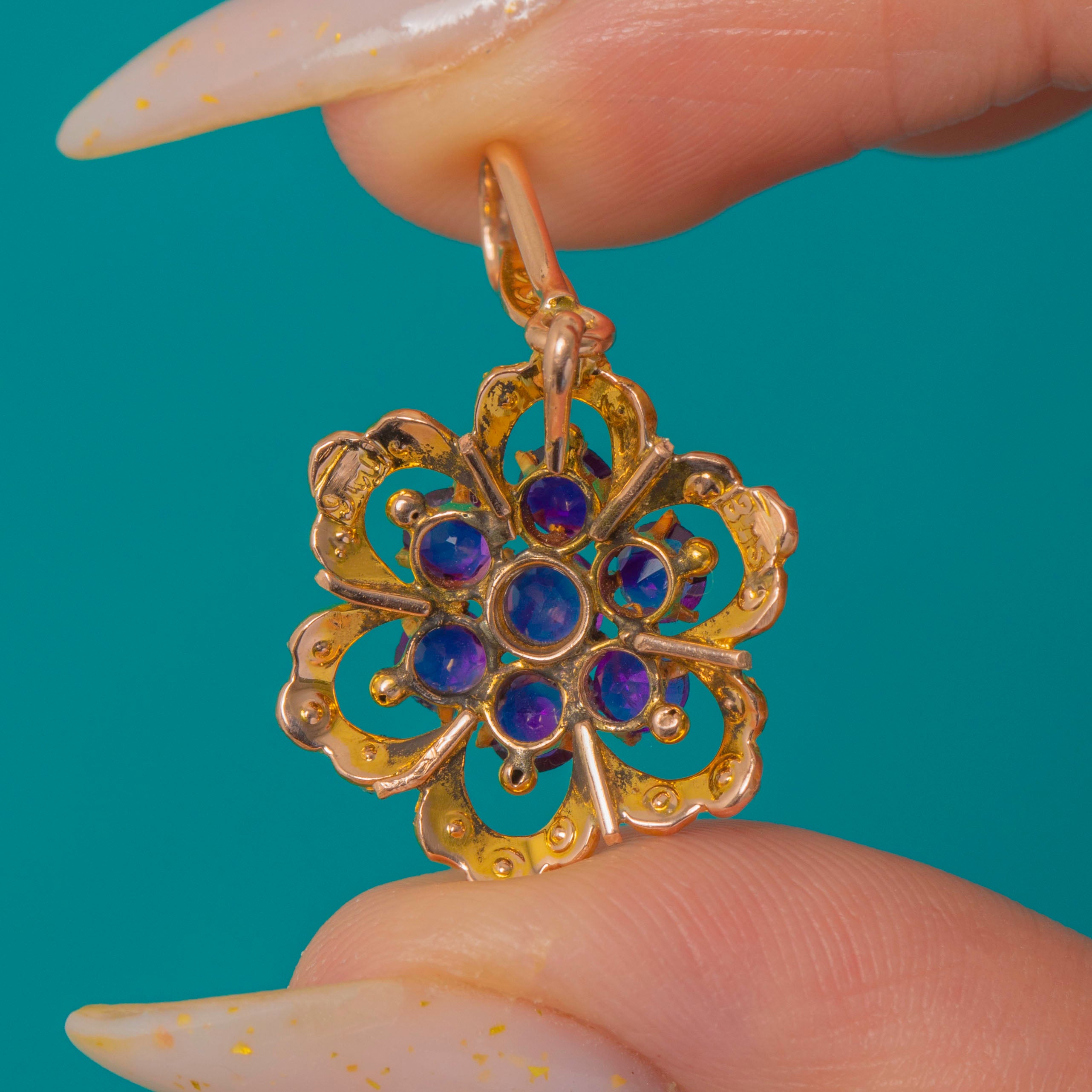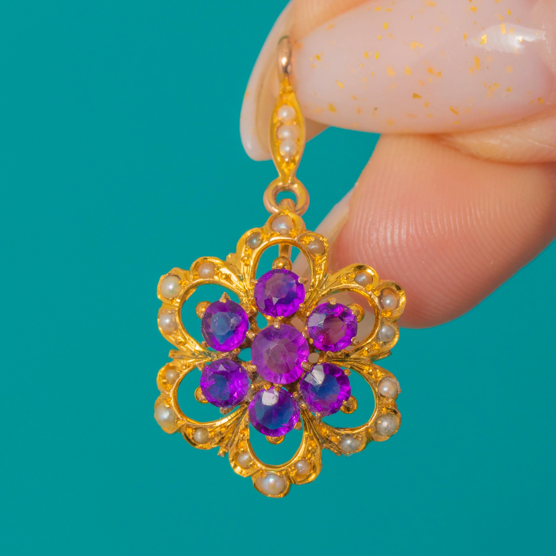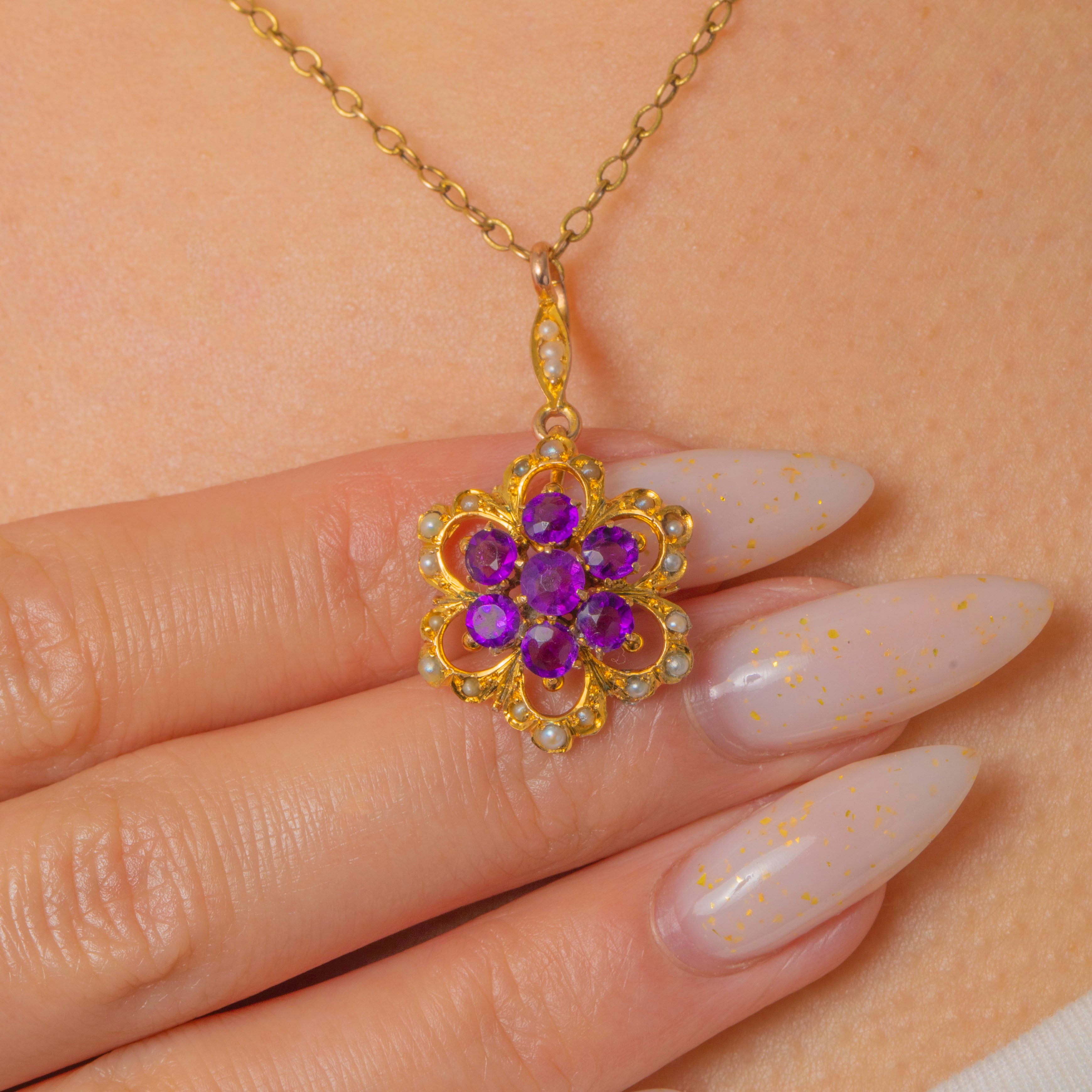 A charming Victorian flowerhead pendant in warm 9ct Gold, set with a vivid cluster of round Amethysts encircled by a delicate halo of creamy Seed Pearls. The openwork scrolls and scalloped petal loops lend a lace-like lightness, while a Pearl-dotted bail adds an elegant finishing touch.