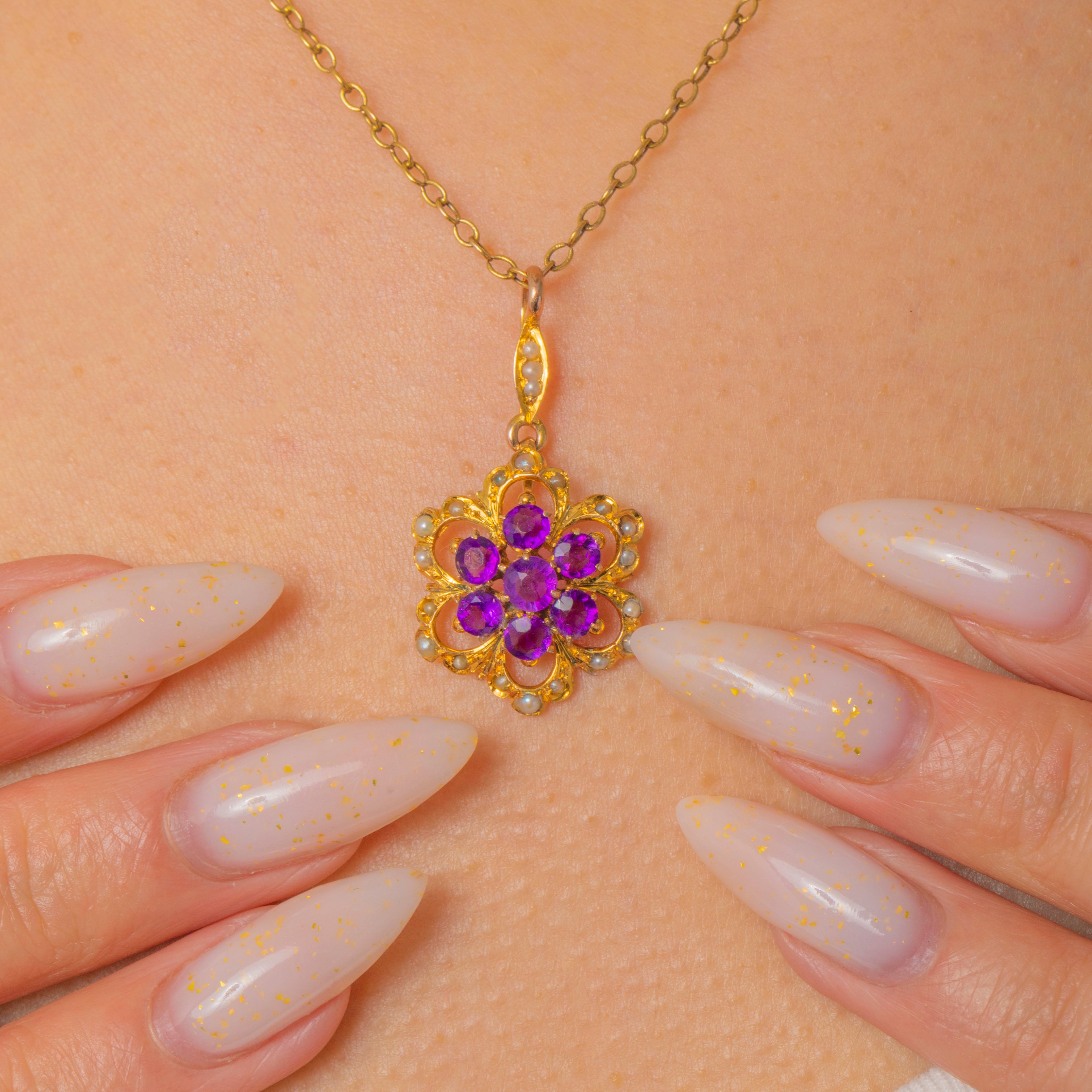 Romantic and refined, the violet Amethysts gleam beautifully against the softly lustrous Pearls, offering a timeless pop of colour. Effortless to wear on your favourite chain, this graceful piece brings antique allure to every day.