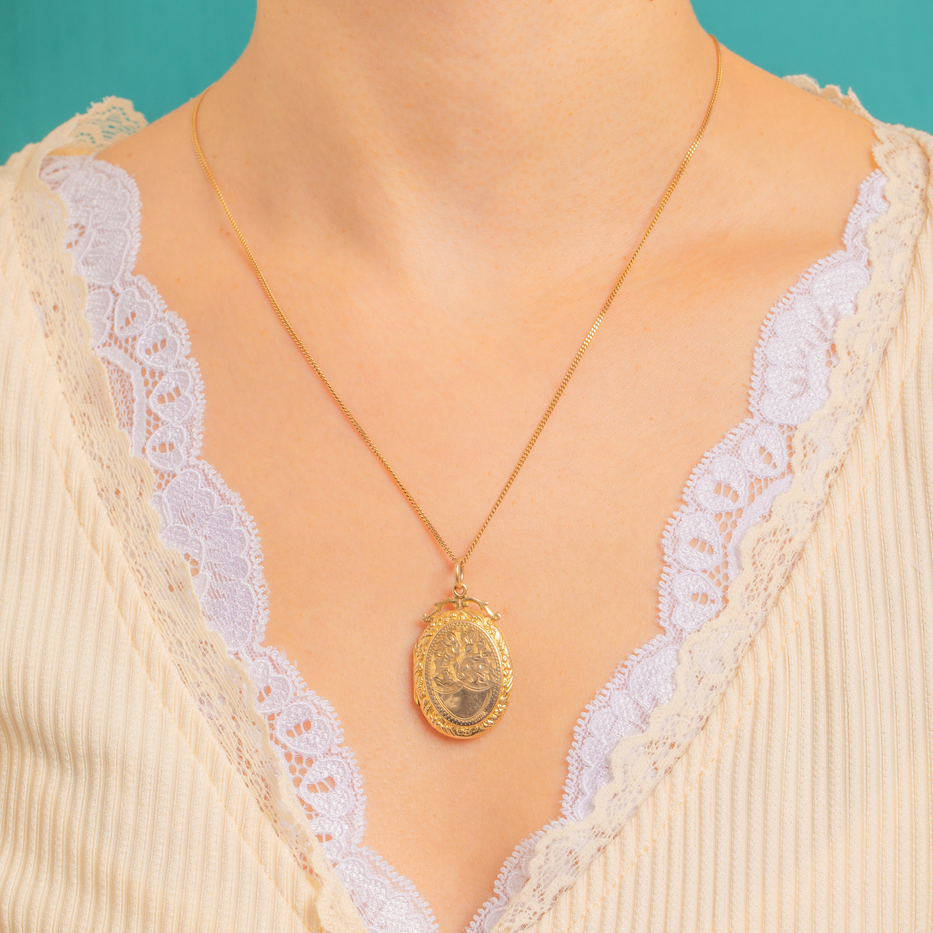 This ornate Victorian locket is a romantic keepsake in warm 9ct Gold back and front, richly detailed and framed by raised foliate and beaded ornament. The oval face is beautifully composed, with delicate scrollwork and a charming bow-like surmount to the bail that adds a softly feminine flourish.
