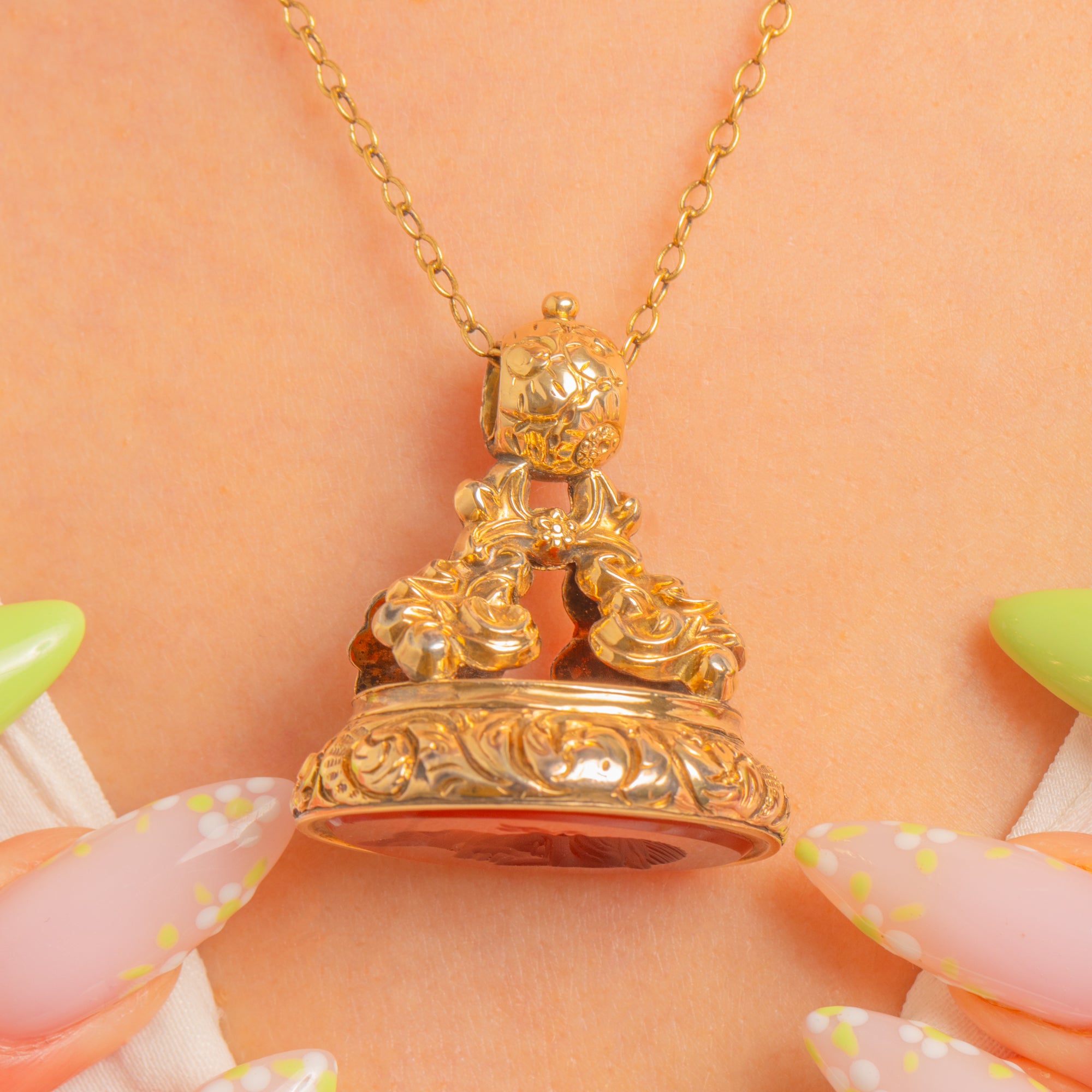 Ornate and romantic, this Victorian Carnelian wax seal fob pendant brims with sculptural detail. Rich foliate and rococo scrollwork in warm Yellow Gold casing frames a glowing red-orange Carnelian, finely carved with a clear-cut classical portrait intaglio. The deep bezel and decorative, fixed tubular bail complete its opulent silhouette.