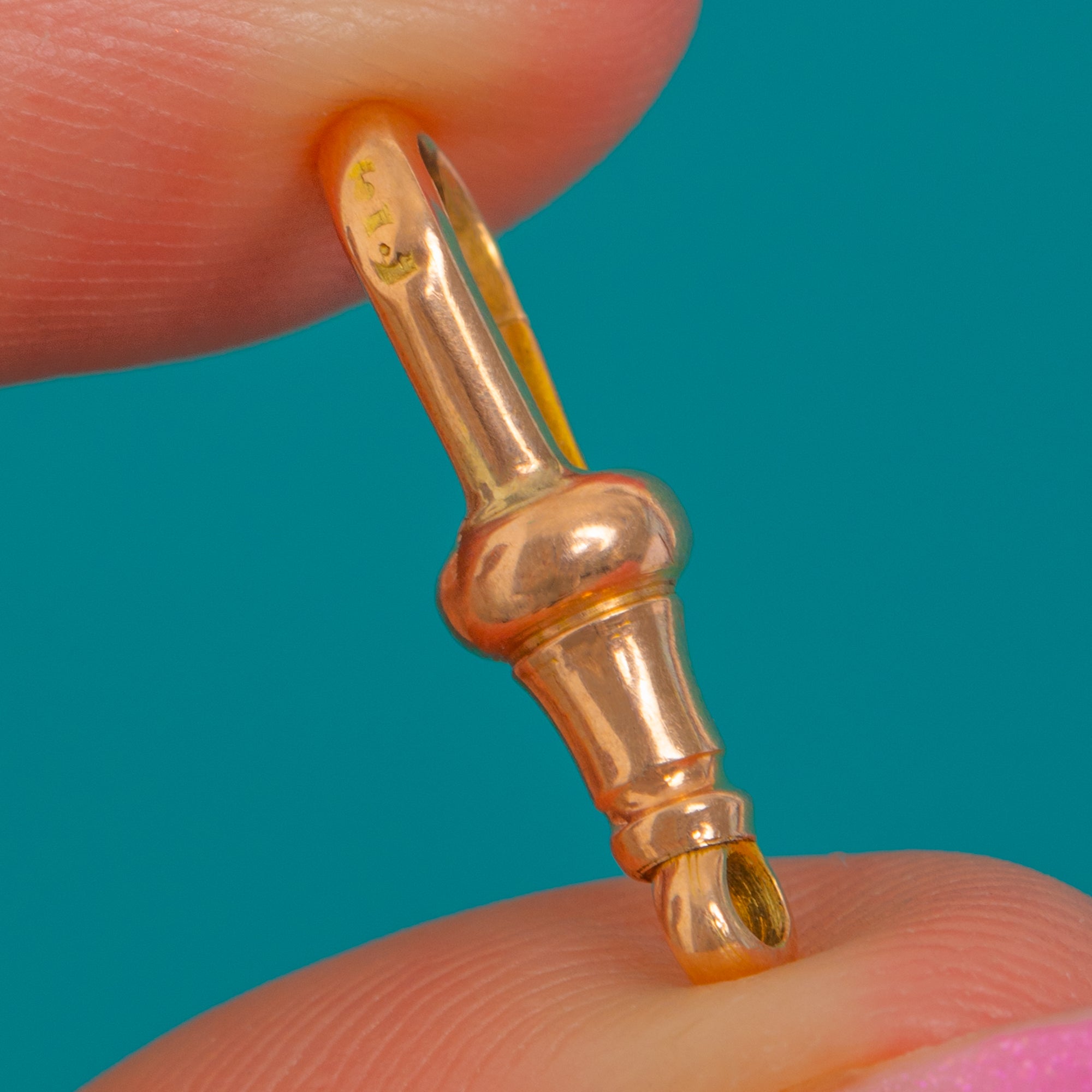 A petite Victorian 9ct Gold dog clip with a beautifully smooth, polished finish and classic baluster silhouette. Its warm, rosy hue and refined proportions make it an elegant essential—equally at home anchoring a cherished pendant or fob as it is updating a bracelet or Albert chain with a touch of antique charm.