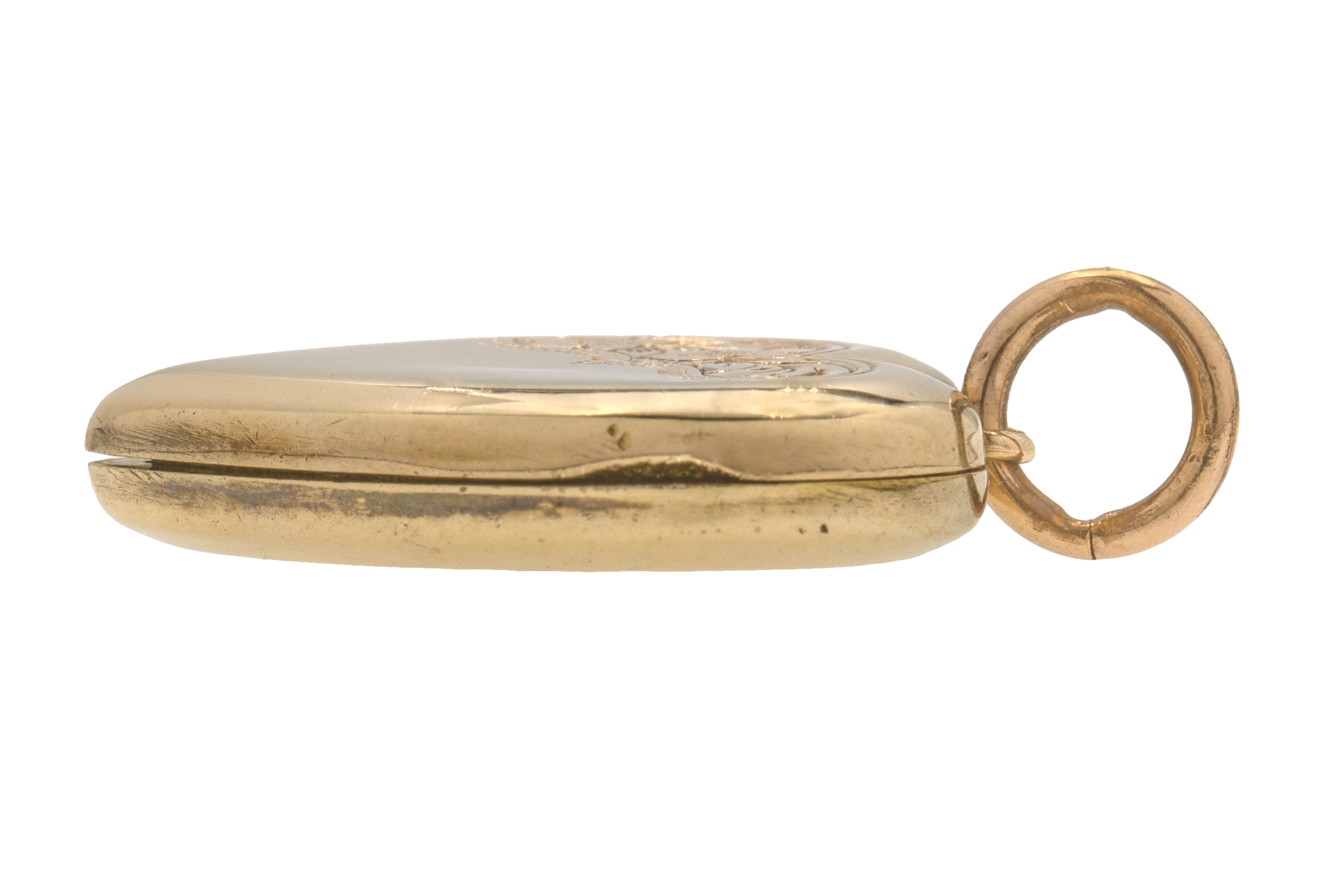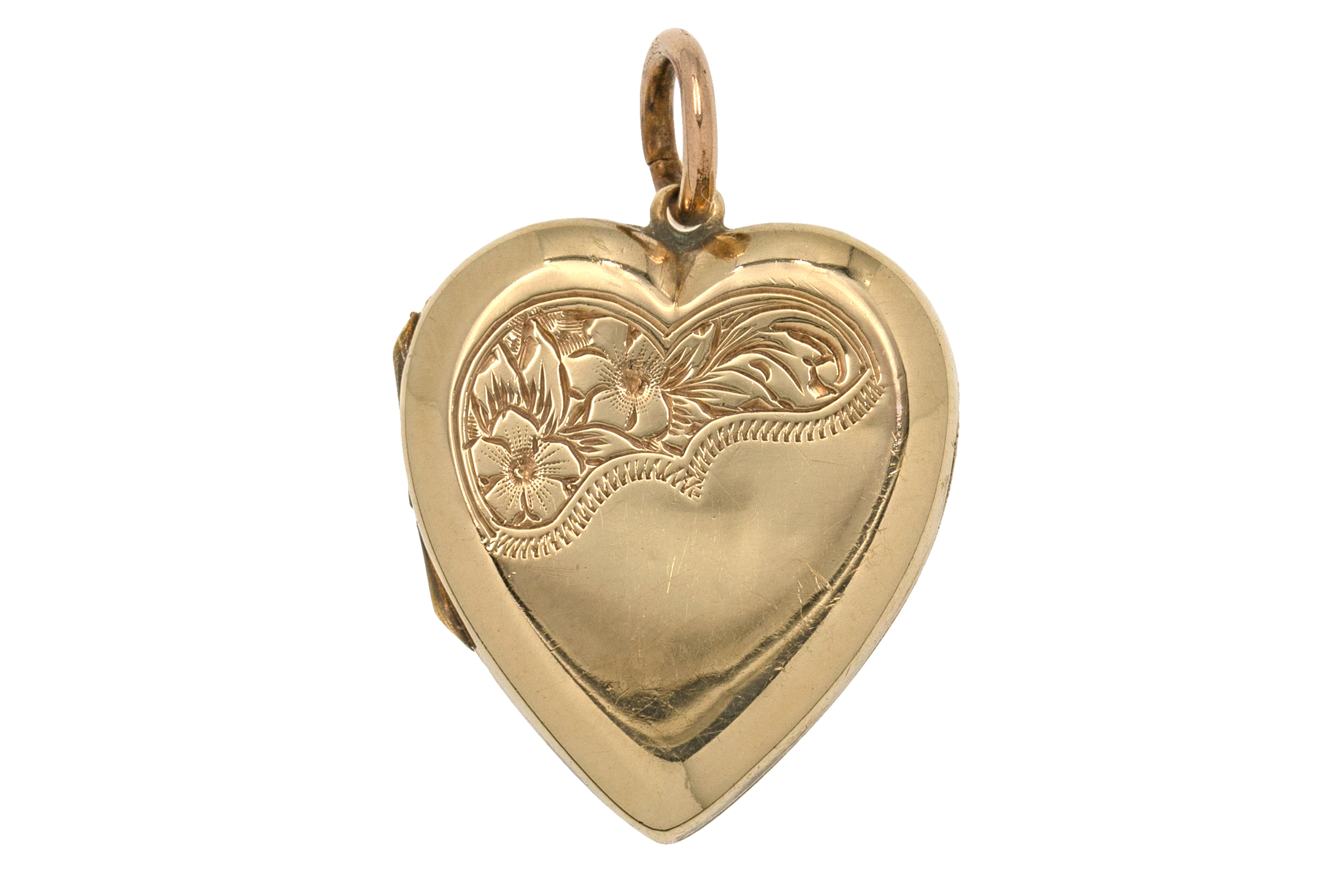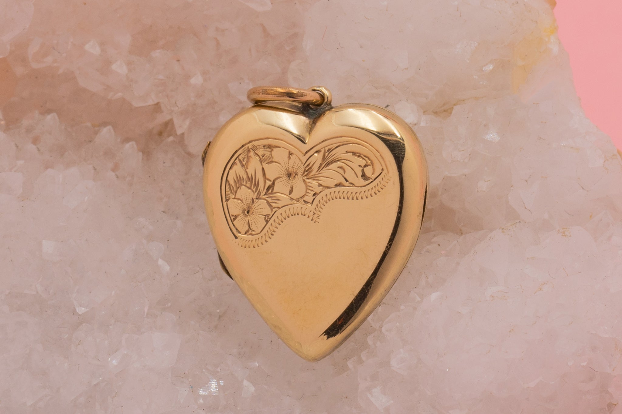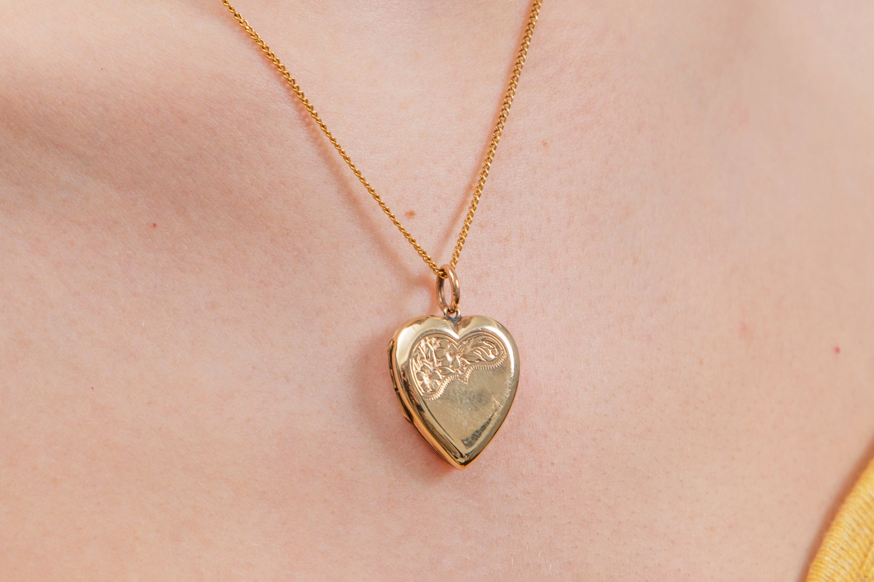 VERY GOOD. This antique 9ct Gold engraved heart locket is in very good condition overall. The Gold is buttery and the engraved details are still crisp. Her frames and surface have minor age-related wear and one frame is slightly smaller than the slot, but this takes nothing away from her charm, and can still securely hold photographs in place. Complete with a jump ring, simply suspend this sweet piece from a fone Gold chain for the ultimate antique allure!