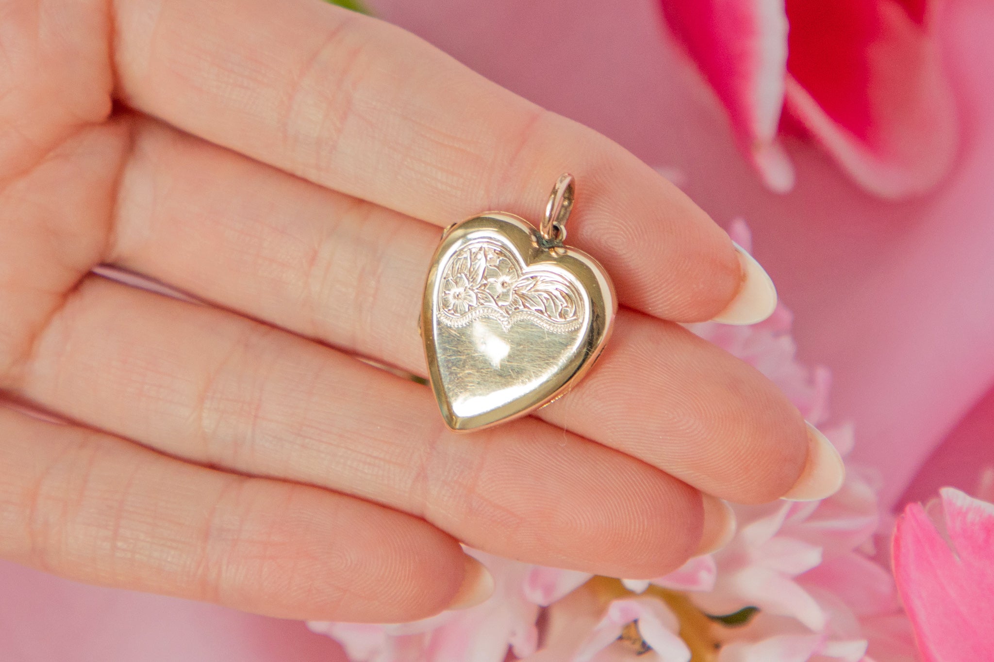 This elegant antique 9ct Gold engraved heart locket is totally charming. Boasting beautifully intricate and feminine engravings, she encloses two heart-shaped frames ready for photographs to be added and cherished.